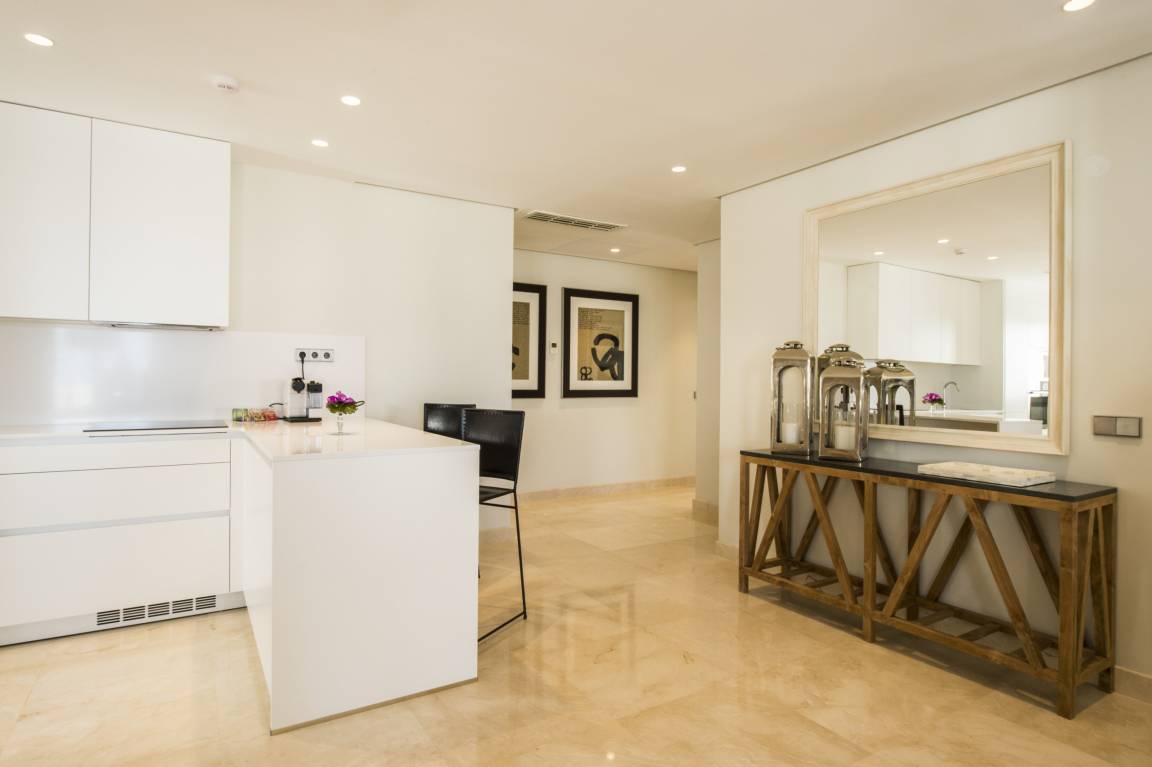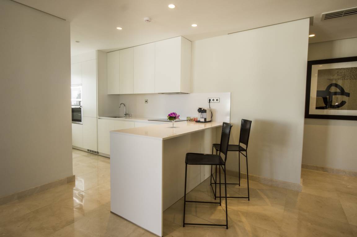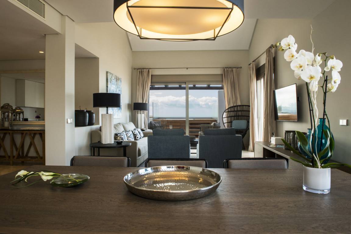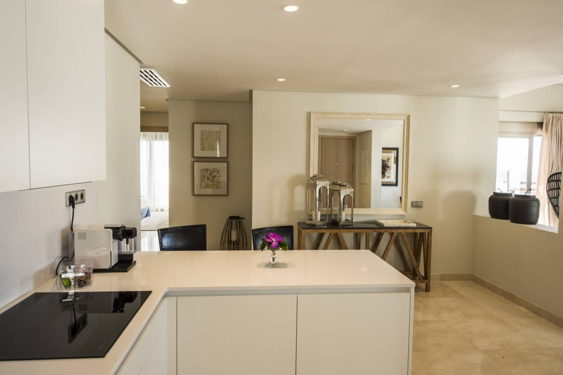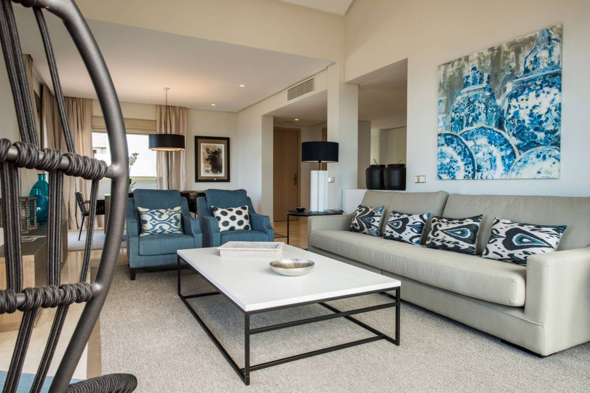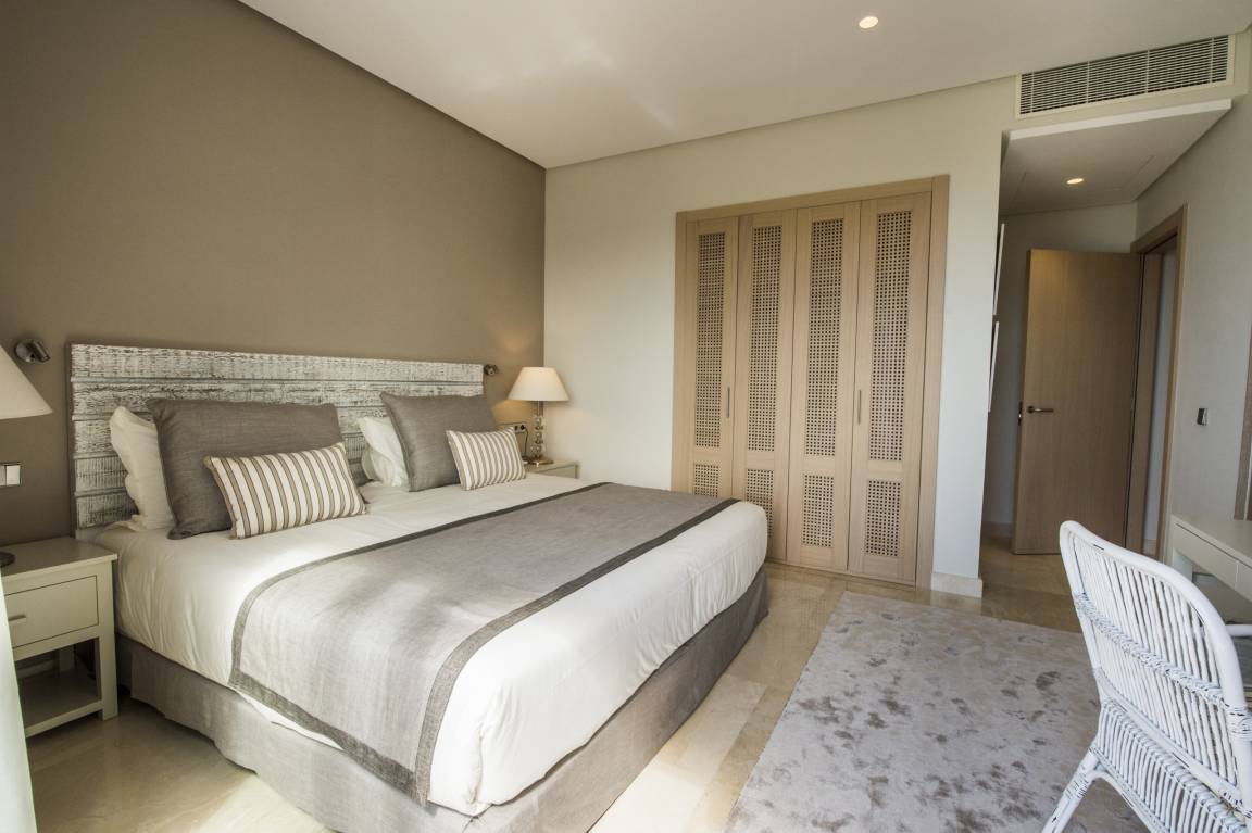 Luxurious apartment measuring 150 square metres with marble flooring and air conditioning in all the rooms. It consists of three bedrooms, one with a double bed and two with a king size bed and all with their own full en-suite bathroom and dressing area. The apartment also provides a fully equipped, high-end kitchen and a large lounge-dining room with comfortable sofas, views of the golf course and a jacuzzi.