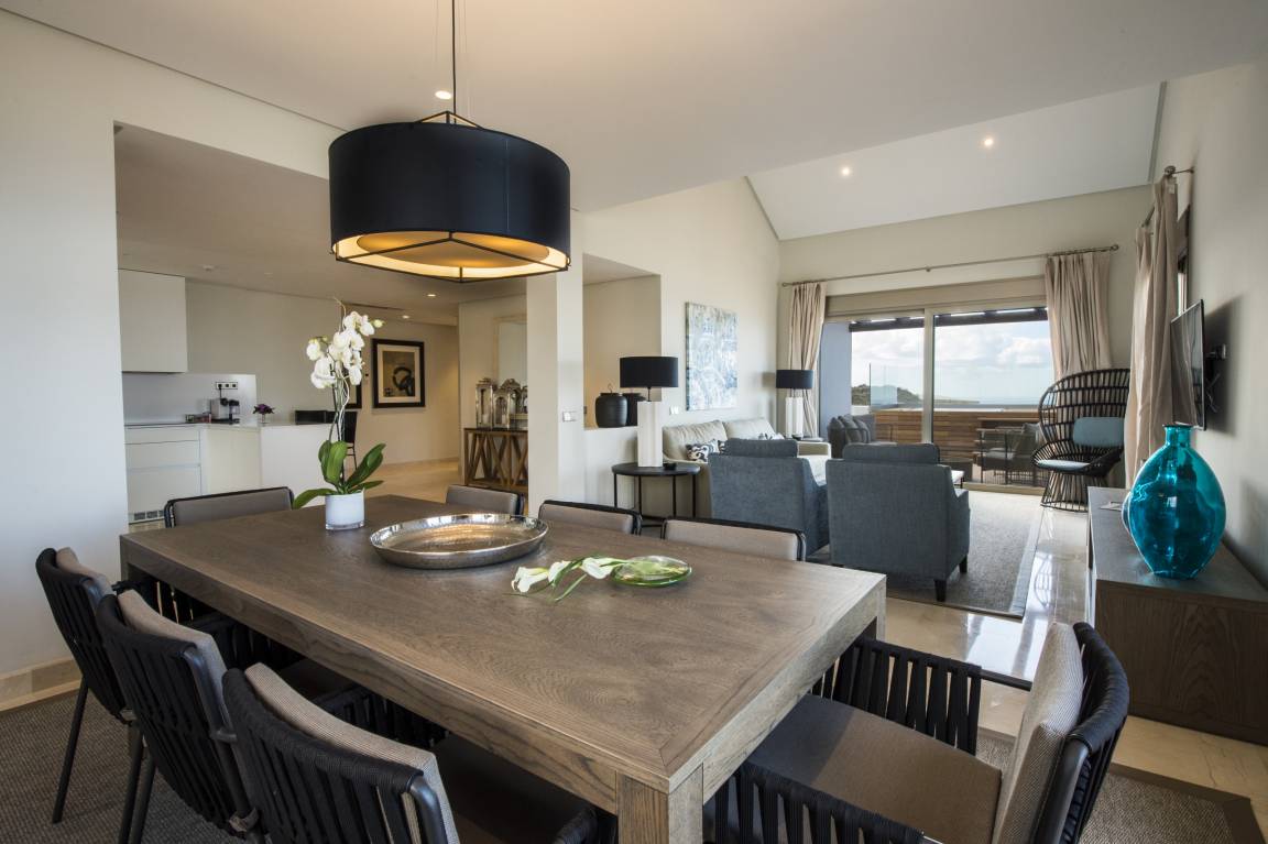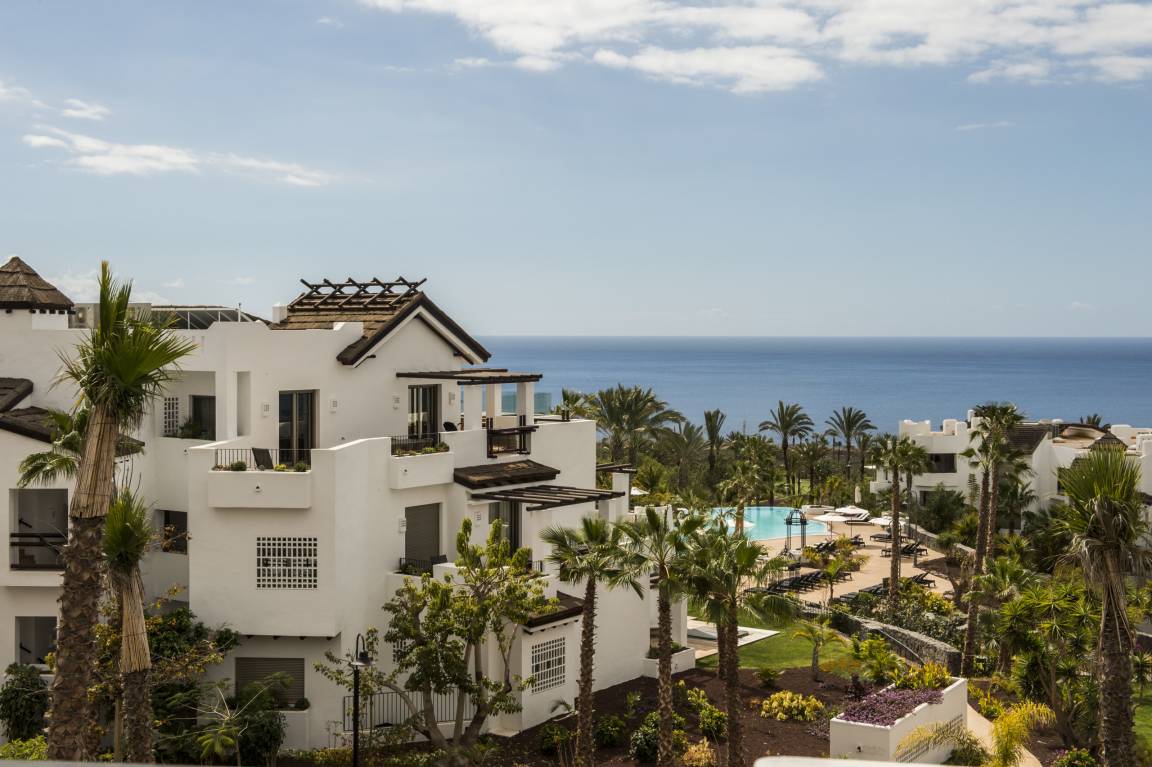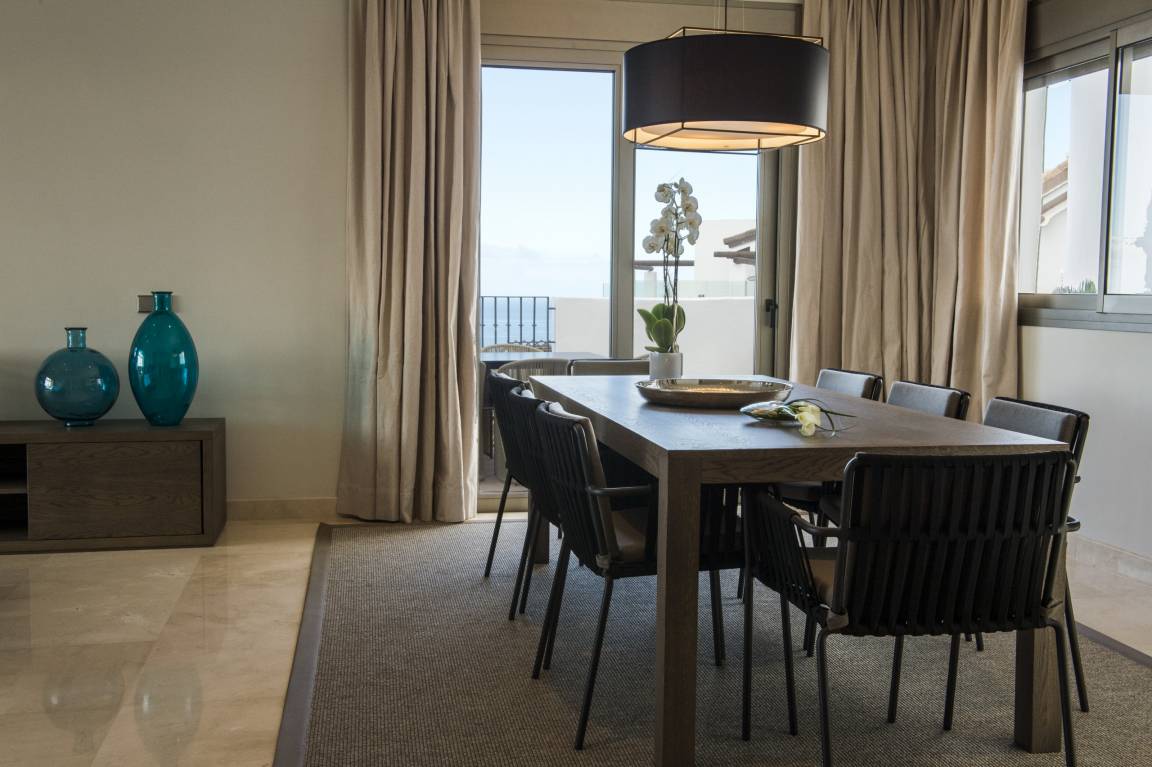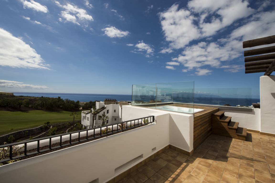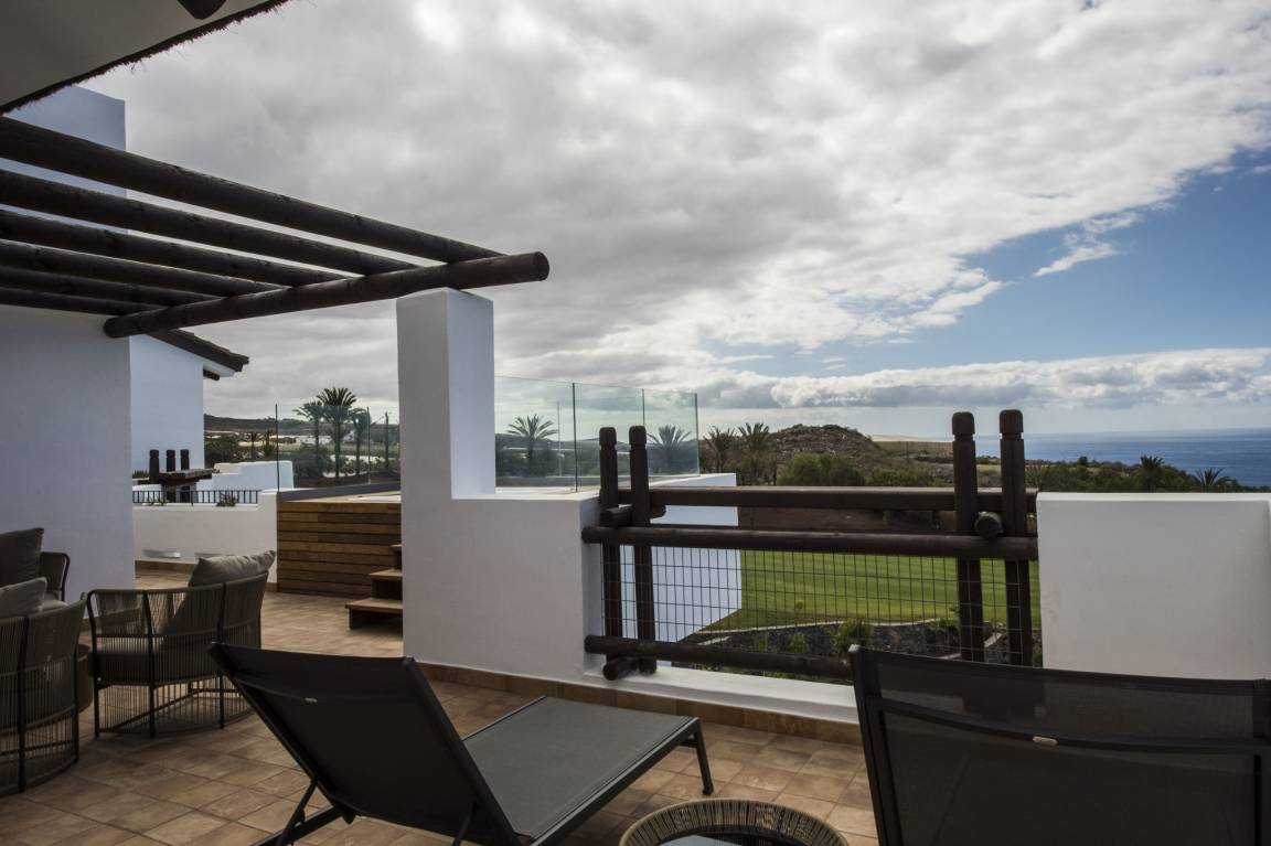 Luxurious apartment measuring 150 square metres with marble flooring and air conditioning in all the rooms. It consists of three bedrooms, one with a double bed and two with a king size bed and all with their own full en-suite bathroom and dressing area. The apartment also provides a fully equipped, high-end kitchen and a large lounge-dining room with comfortable sofas, views of the golf course and a jacuzzi.