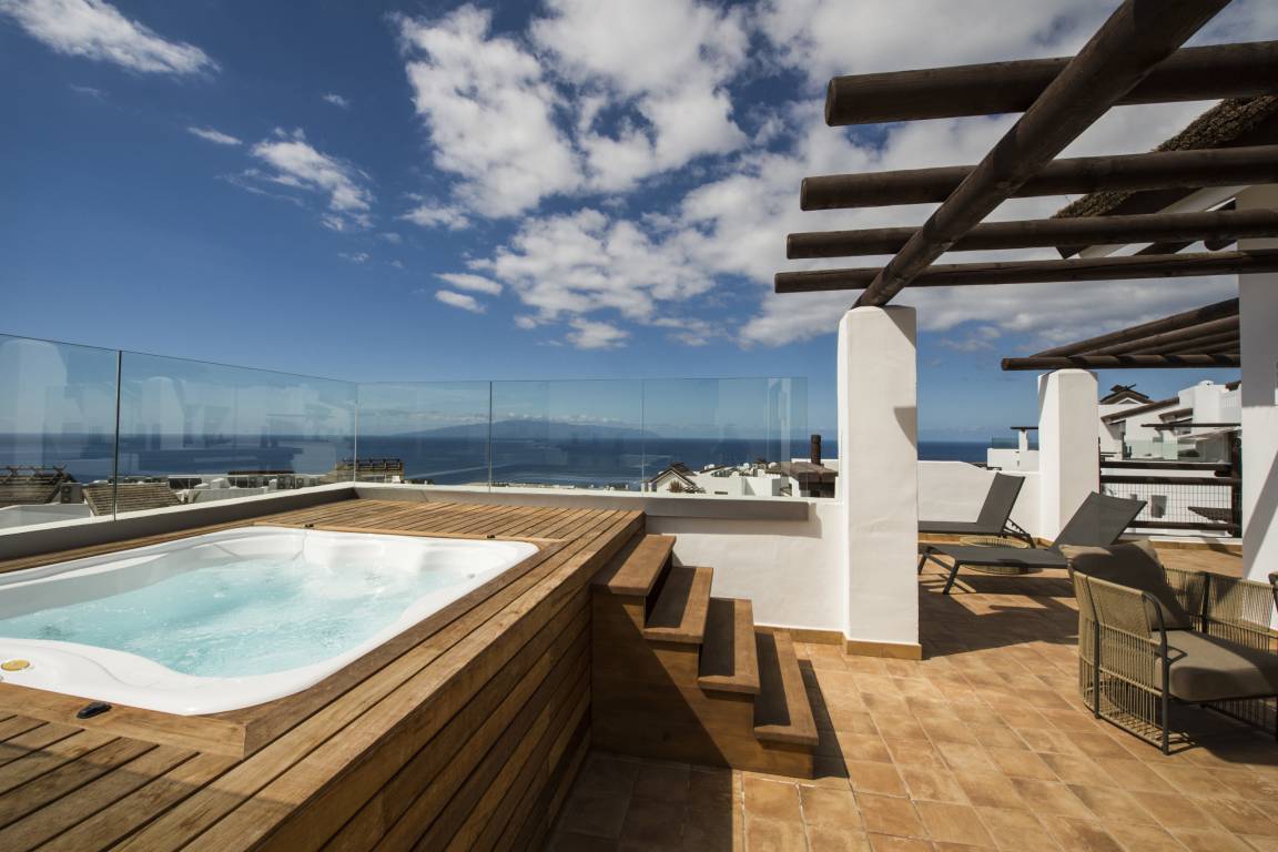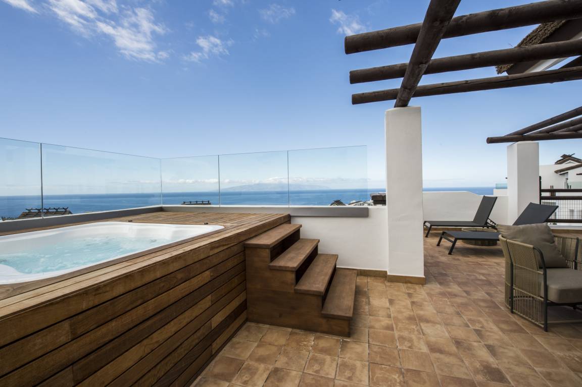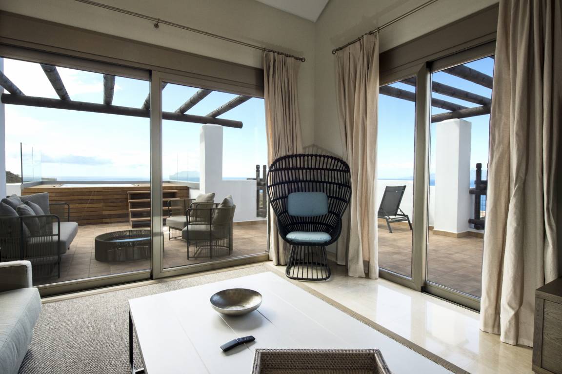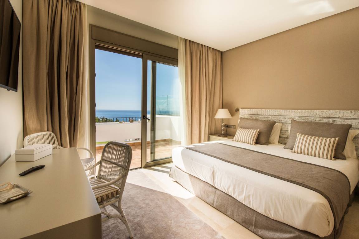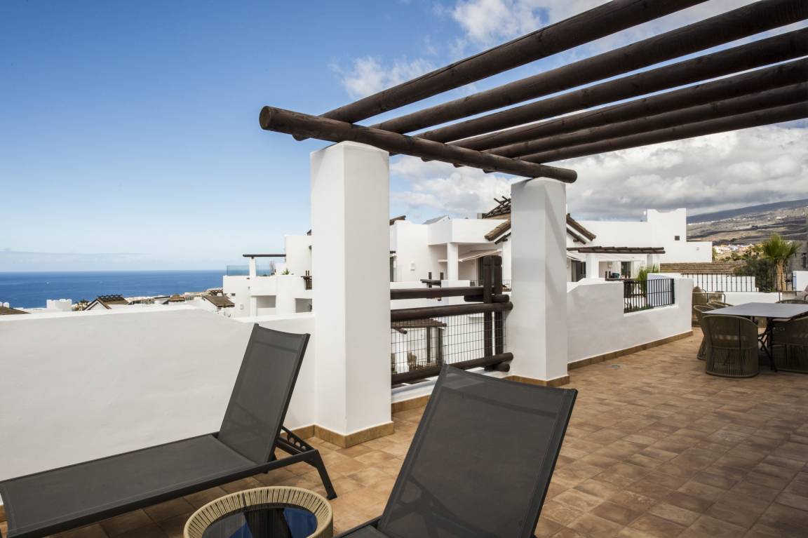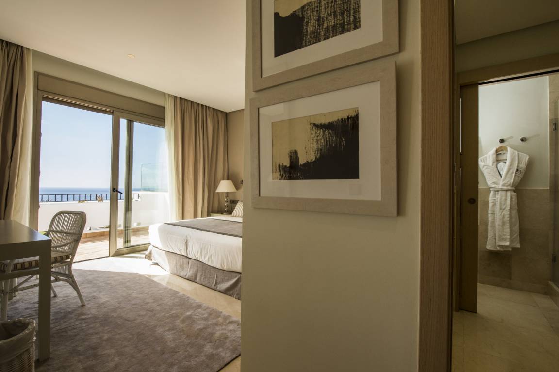 Luxurious apartment measuring 150 square metres with marble flooring and air conditioning in all the rooms. It consists of three bedrooms, one with a double bed and two with a king size bed and all with their own full en-suite bathroom and dressing area. The apartment also provides a fully equipped, high-end kitchen and a large lounge-dining room with comfortable sofas, views of the golf course and a jacuzzi.