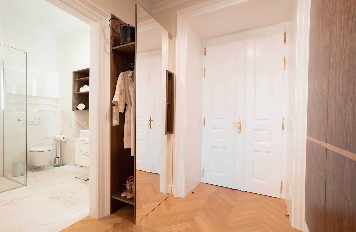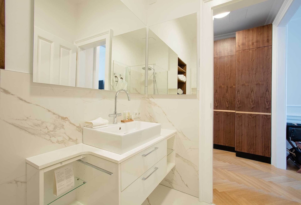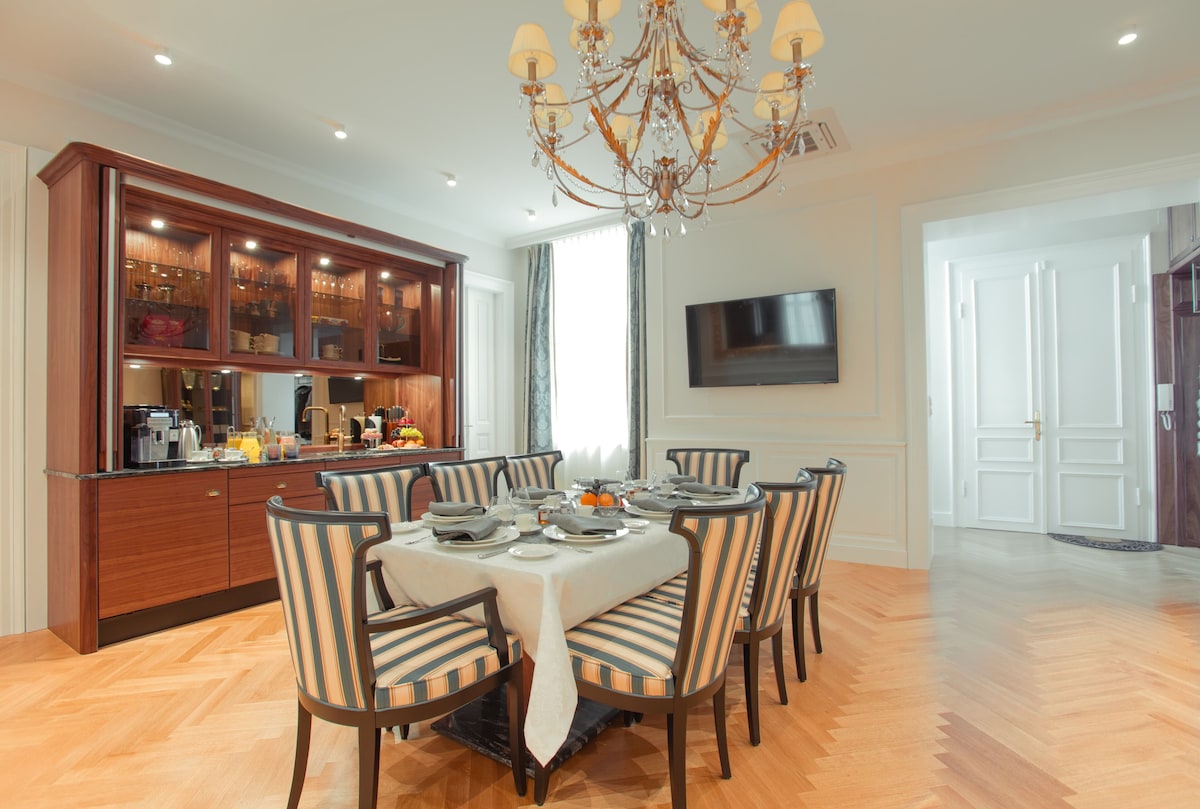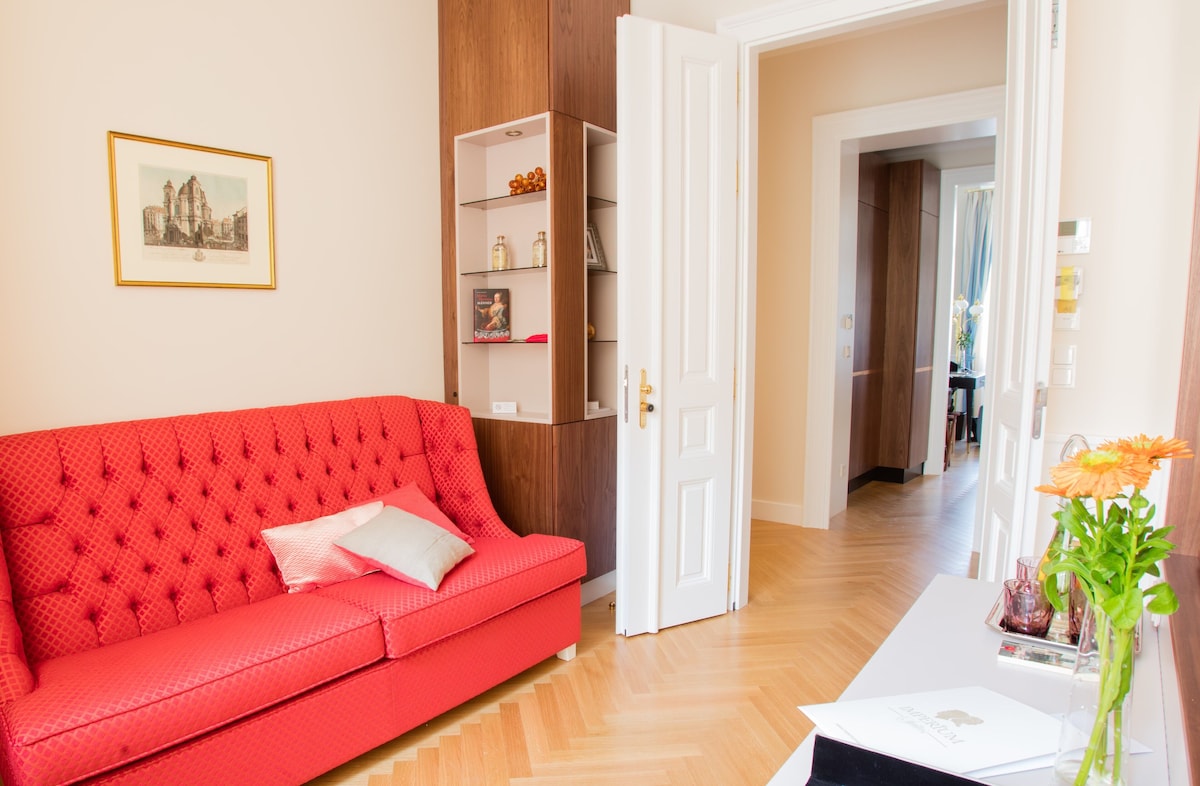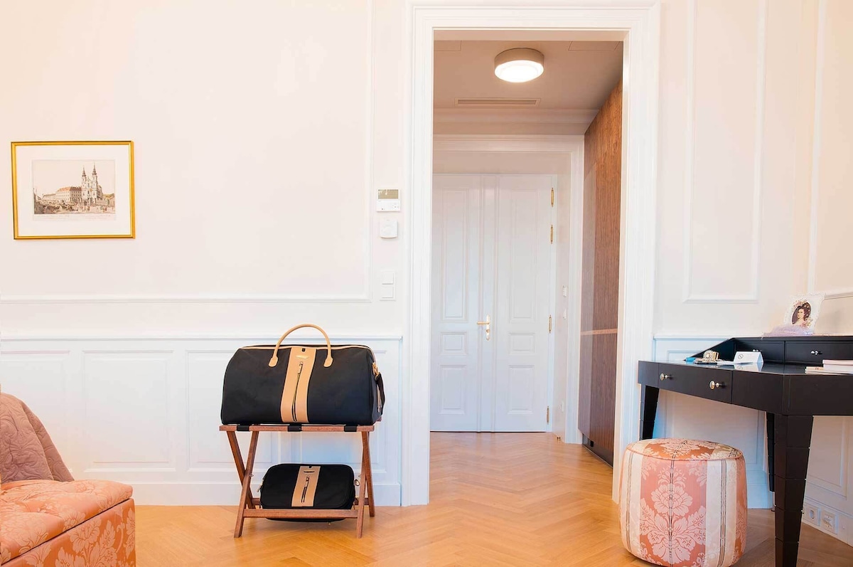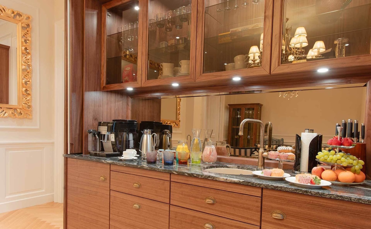 This brand new luxury town house property is like nothing that exists in Vienna. We offer the privacy and intimate environment of your own private accommodation at the same time the luxury, comfort, services of a luxury 5 star hotel. Best part, you can choose the services as per your requirements. To provide a perfectly private environment, the whole place will be reserved for you during your stay. The location and view of the Imperium Residence is incomparable, located in the heart of Vienna at the historic Neuer Markt and in a building originally owned by the aristocratic Schwarzenberg family. Prince Schwarzenberg was born in the same building in the year 1771. The location of the Imperium Residence is a land mark in itself. The Imperium Residence has 4 luxury hotel style rooms with a capacity of up to 10 guests, the rooms are designed individually by some of the best designers in Vienna and themed according to the Austrian Aristocracy – Room Princess Sissi, Room King Franz Josef I., Room Schwarzenberg and Room Maria Theresia. The common area serves as a dining/living room for the group with hand crafted breakfast saloon and furniture. All furniture and fittings are prepared specifically for each room, none of them are purchased ready made, great detail has been taken to prepare each piece in rich details and in the right proportions. While the Residence offers our guests a truly Viennese experience in terms of design and style both inside and out, the suite is equipped with extremely modern and high-end fittings from heated flooring, highly sophisticated security systems, card and code access to rooms and entire property, alarm systems, free high-speed internet, high-end kitchenette and laundry possibility (washing machine and dryer, we also provide laundry service to our guests).