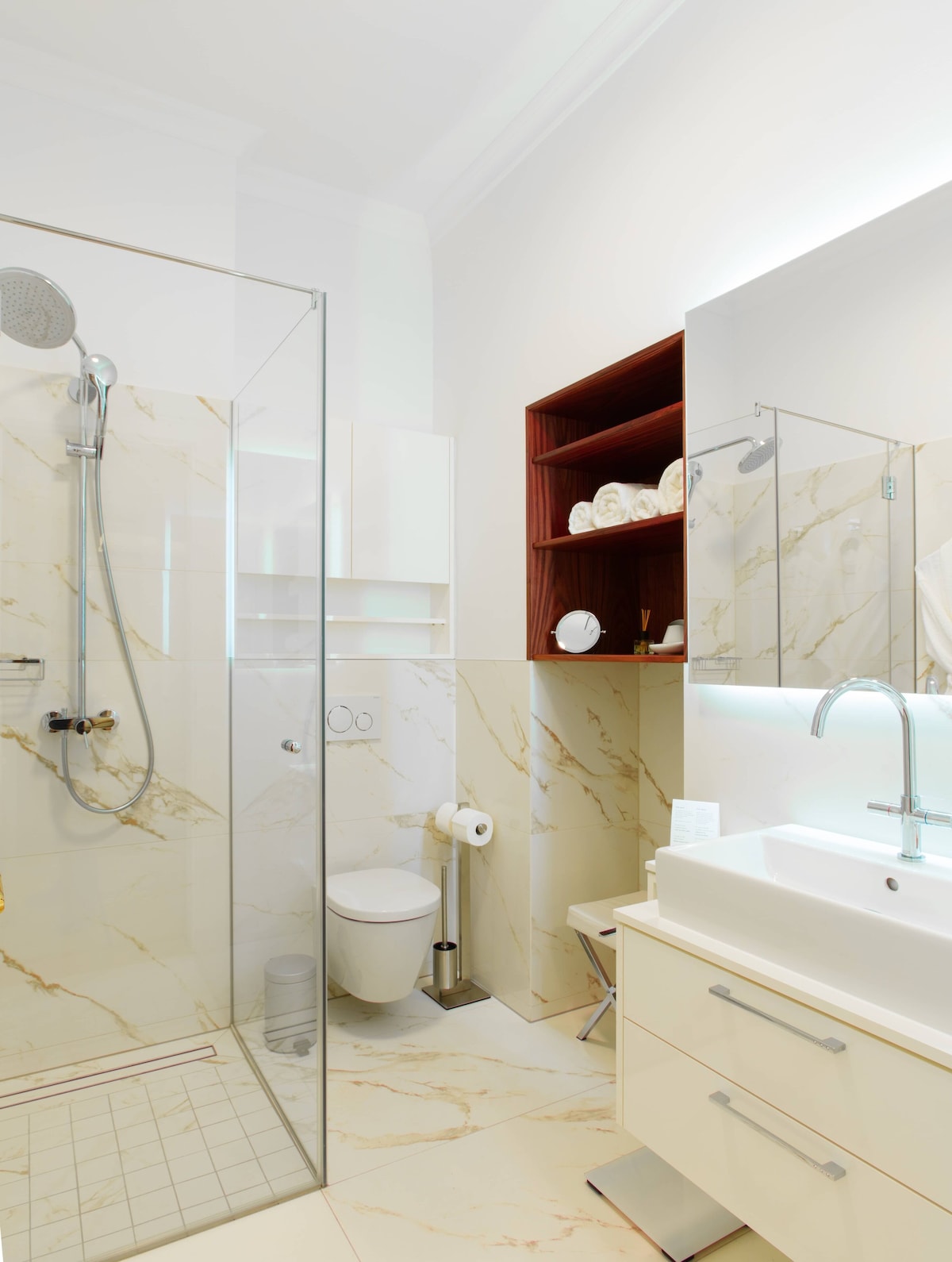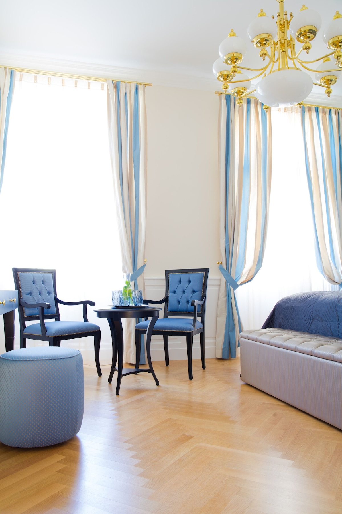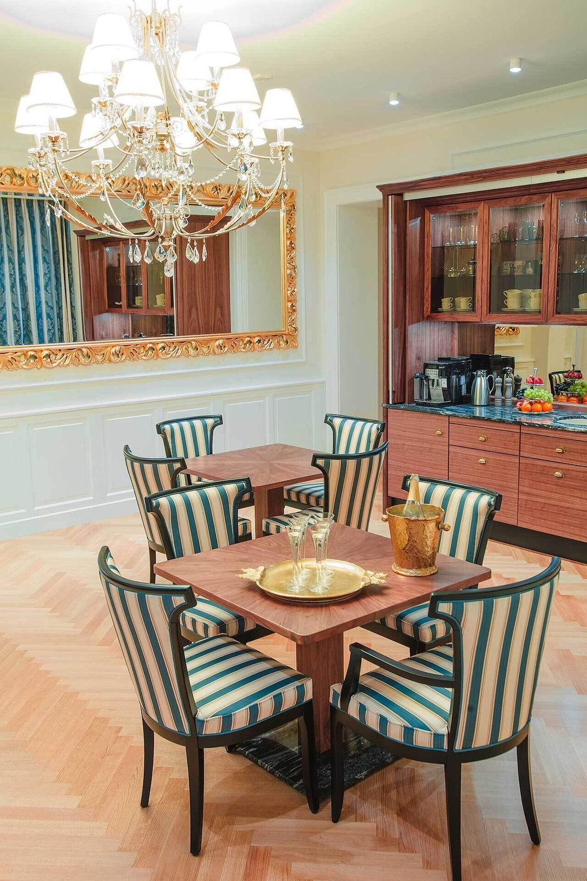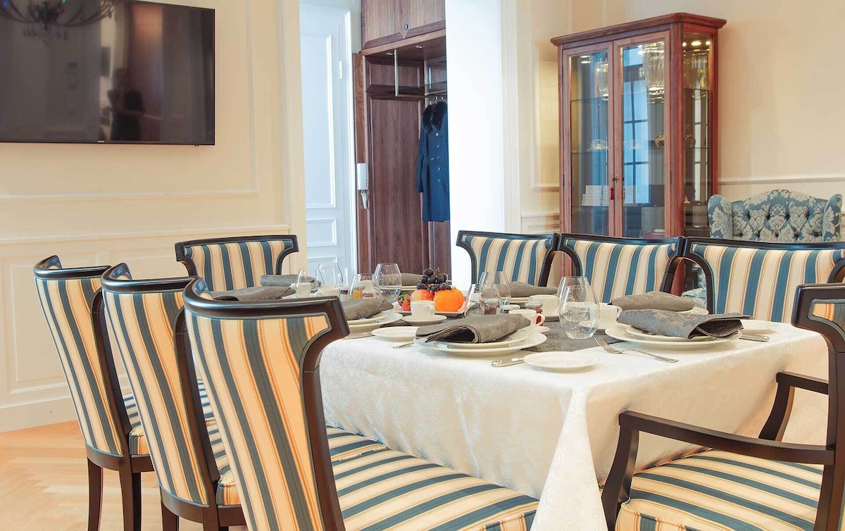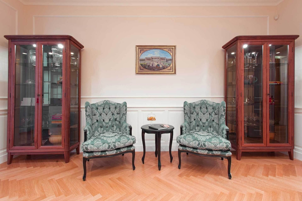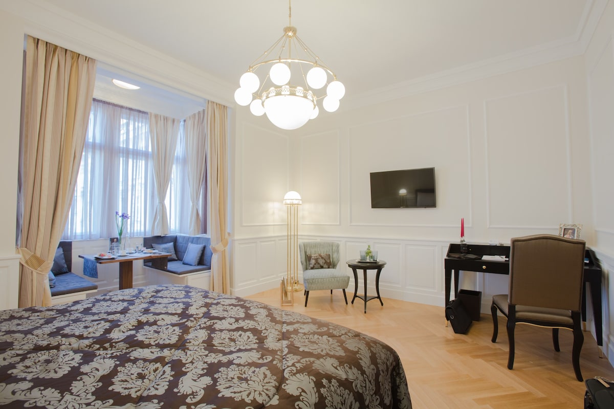 This brand new luxury town house property is like nothing that exists in Vienna. We offer the privacy and intimate environment of your own private accommodation at the same time the luxury, comfort, services of a luxury 5 star hotel. Best part, you can choose the services as per your requirements. To provide a perfectly private environment, the whole place will be reserved for you during your stay. The location and view of the Imperium Residence is incomparable, located in the heart of Vienna at the historic Neuer Markt and in a building originally owned by the aristocratic Schwarzenberg family. Prince Schwarzenberg was born in the same building in the year 1771. The location of the Imperium Residence is a land mark in itself. The Imperium Residence has 4 luxury hotel style rooms with a capacity of up to 10 guests, the rooms are designed individually by some of the best designers in Vienna and themed according to the Austrian Aristocracy – Room Princess Sissi, Room King Franz Josef I., Room Schwarzenberg and Room Maria Theresia. The common area serves as a dining/living room for the group with hand crafted breakfast saloon and furniture. All furniture and fittings are prepared specifically for each room, none of them are purchased ready made, great detail has been taken to prepare each piece in rich details and in the right proportions. While the Residence offers our guests a truly Viennese experience in terms of design and style both inside and out, the suite is equipped with extremely modern and high-end fittings from heated flooring, highly sophisticated security systems, card and code access to rooms and entire property, alarm systems, free high-speed internet, high-end kitchenette and laundry possibility (washing machine and dryer, we also provide laundry service to our guests).