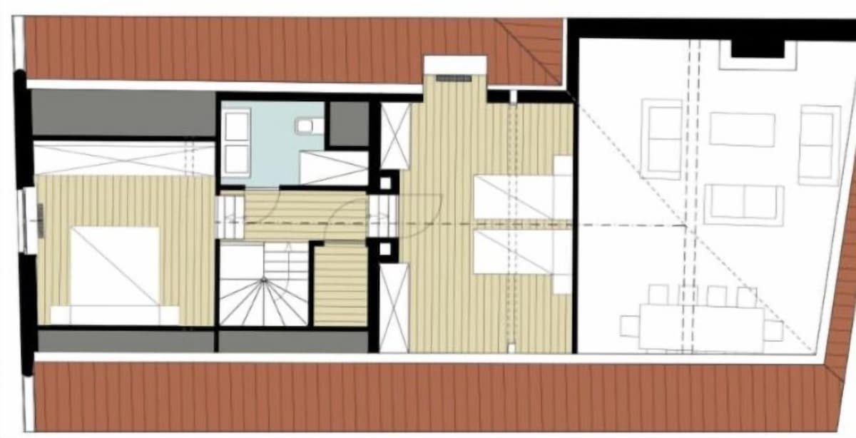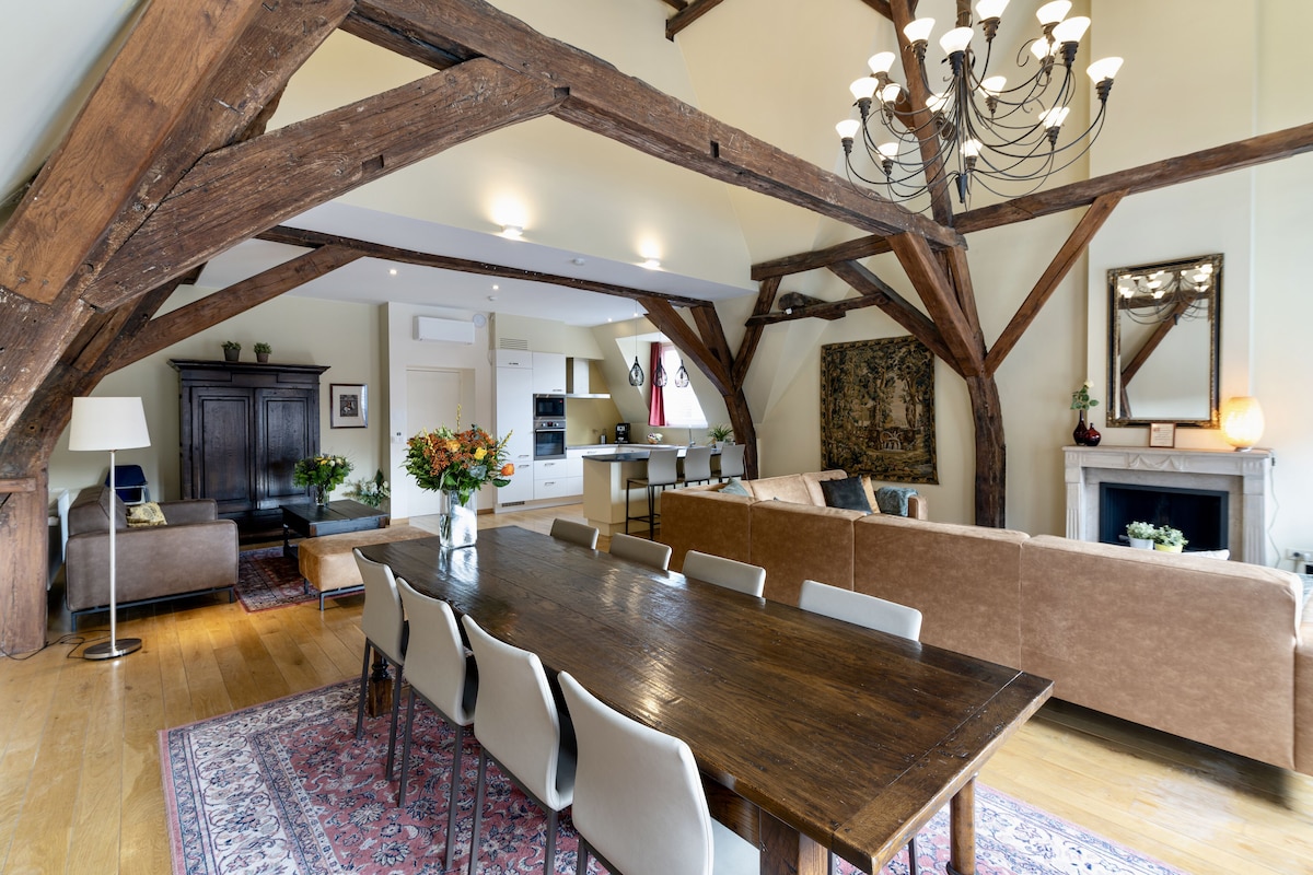 The apartment is located on the 2nd floor at Twijnstraat 13. This huge apartment still shows the traces of a rich past. The 650-year-old roof construction and the construction of the trusses result in a remarkable 7-meter high living room with dining and sitting areas (2) and an open kitchen. In this stylish, charming apartment with a fireplace (unfortunately out of service due to fire regulations), everyone feels like a king here!