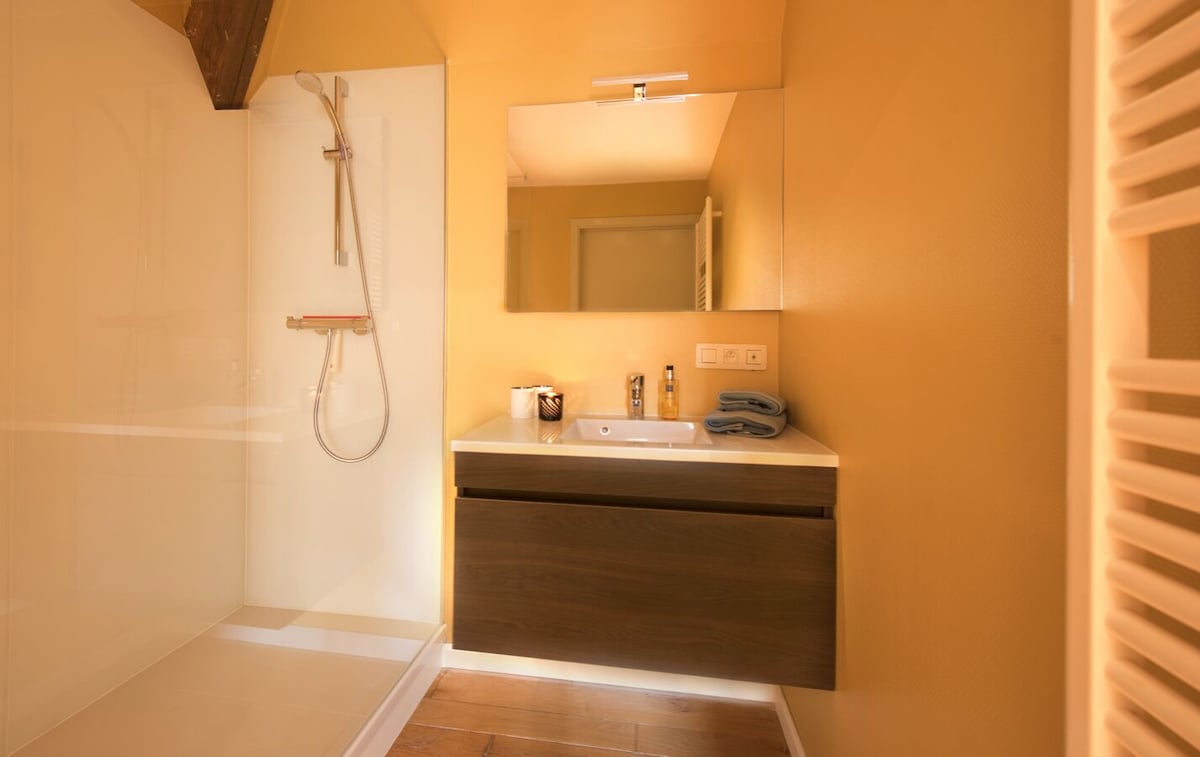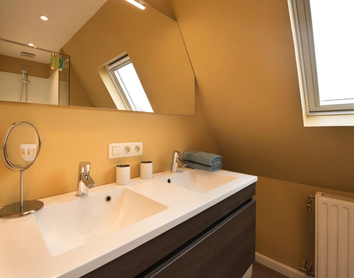 The apartment is a duplex apartment and has 4 bedrooms (2 on the ground floor and 2 on the first floor, each with a 1 queen-size bed and 2 single beds) and 2 bathrooms with a walk-in shower, equally divided over the two floors.