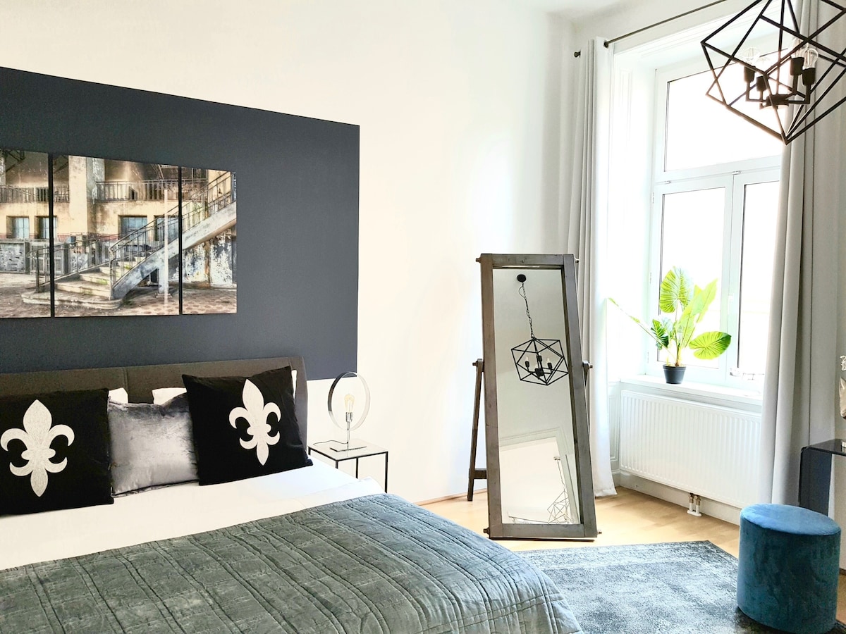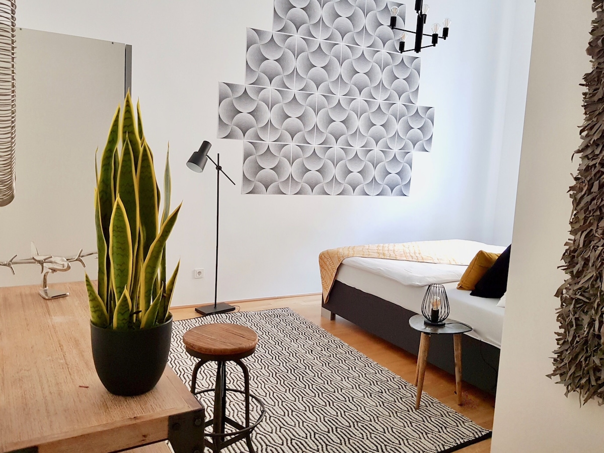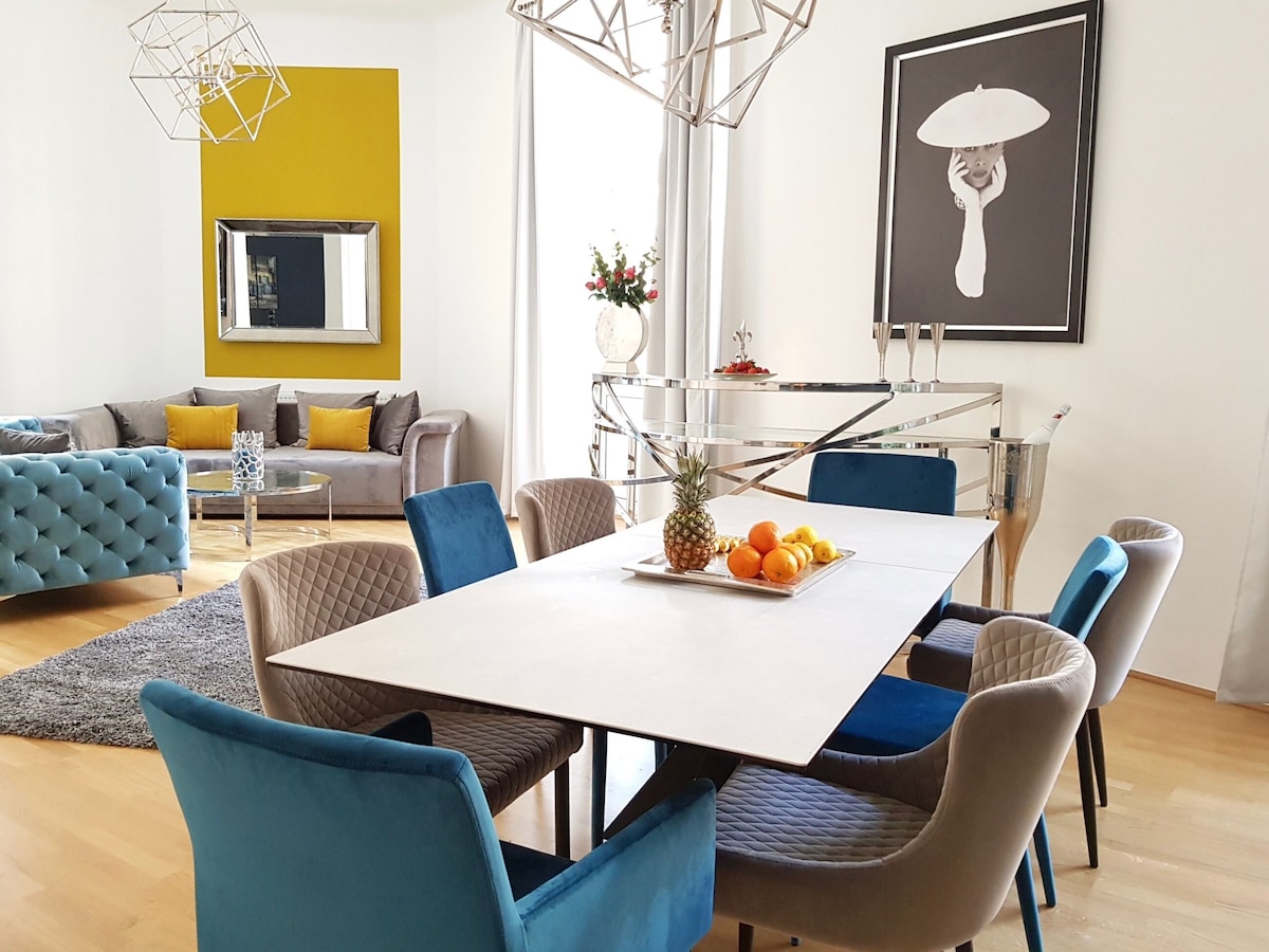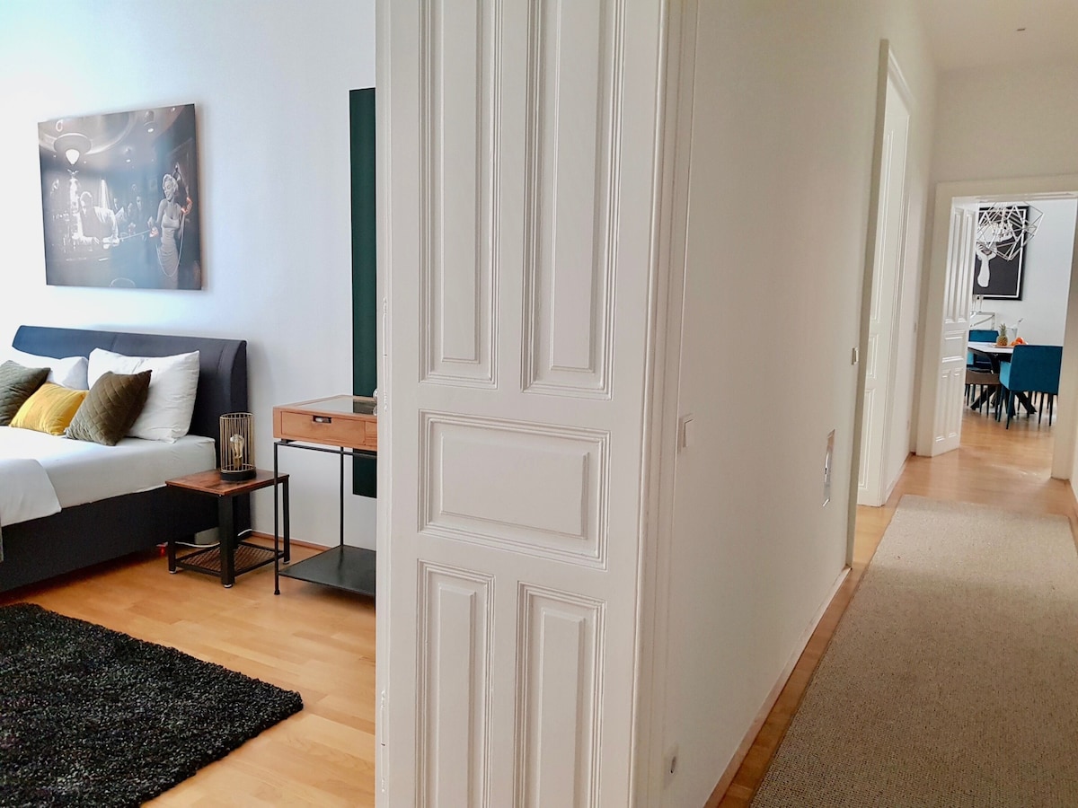 This new design apartment for 10 people is located in the well-known Mariahilferstr. and is therefore within walking distance to almost all sights of the city. The high ceilings of the old Viennese townhouses and the special taste of the designer makes you feel right when entering the apartment in the middle of the Viennese life. The 4 cozy bedrooms, 2 bathrooms, 1 extra toilet and the living-dining area and large kitchen offer plenty of space for nice days together.