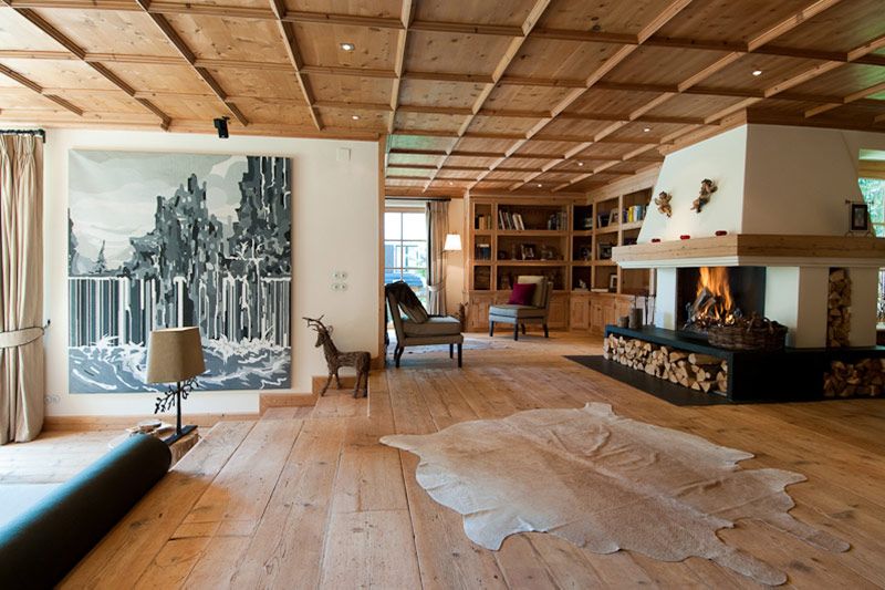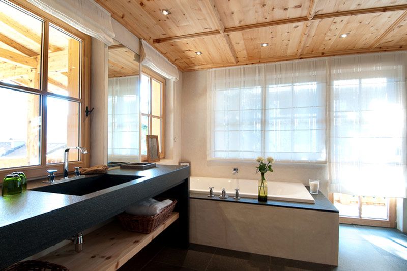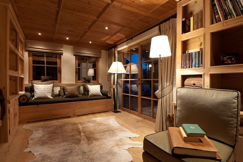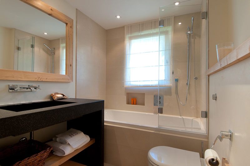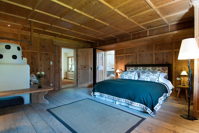 An old Tyrolean “zirben-stube” has been converted into one of the other twin/double bedrooms, and still has the antique carvings as well as a functioning traditional stove. This bedroom has an en-suite bathroom. There is a further twin/double and a quad bunk room; one with a private bathroom and one with a private shower room. All of the bathrooms are finished to the highest standard, either in limestone and oak or black stone and grey tadellakt. The floors throughout the chalet along with the library and doors have been restored out of 300-year-old oak planks.