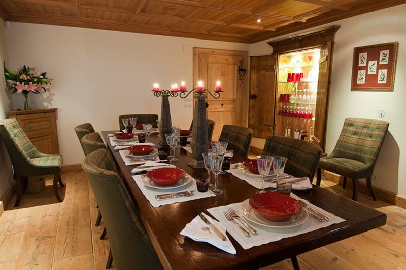You enter the chalet into the main living floor. Here you find the grand drawing room and open plan living and dining area with sunken sitting room. Floor to ceiling French windows open out onto the south west-facing terrace. The large open fire place and warm, rich fabrics create the perfect atmosphere in which to relax and unwind or entertain after a day on the slopes. This room, as well as many others throughout the chalet, maximises on stunning views of the surrounding mountains.