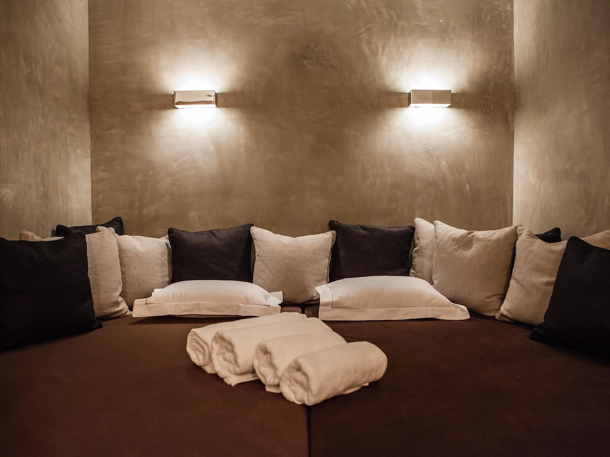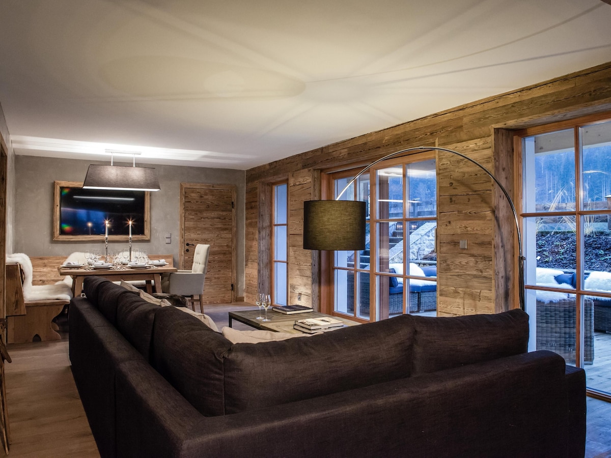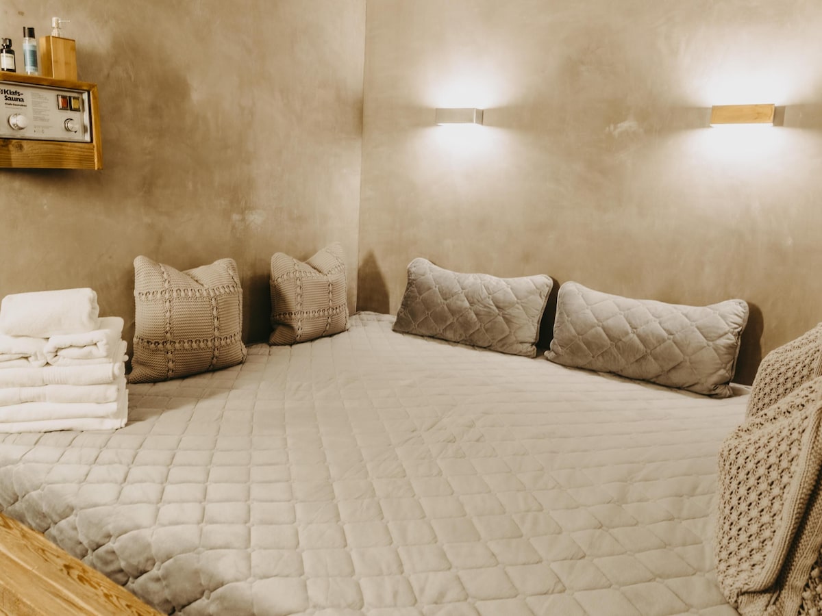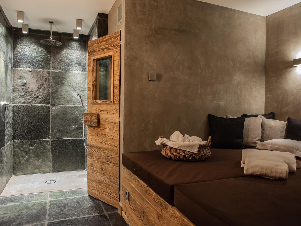 Basement: (open kitchen(radio, electric kettle, toaster, cooker, coffee machine, oven, dishwasher, fridge, fridge-freezer, Food processor, wine cooler), Living/diningroom(TV, dining table, seating area), bedroom(double bed, TV), bedroom(double bed, TV), bathroom(bathtub with shower, washbasin, toilet), bathroom(TV, shower), sauna(double bed), whirlpool, terrace)