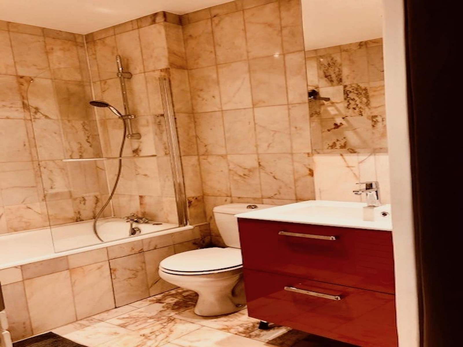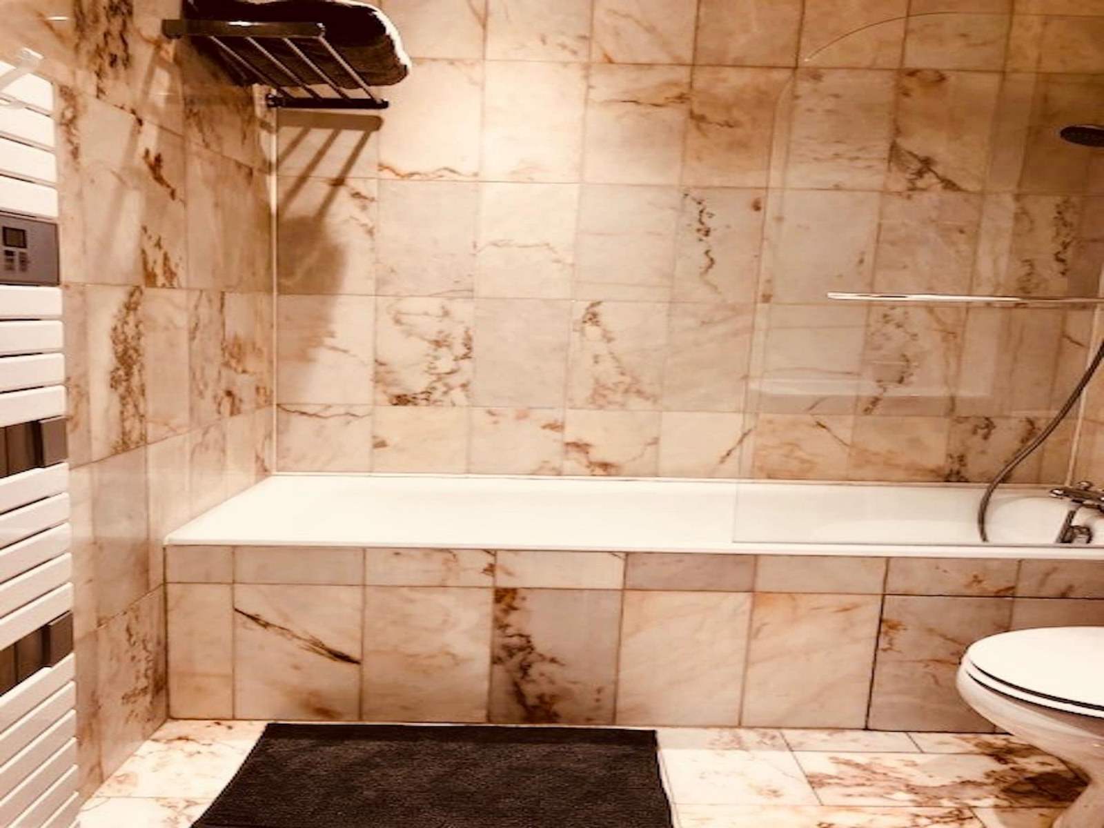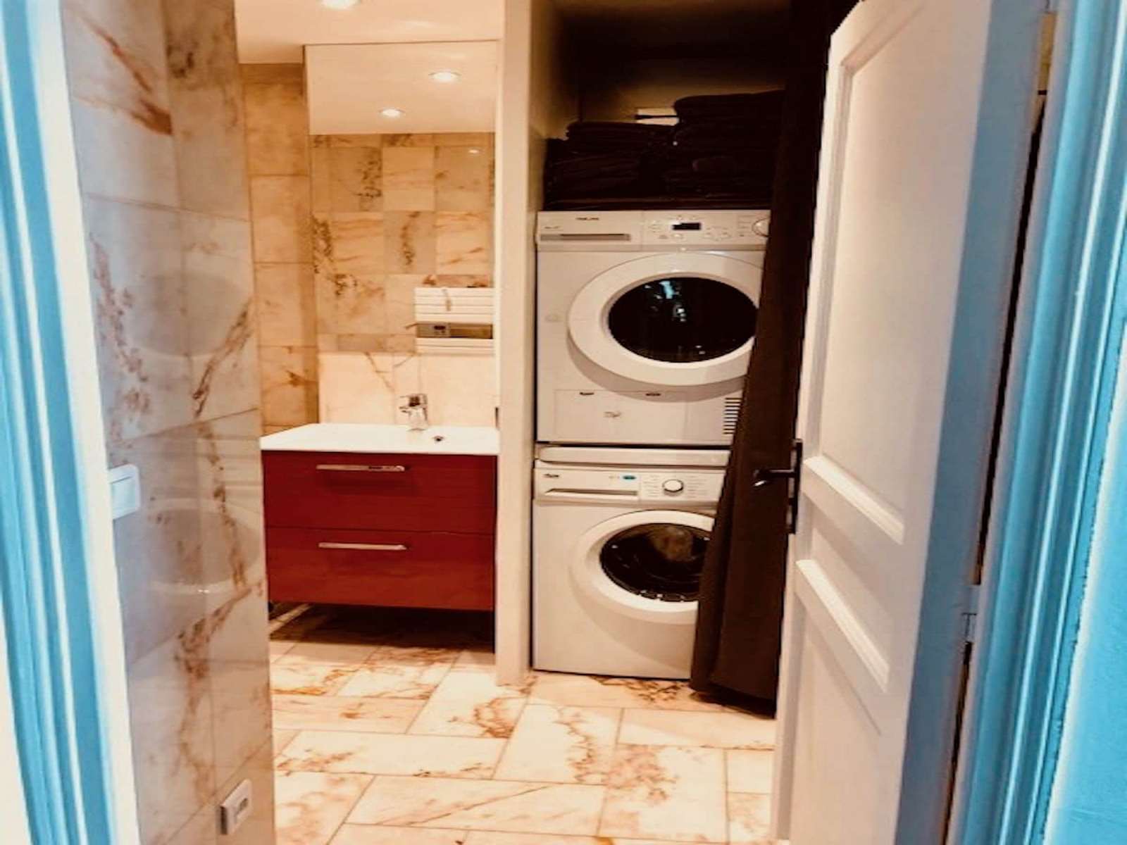 The marble bathroom offers a large shower and bathtub combination with a towel warmer and a very convenient washer and a rare separate dryer unit.