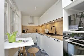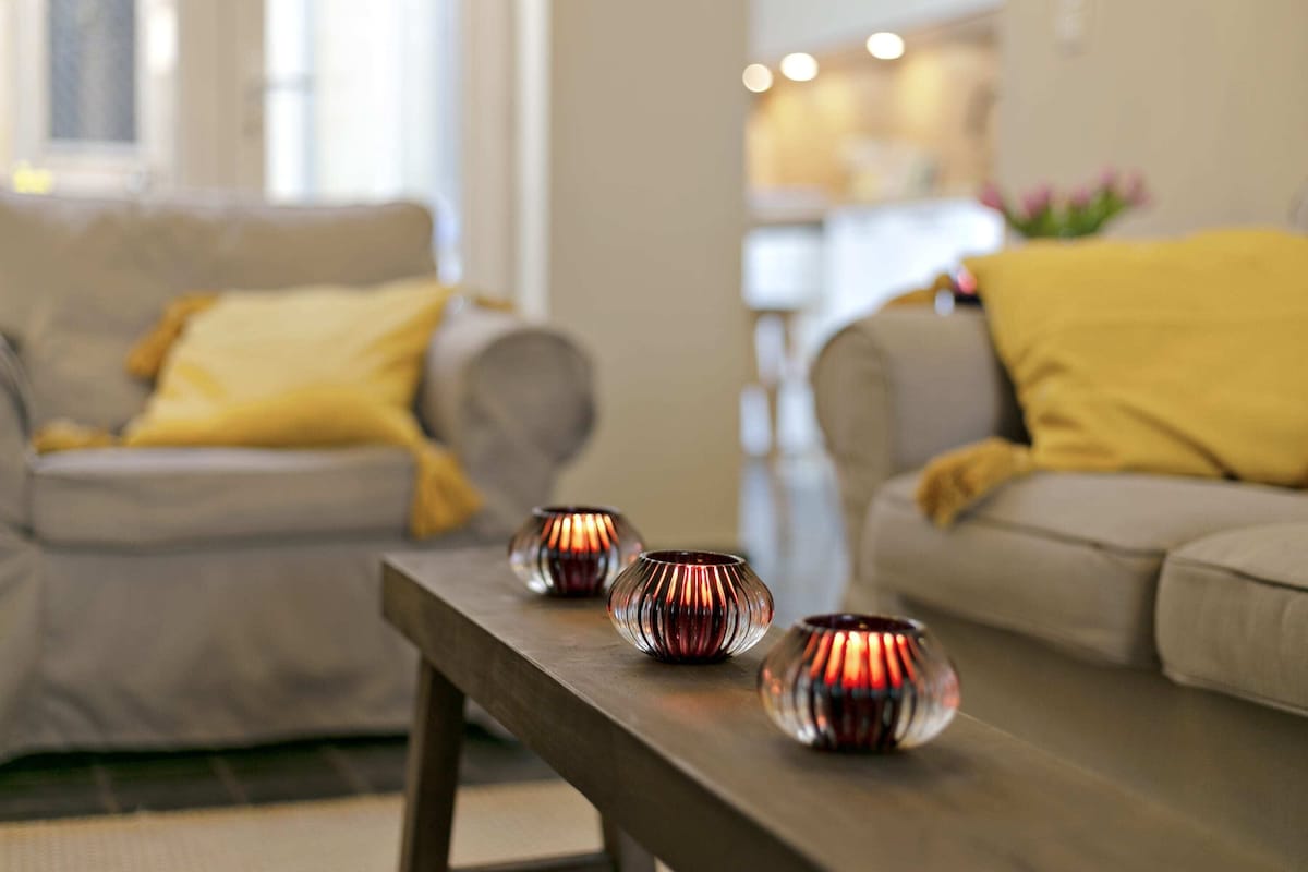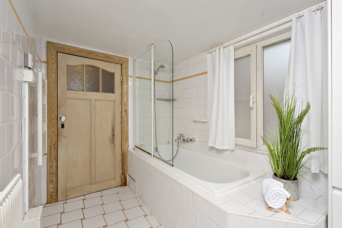 There are 4 floors in total. On ground floor you will find the fully equipped kitchen, inner courtyard, separate toilet and the living room with dining area. On the mezzanine there’s a spacious bathroom with bathtub. On the first floor you can find one bedroom with twin beds and one bedroom with kingsize bed. On the third floor there is one bedroom with a king-size bed and 1 single bed. On top floor (4) there’s a double bed.