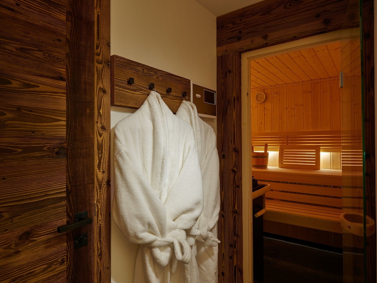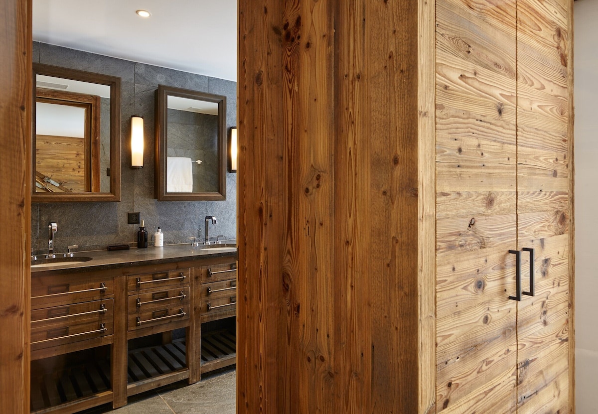 Each bedrooms feels like your own private sanctuary; with huge picture windows and views of the mountains and luxurious natural fabrics. The natural stone bathrooms with walk-in showers are a delight to come back to after a day on the slopes. The two masters also boast bathtubs and there is a well-apportioned sauna in which to soothe any tired limbs. Or head outside to relax in the jacuzzi hot tub – a perfect way to soothe tired muscles after a hard day’s skiing.