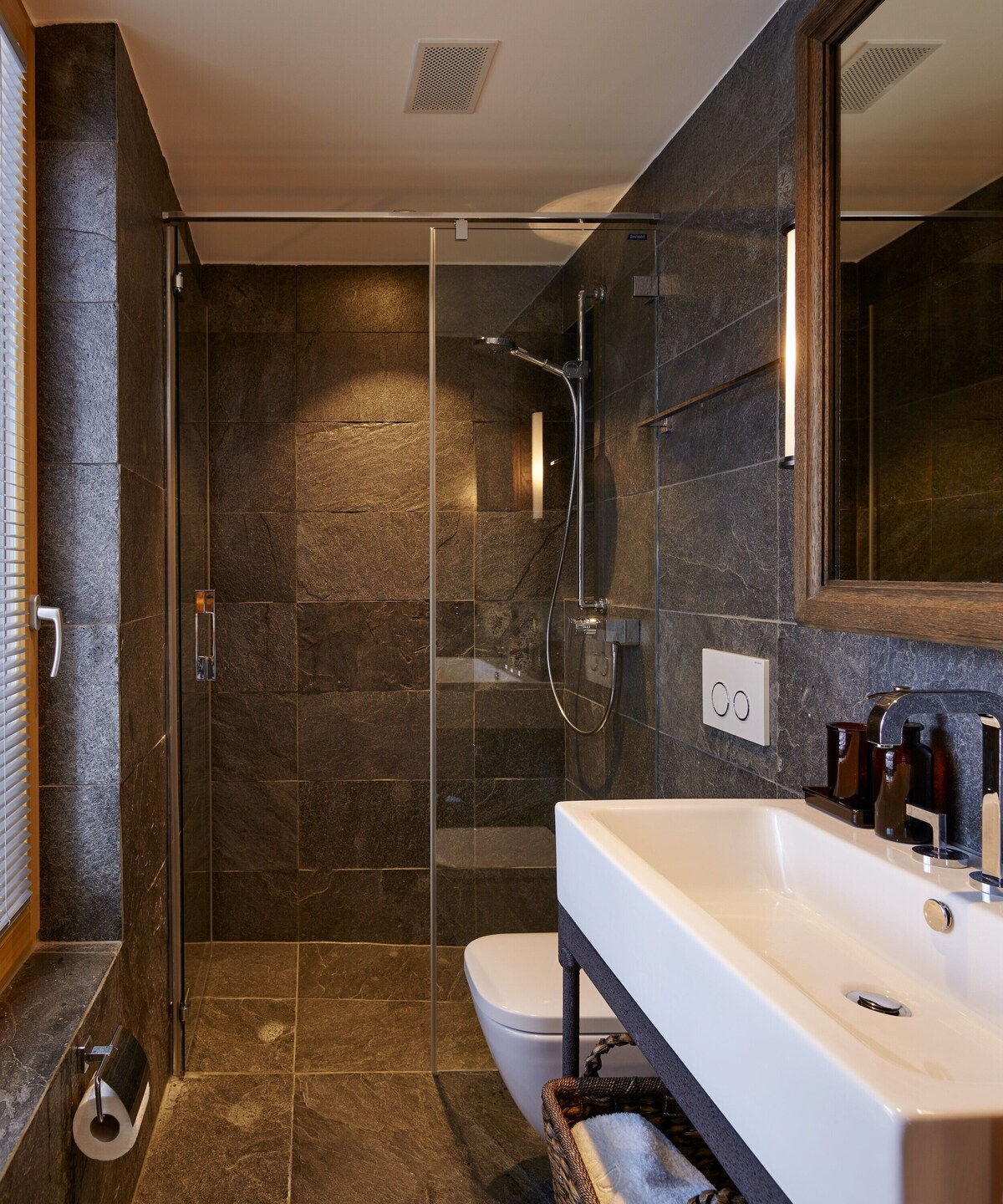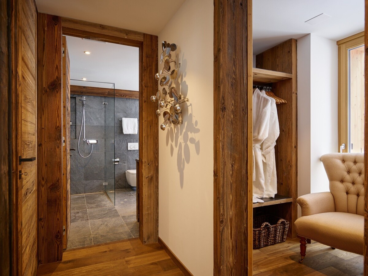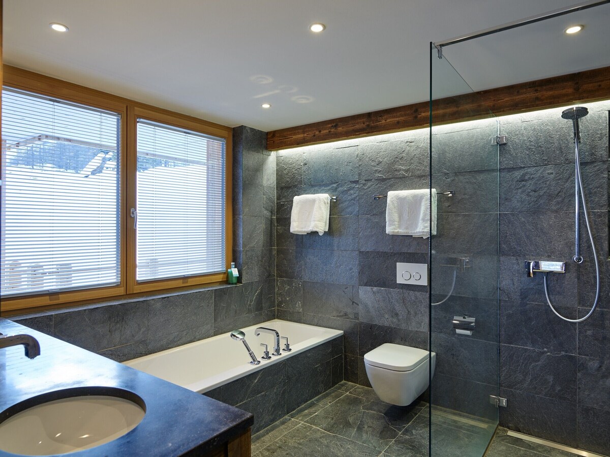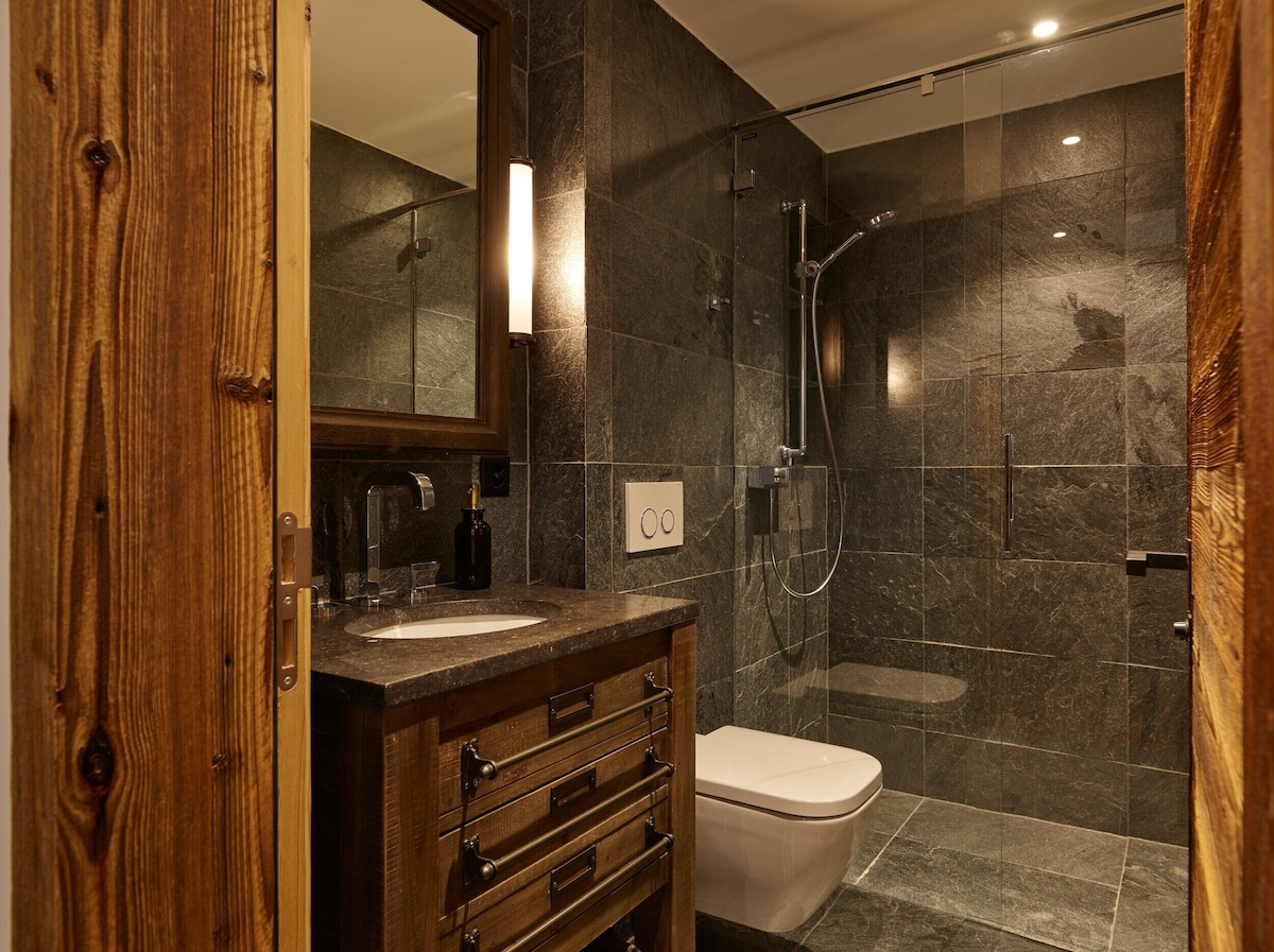 At the top, you’ll find the double-height living space with exposed stone fireplace, a vast sofa placed to luxuriate in those mountain panoramas, ten-seat dining table, bar area and kitchen. A staircase leads to a cosy TV room on the mezzanine level. Further private space for sociable après ski unwinding can be found on the main south-facing terrace, where you’ll find a barbeque and outside dining table. Dine out here whilst the sun sets behind the Dom and you’ll agree this region really is the pearl of the Alps.