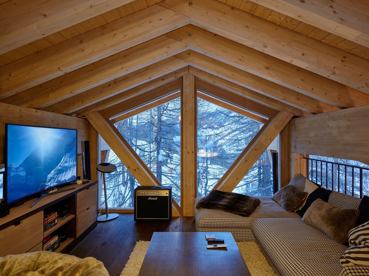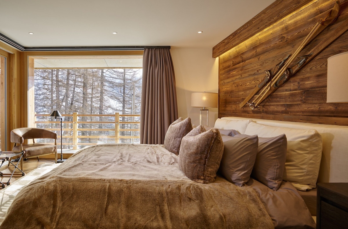 Traditional Saastal mountain chalets might have enjoyed this mountain location and such wonderful aged timbers, but this Chalet takes the vernacular to a new level of delight. Extending over five floors, the chalet’s wooden balconies and large panoramic windows take advantage of the spectacular Saastal views.