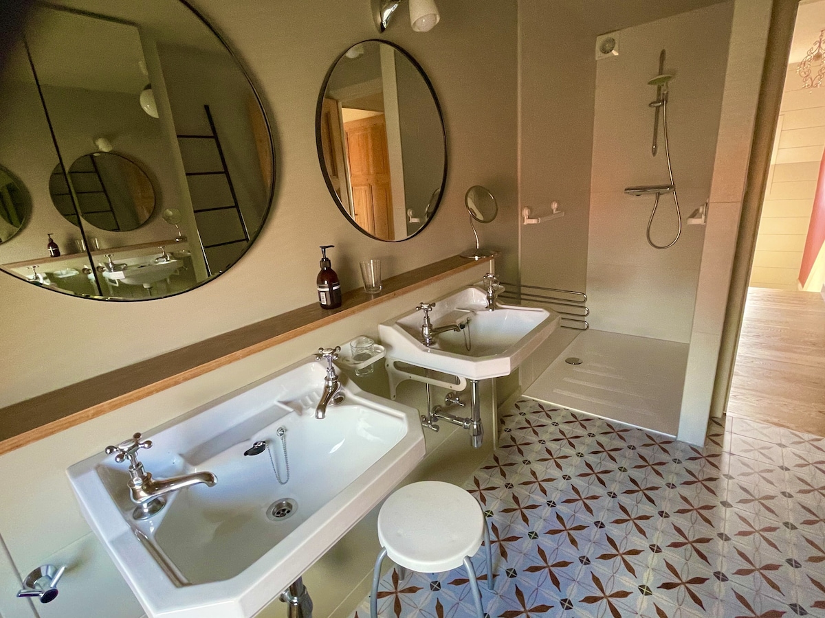-1 Bathroom with walk-in shower and two washbasins.