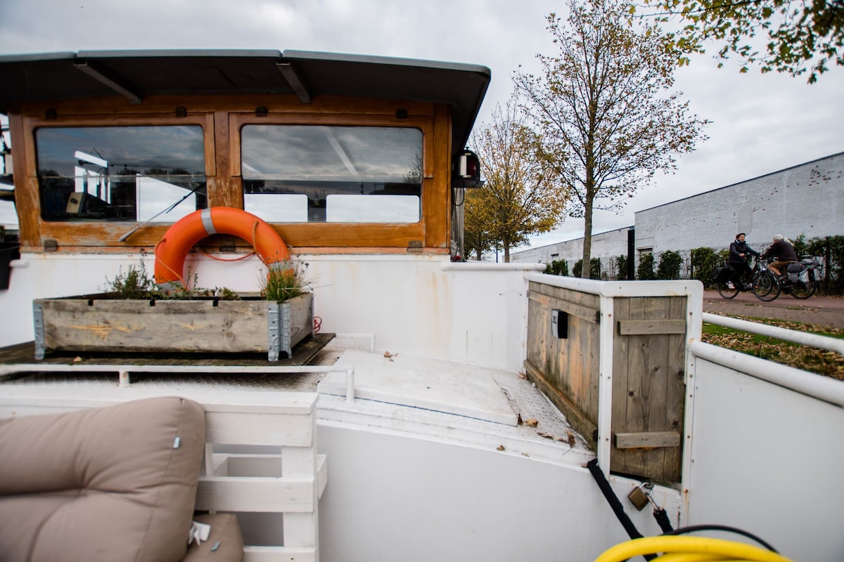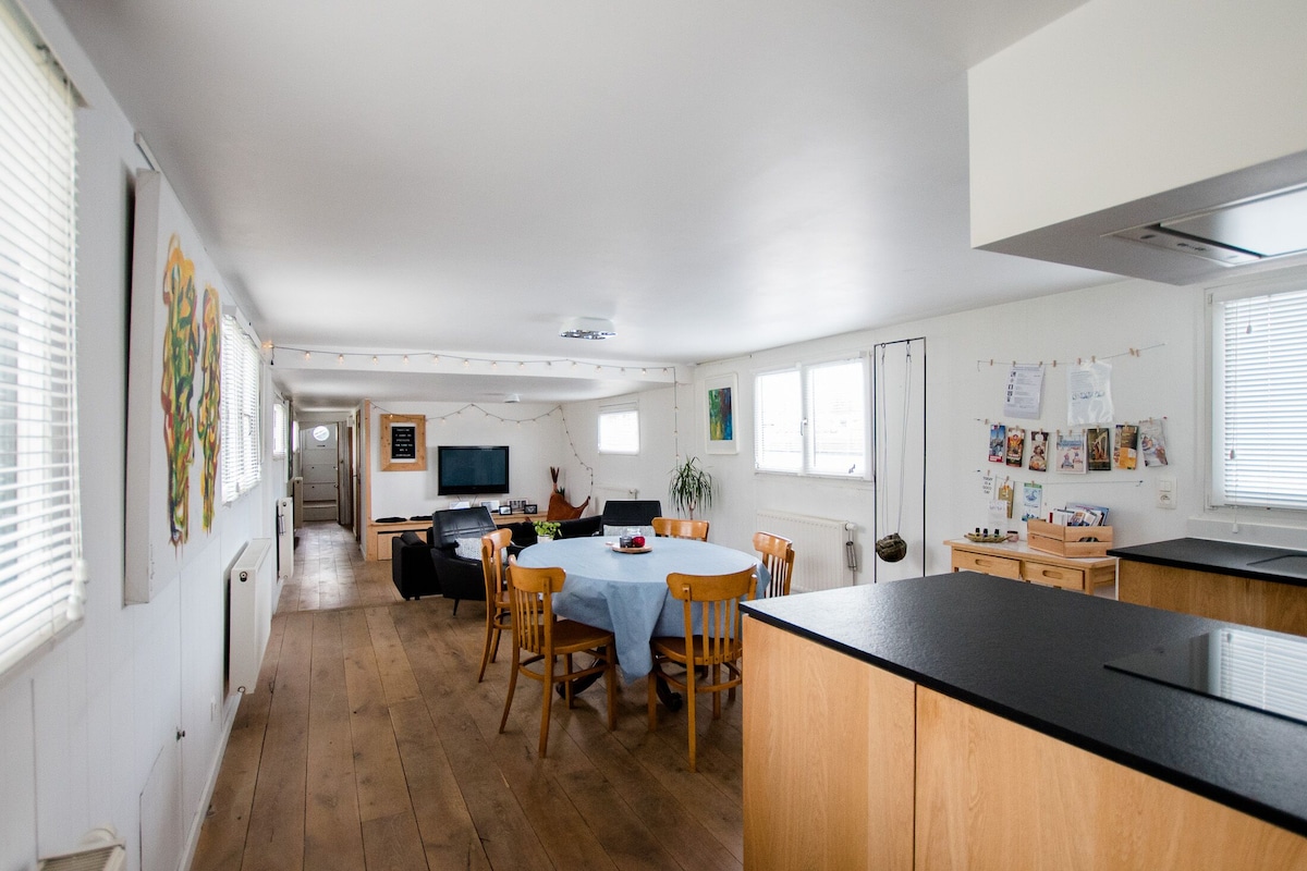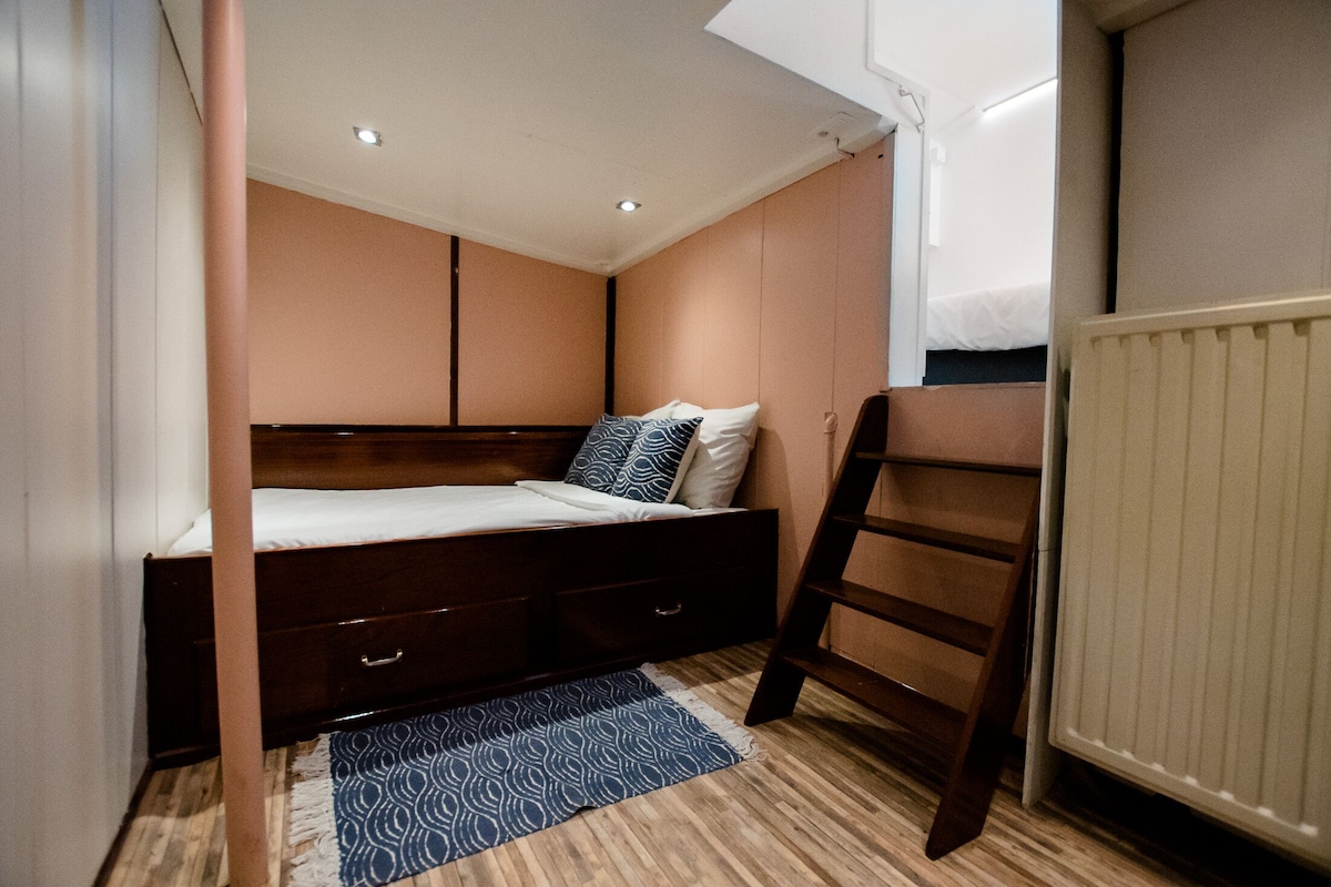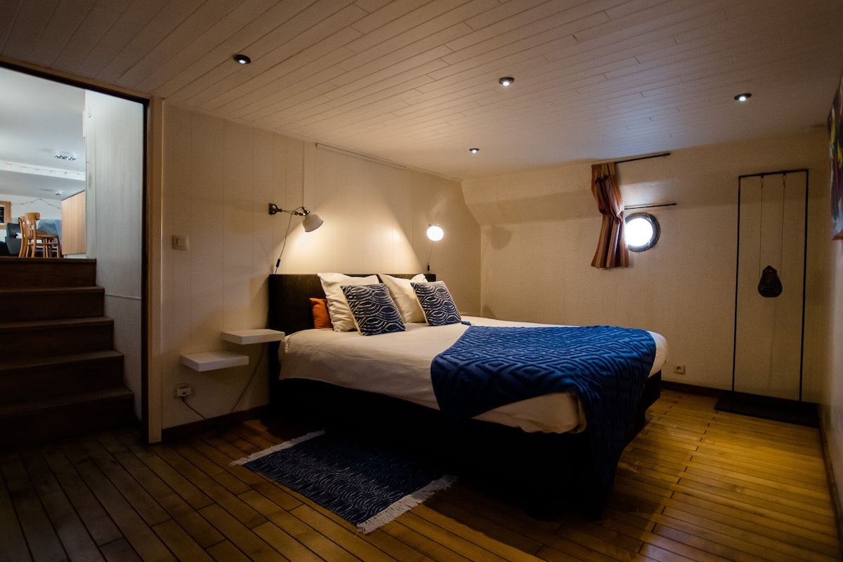 The cargo ship has been renovated into an open loft-style houseboat. The freedom of the water enters in the open and bright living space . After a long day of discovering, you can relax in the sauna or on the terrace.
