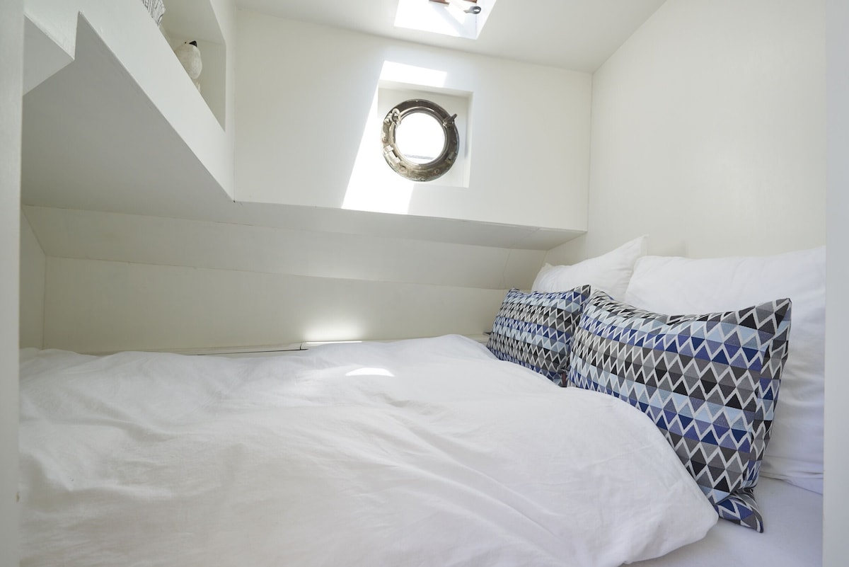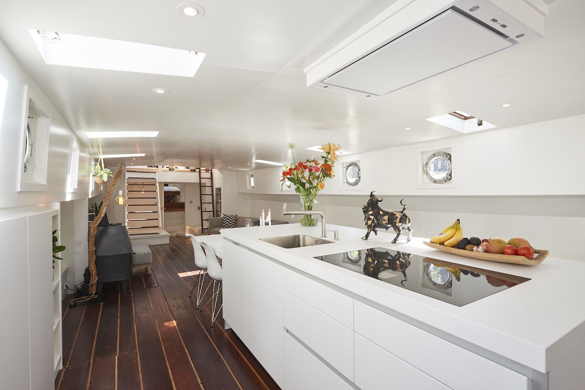 The ship has a beautiful, tastefully recently renovated room with bedrooms with private bathrooms, a large living room and well-equipped kitchen. In addition, there is a spacious roof terrace on deck overlooking the inner harbour.