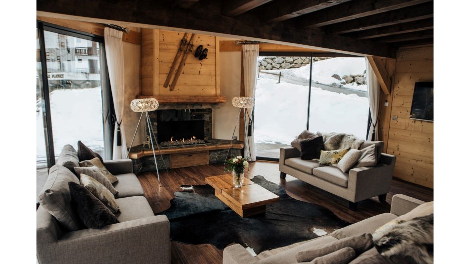 The sitting room which is flooded with light has lots of comfy sofas by the splendid contemporary feature fireplace. There are high tables and stools, a wonderful spot to sip your pre-dinner drinks and low level seating areas too. The dining area floods with morning light for breakfast and in the evening a wonderful view of the village in the dark with its twinkling winter lights makes a superb place to meet for your evening meal.