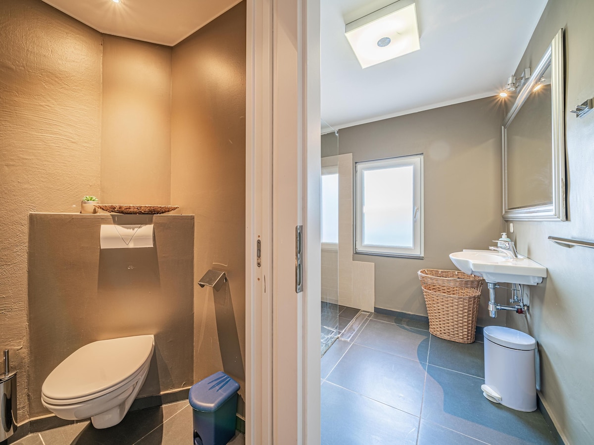 On the 1st floor: (hallway, 2x bedroom(double bed, washbasin), 2x bedroom(single bed, double bed, washbasin), bathroom(shower, washbasin, heating(floor heating)), toilet(washbasin))