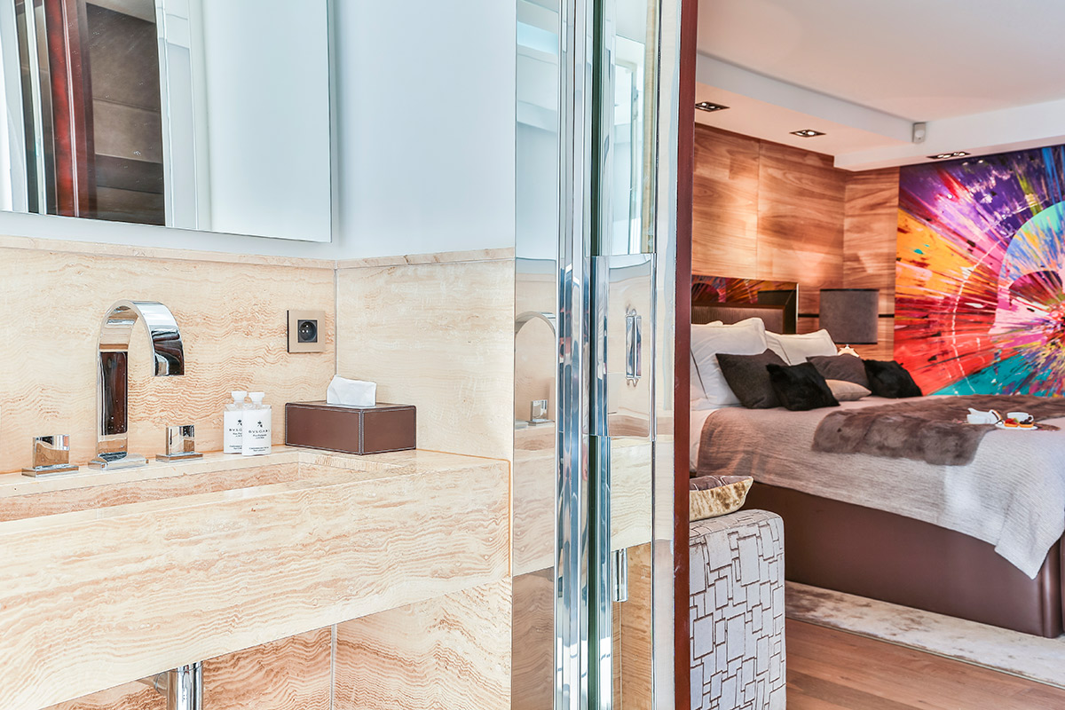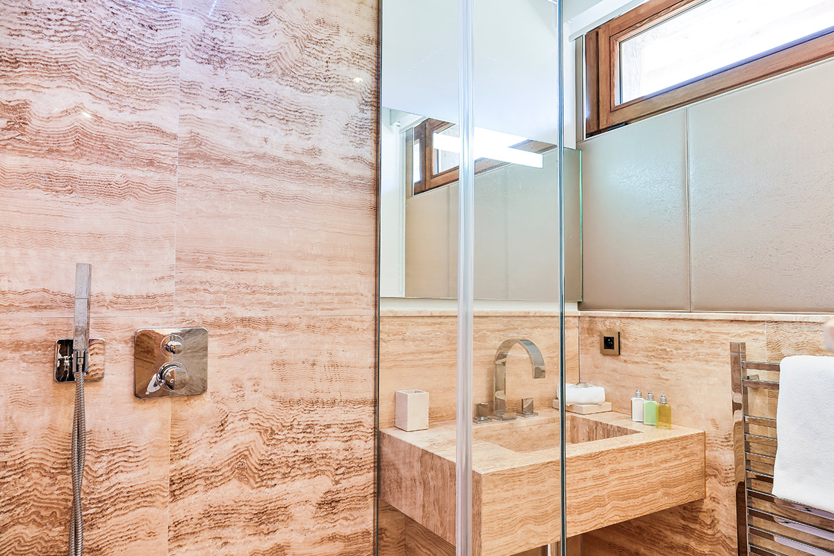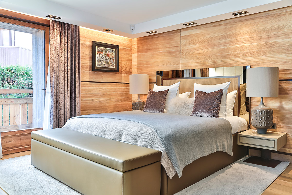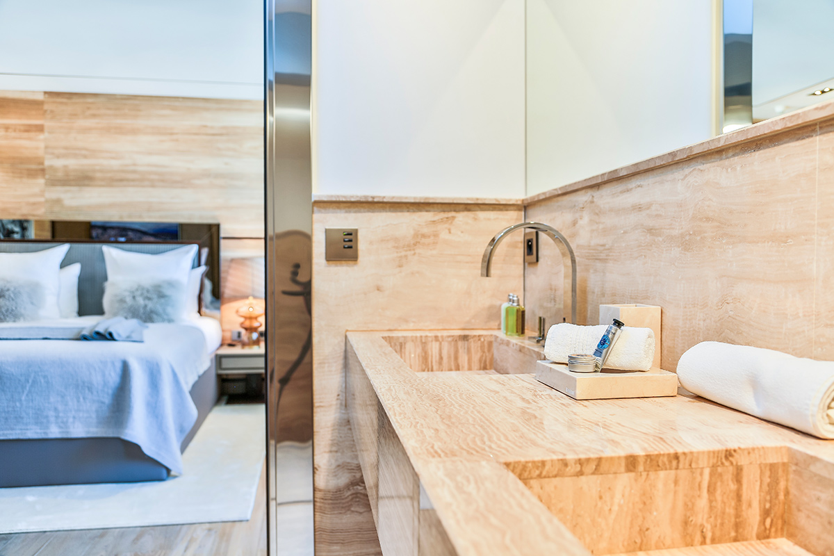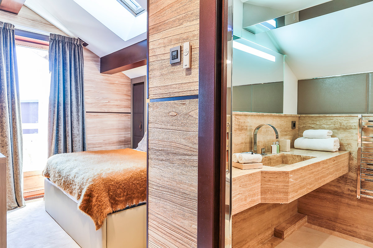 Each of the chalet’s seven bedrooms has an en-suite bathroom for comfort and privacy. There’s a master suite with a king bed, five bedrooms with double beds and one bedroom with two twin beds on the main level and two cots on a mezzanine level, perfect for children. Pale wood paneling and leather-wrapped bed frames create a serene atmosphere in the bedrooms that’s matched by creamy, sand-colored polished stone in the bathrooms.
