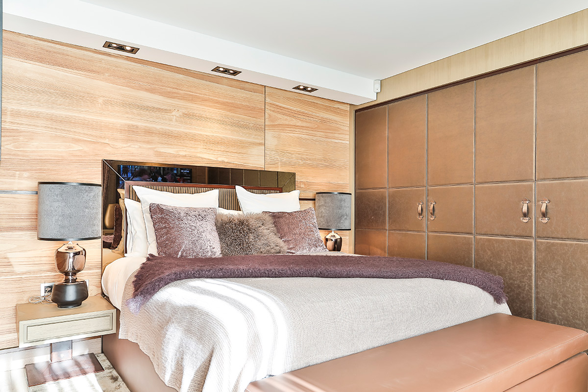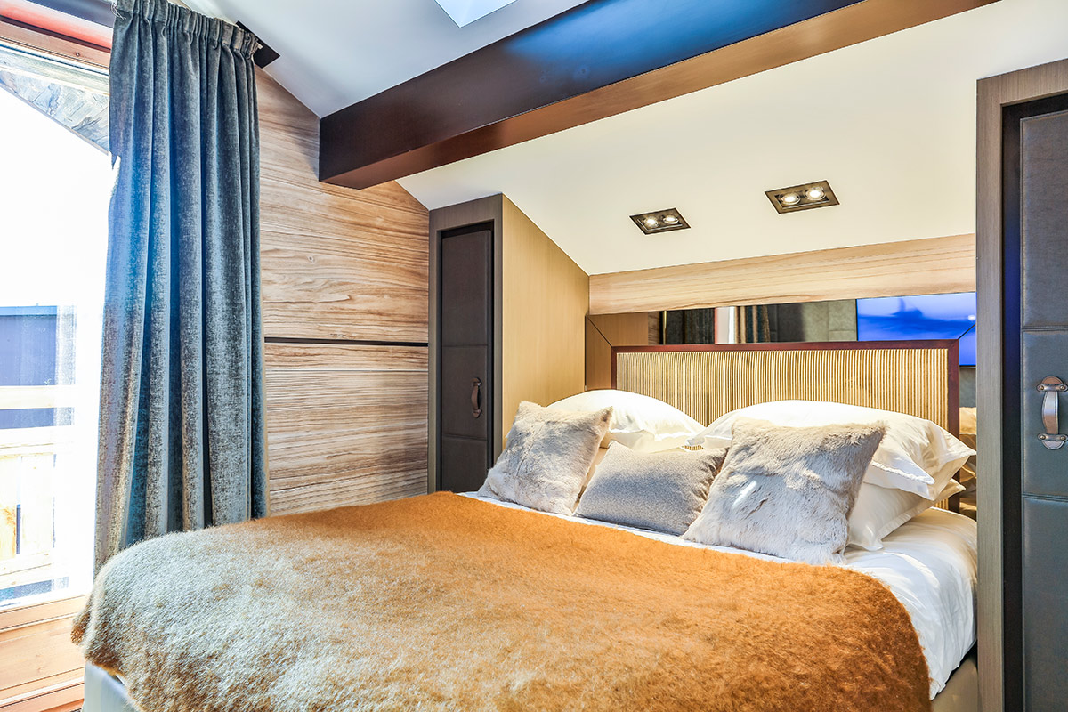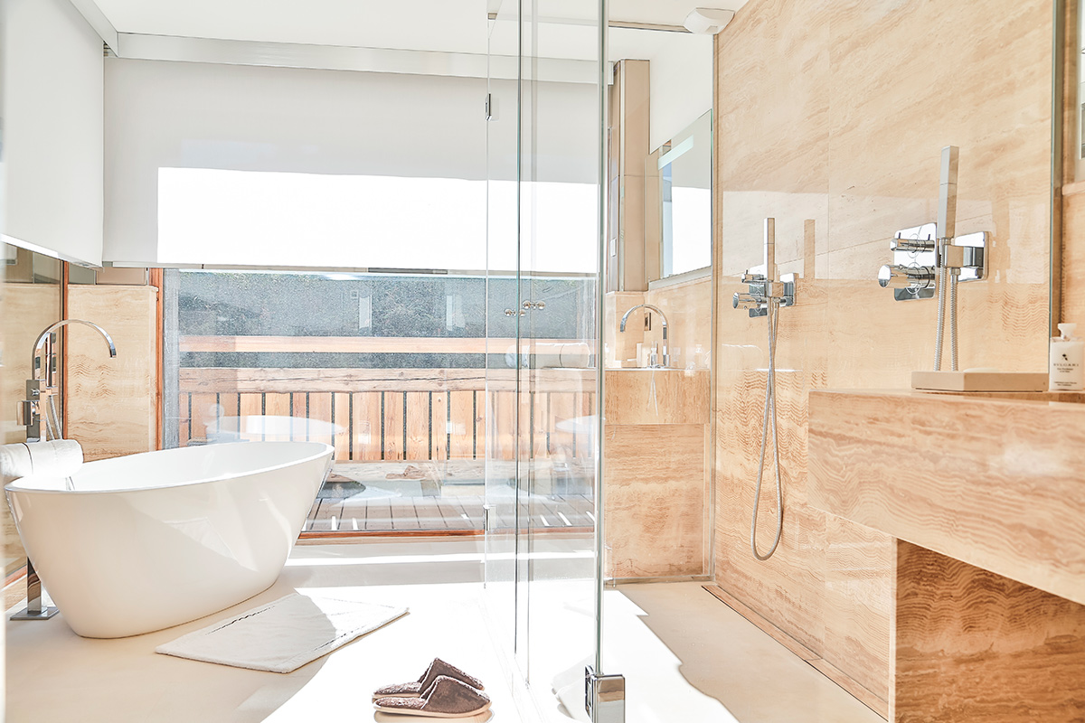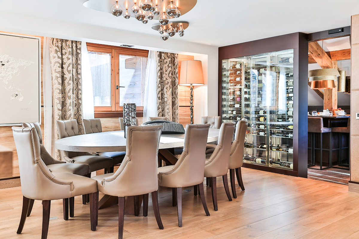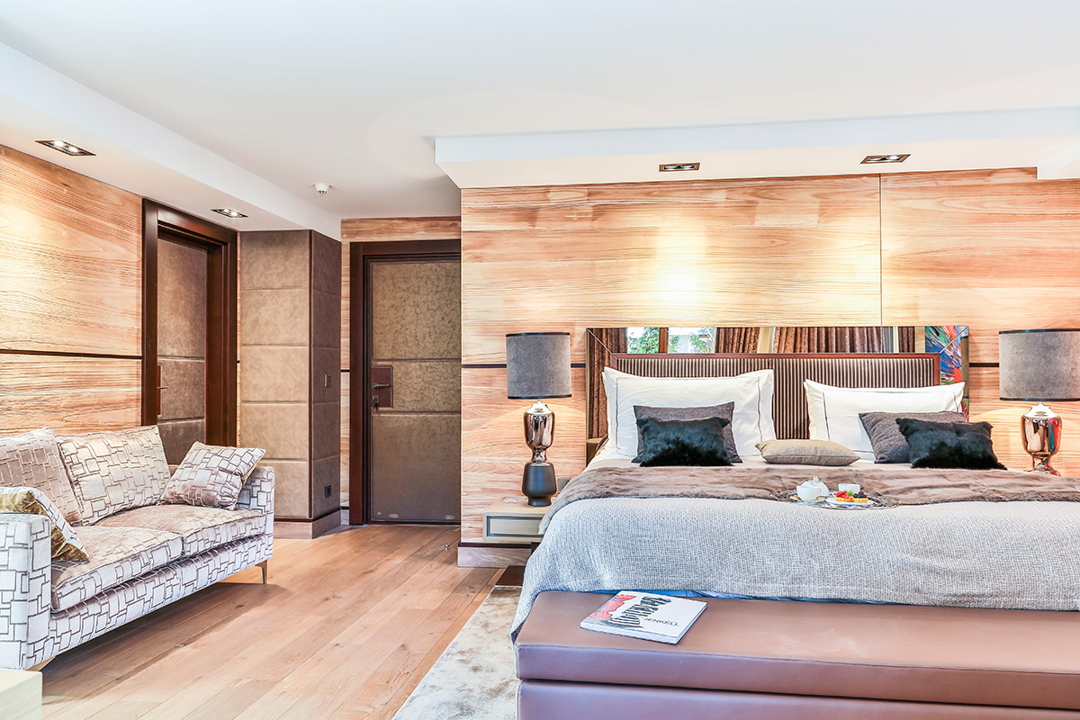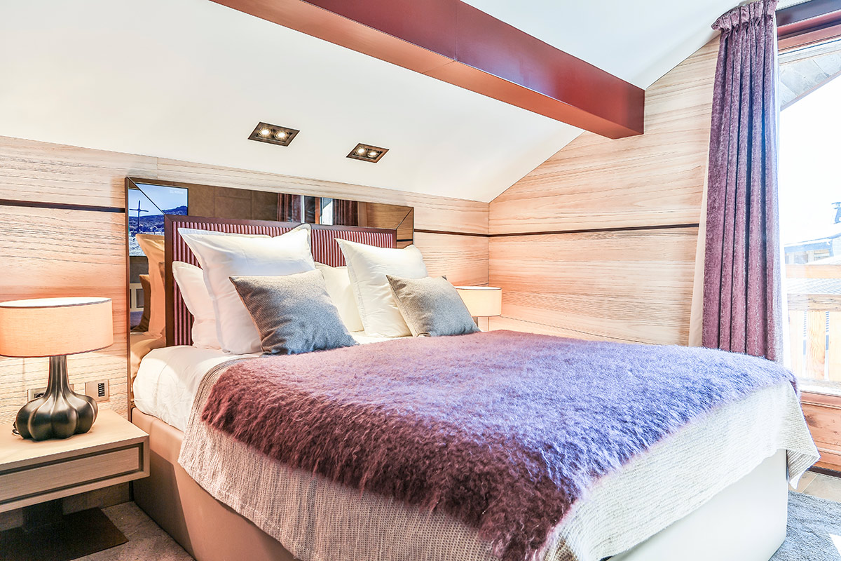 Each of the chalet’s seven bedrooms has an en-suite bathroom for comfort and privacy. There’s a master suite with a king bed, five bedrooms with double beds and one bedroom with two twin beds on the main level and two cots on a mezzanine level, perfect for children. Pale wood paneling and leather-wrapped bed frames create a serene atmosphere in the bedrooms that’s matched by creamy, sand-colored polished stone in the bathrooms.