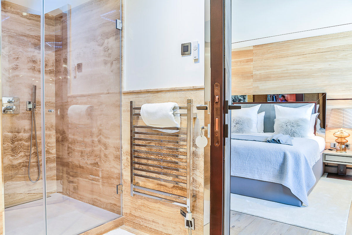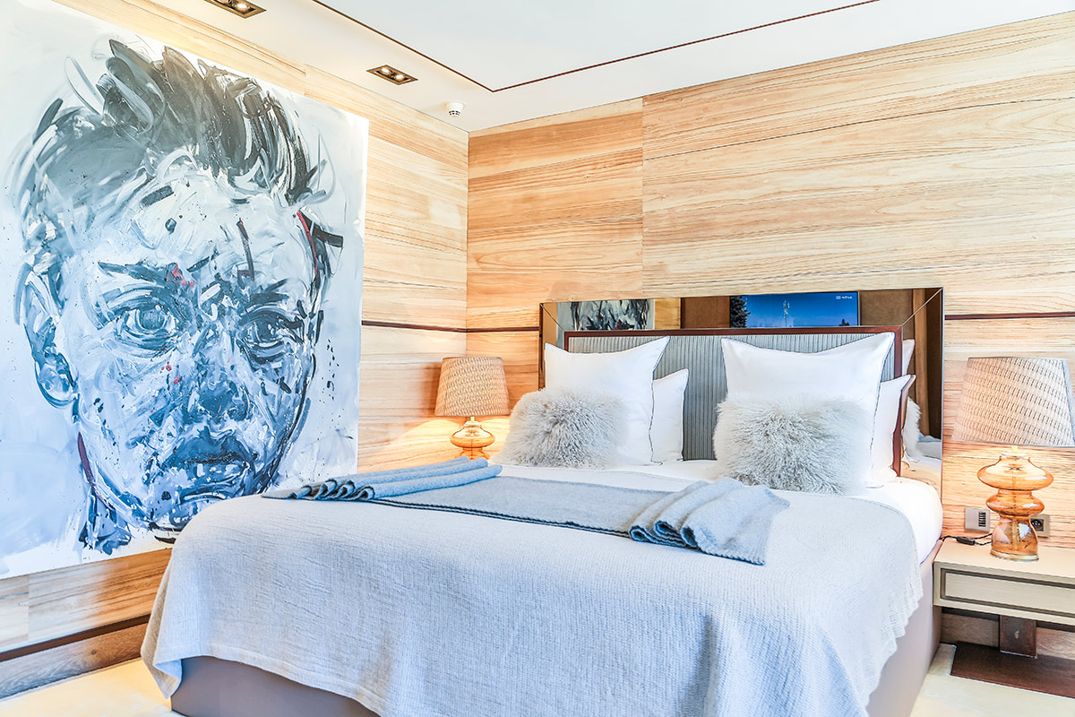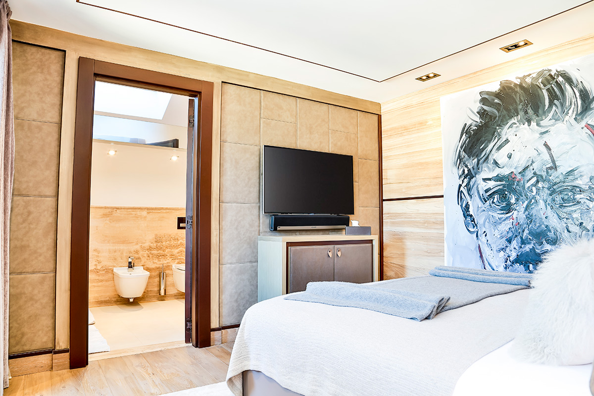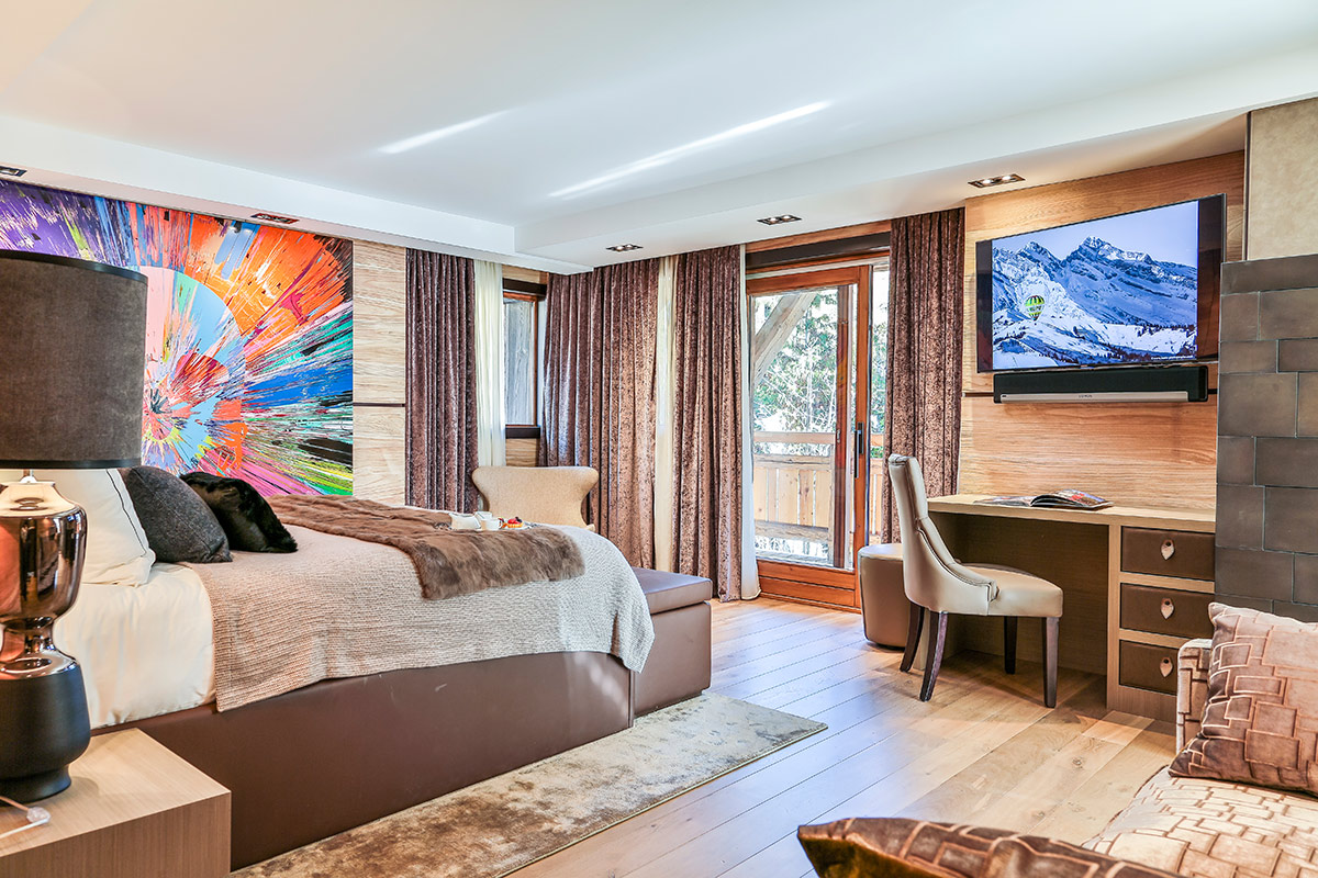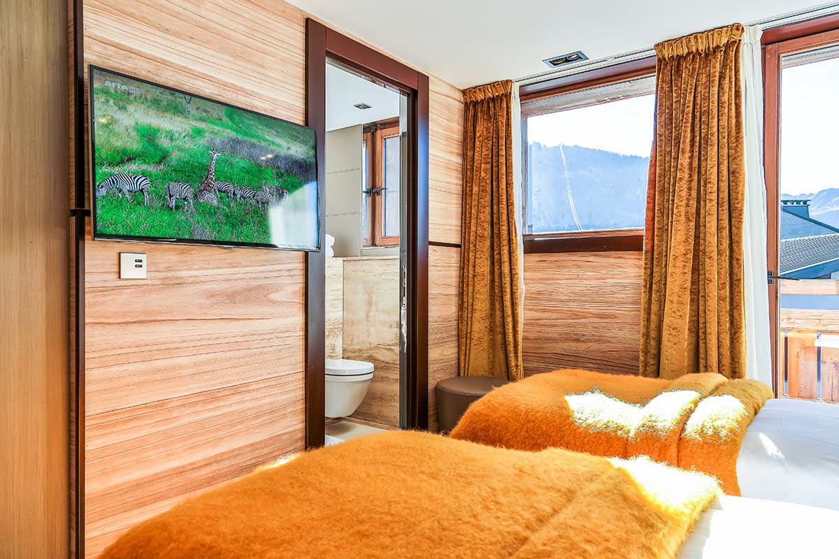 Each of the chalet’s seven bedrooms has an en-suite bathroom for comfort and privacy. There’s a master suite with a king bed, five bedrooms with double beds and one bedroom with two twin beds on the main level and two cots on a mezzanine level, perfect for children. Pale wood paneling and leather-wrapped bed frames create a serene atmosphere in the bedrooms that’s matched by creamy, sand-colored polished stone in the bathrooms.
