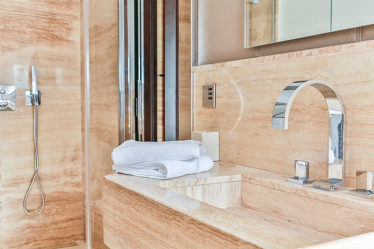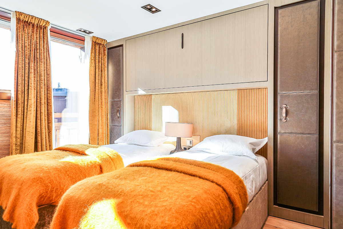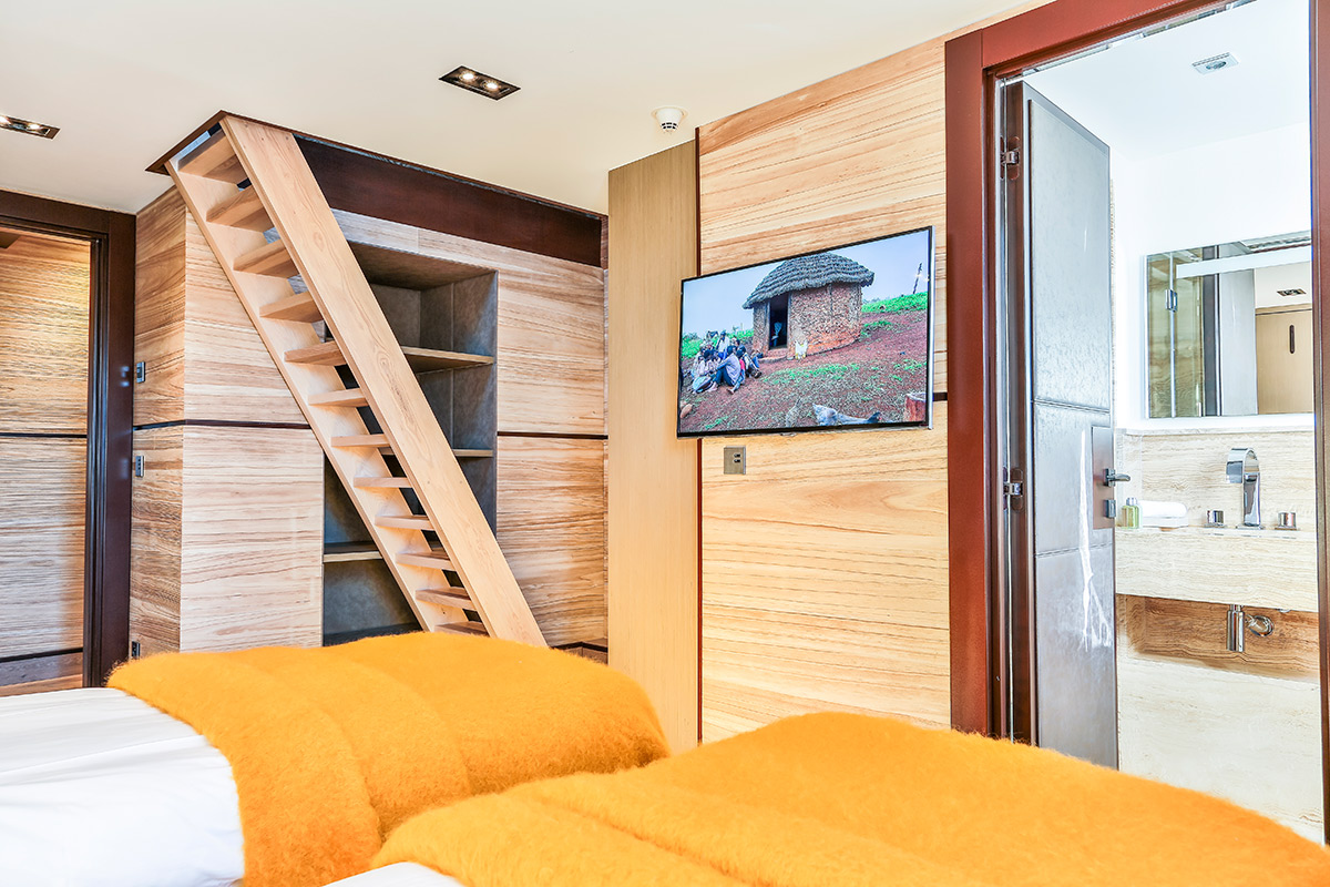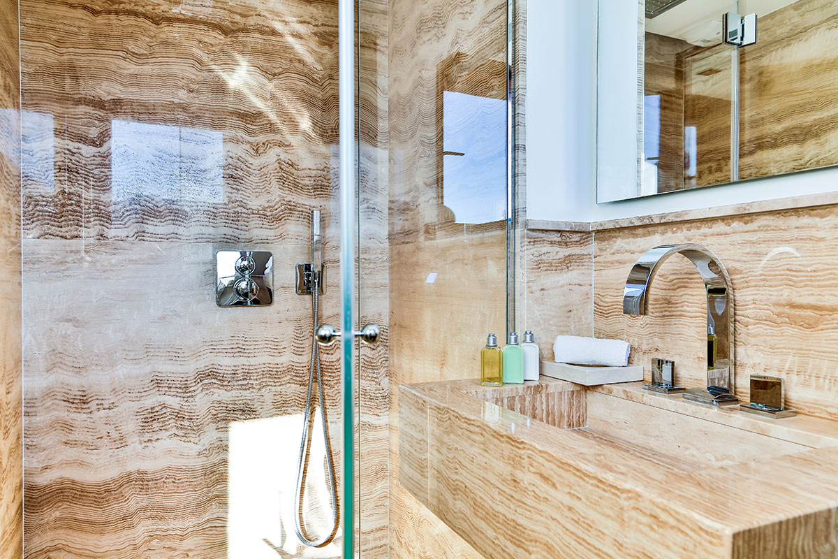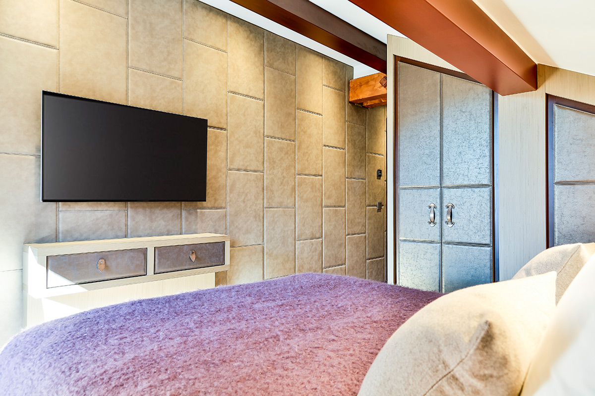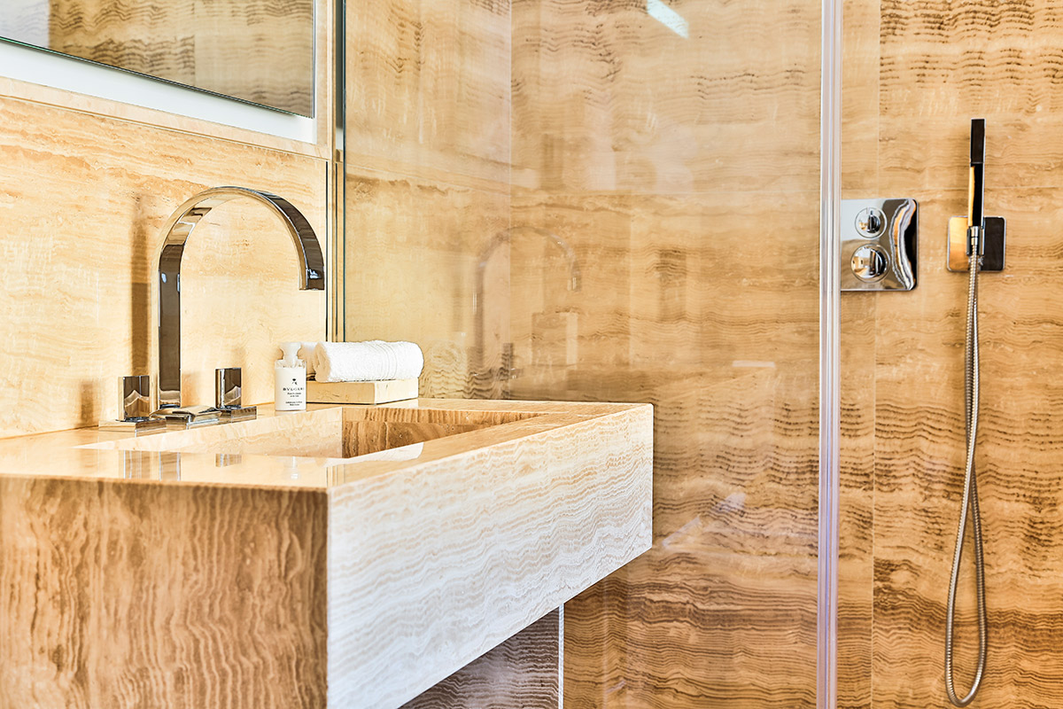 Each of the chalet’s seven bedrooms has an en-suite bathroom for comfort and privacy. There’s a master suite with a king bed, five bedrooms with double beds and one bedroom with two twin beds on the main level and two cots on a mezzanine level, perfect for children. Pale wood paneling and leather-wrapped bed frames create a serene atmosphere in the bedrooms that’s matched by creamy, sand-colored polished stone in the bathrooms.