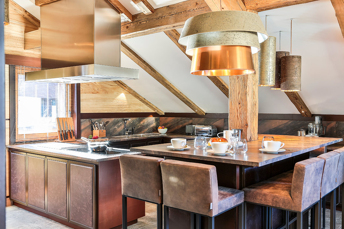 The villa pairs modern furnishings with exposed wood beams and sloped ceilings for a luxury chalet vibe. The living room has two sitting areas in complementary hues: one in cool tones, with pale gray upholstery and a sleek tuxedo-style sofa, and one in warm tones, with cognac leather accent chairs. The sleek, copper-paneled fireplace makes a weighty central focal point. In one corner of the space, you’ll find the formal dining area, which features champagne-colored chairs around an elliptical table. Step past the wine case to the kitchen, which has a generous breakfast bar and amenities like a dishwasher and icemaker.