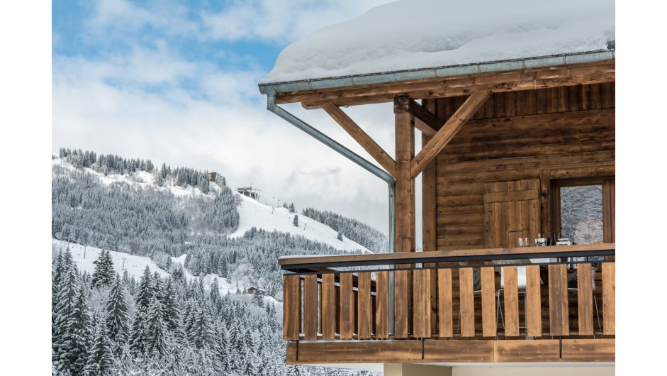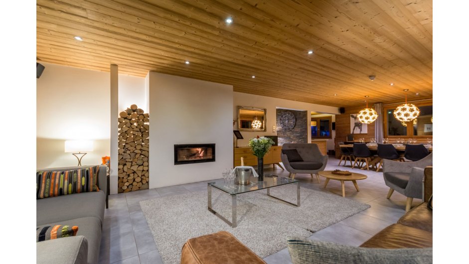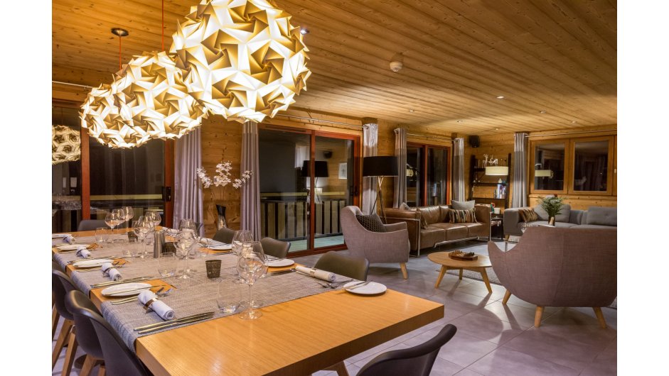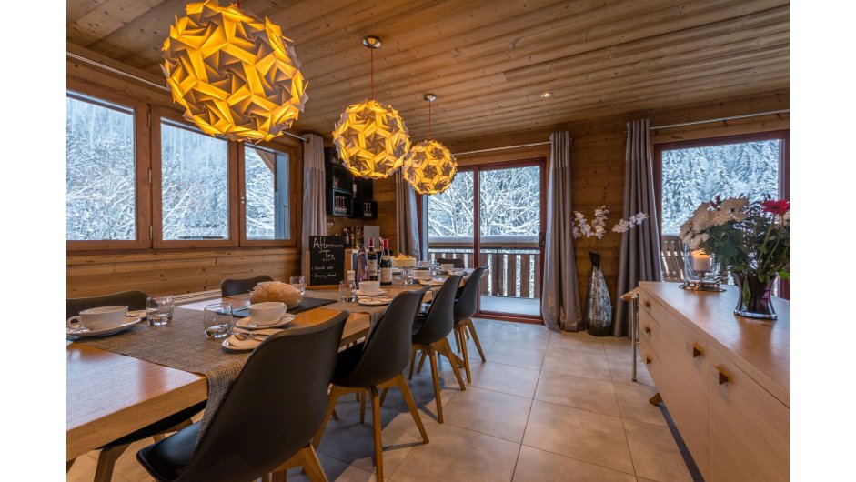 The spacious open-plan living and dining area has stunning views up the valley to the Dents Blanches mountain range beyond and down across Morzine to the pistes of Pleney. A feature open plan living room with roaring fire has full height sliding glass doors that open onto the wrap around balcony, a perfect place to watch the setting sun whilst enjoying a glass of champagne.