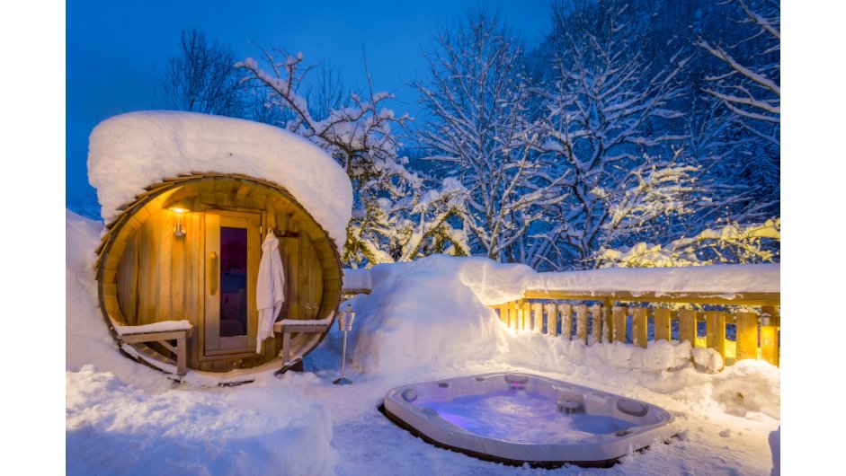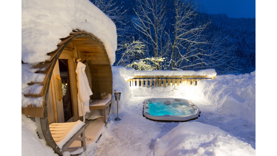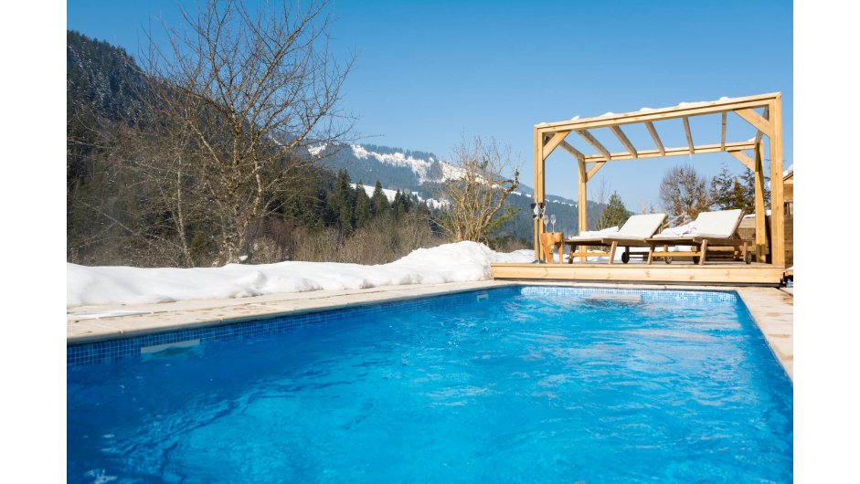 No mountain home would be complete without a hot tub and Chalet is no exception. You’ll find our spa sunk into a multi-level terrace with fantastic views of the mountains: the perfect place to soothe your muscles and sip champagne with friends. You’ll also find a charming wood burning sauna and loungers from which to enjoy the tranquility of the mountains with that steaming glass of vin chaud. Now has an outdoor heated swimming pool which is open in the summer and winter! It is 6m long and has a counter current, so it can be used for ‘proper’ swimming and is designed for triathlon training, or just relaxing.
