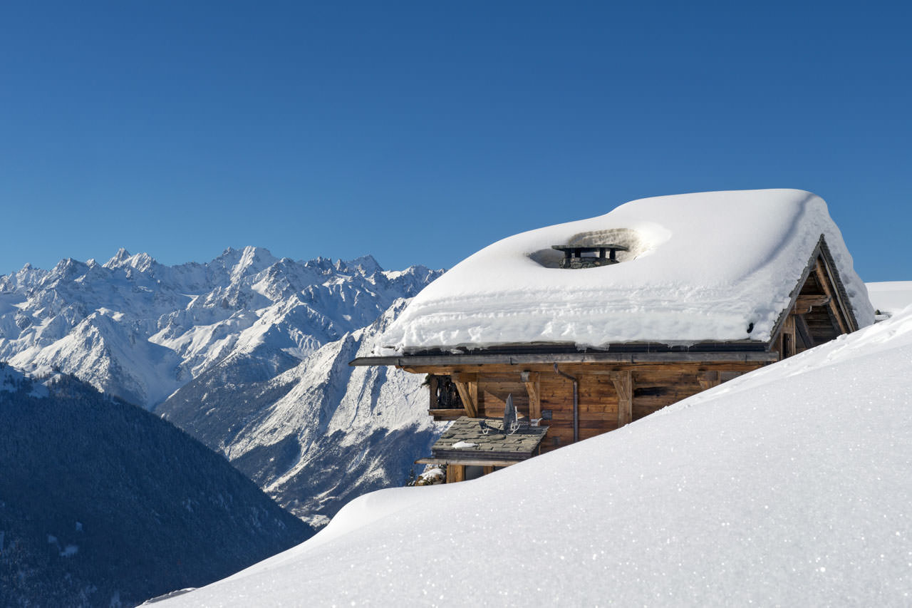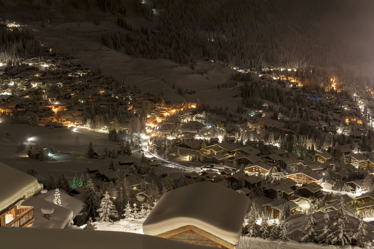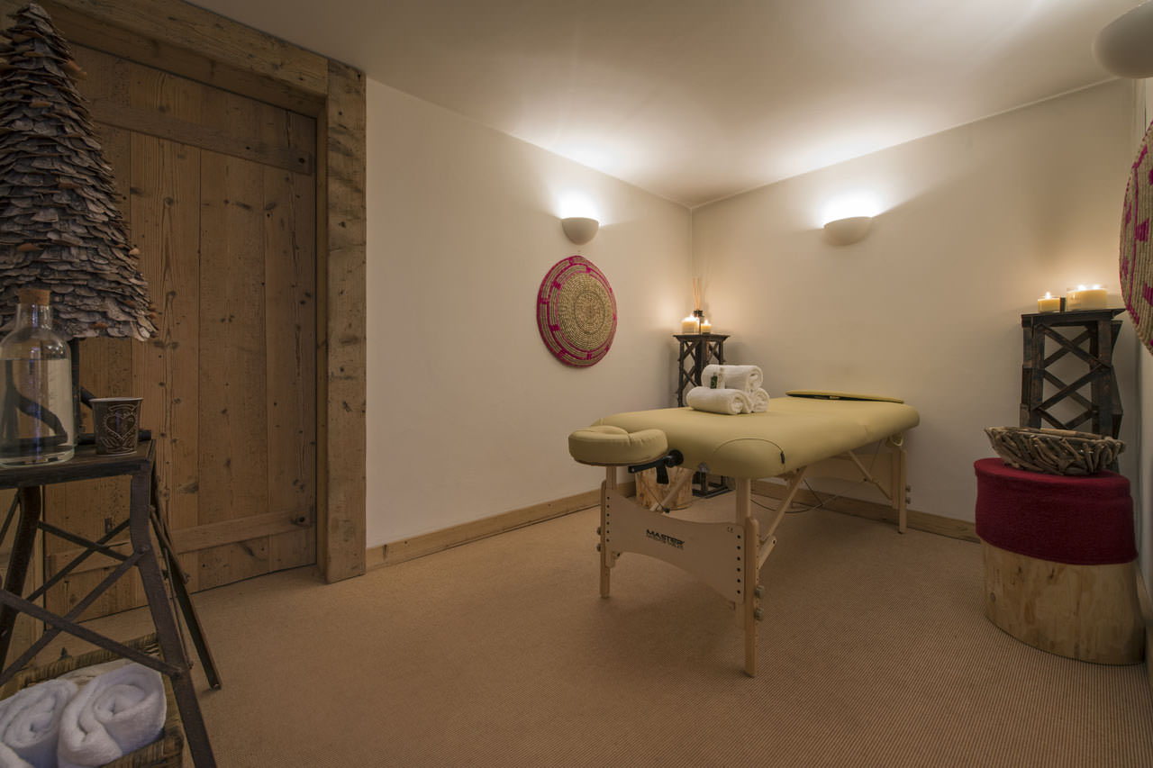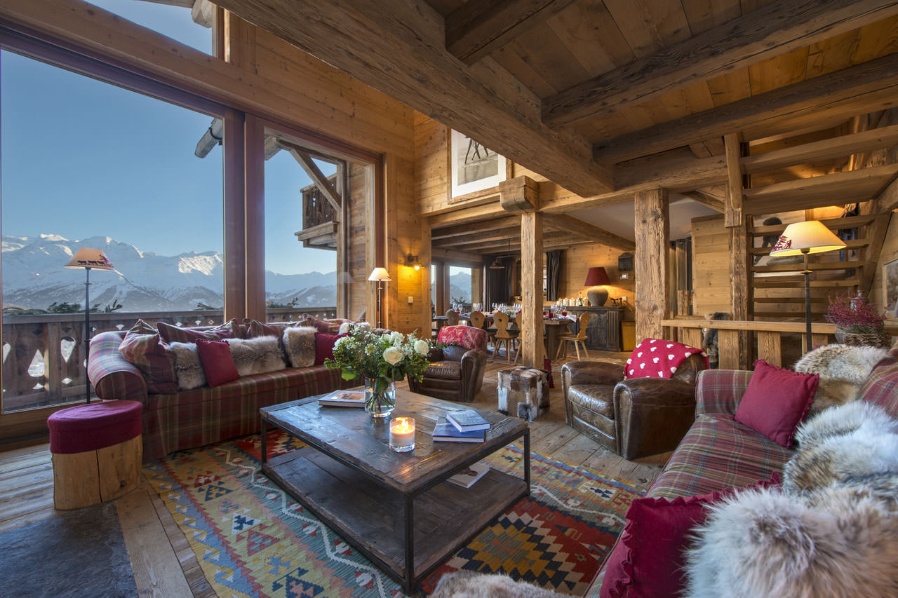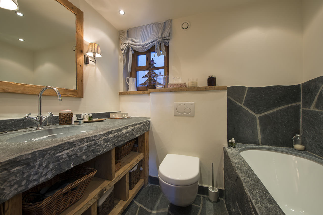 The chalet is split between two structures, the main residence and a guest Mazot. In the main chalet is an extensive open plan living space with double height windows and a large dining table that comfortably seats twelve. The kitchen is also open plan. Stairs lead up to a mezzanine level with an office space and the master bedroom with working fireplace and en-suite marble bathroom is also accessed via this space.