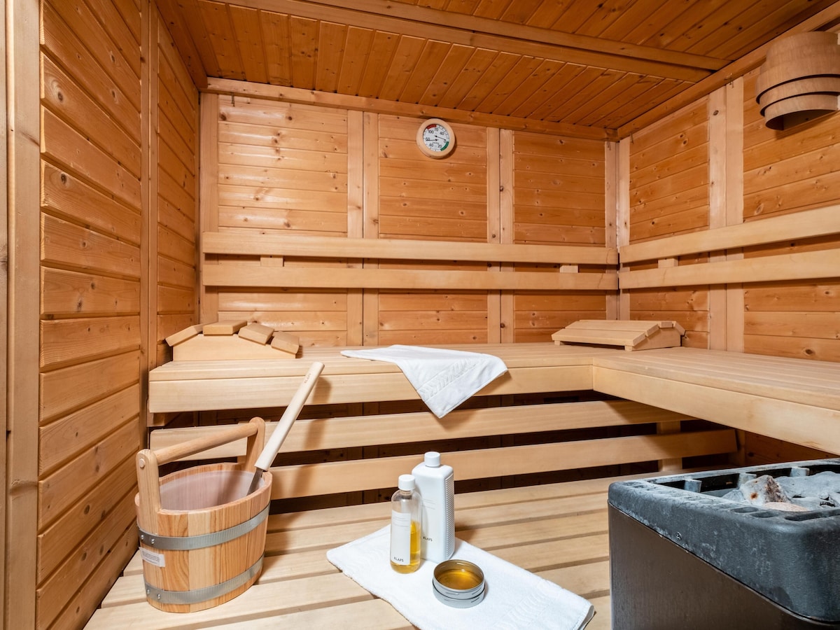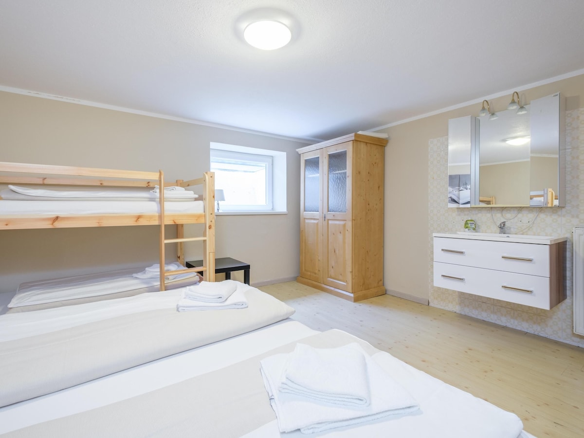 Basement: (bedroom(double bed, washbasin), bedroom(double bed, bunk bed, washbasin), bathroom(shower, toilet), sauna(washbasin), ski storage(tumble dryer, washing machine))