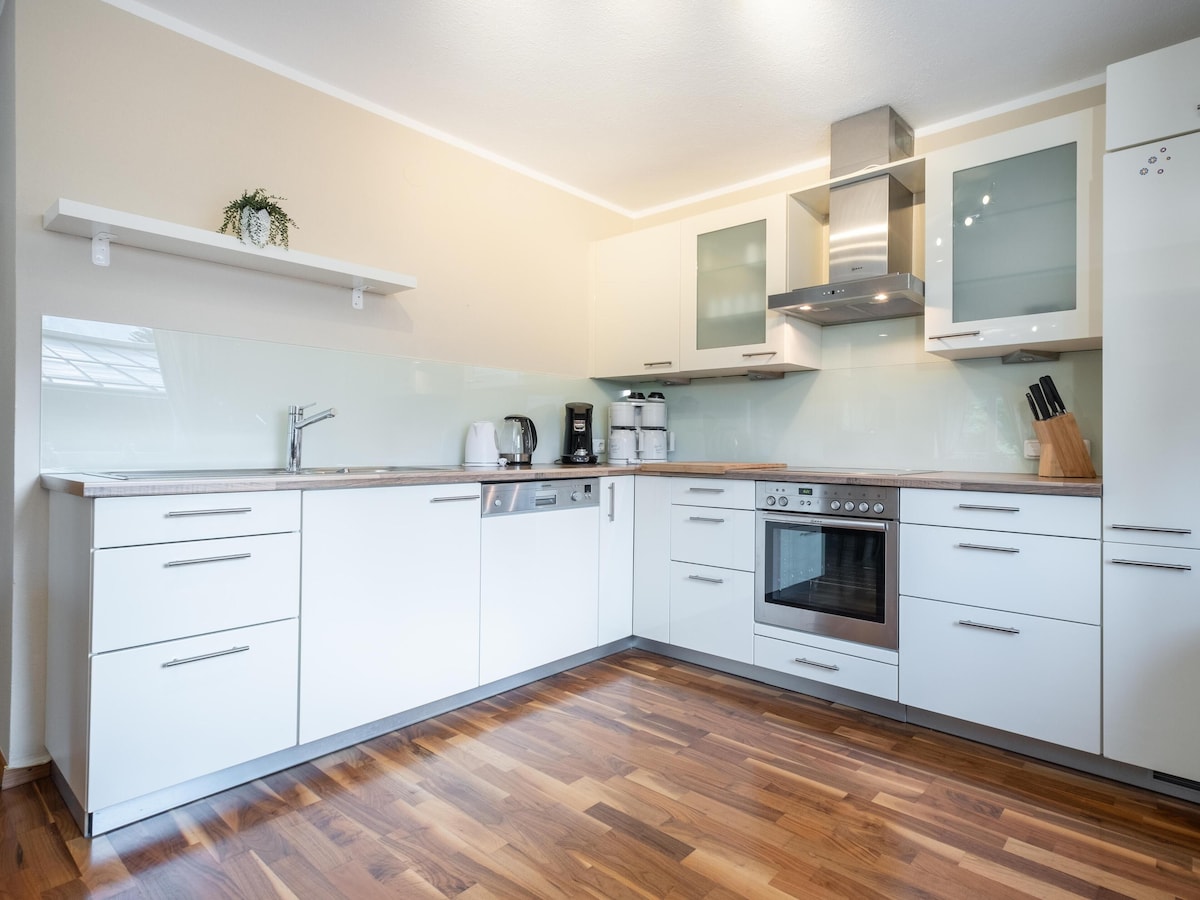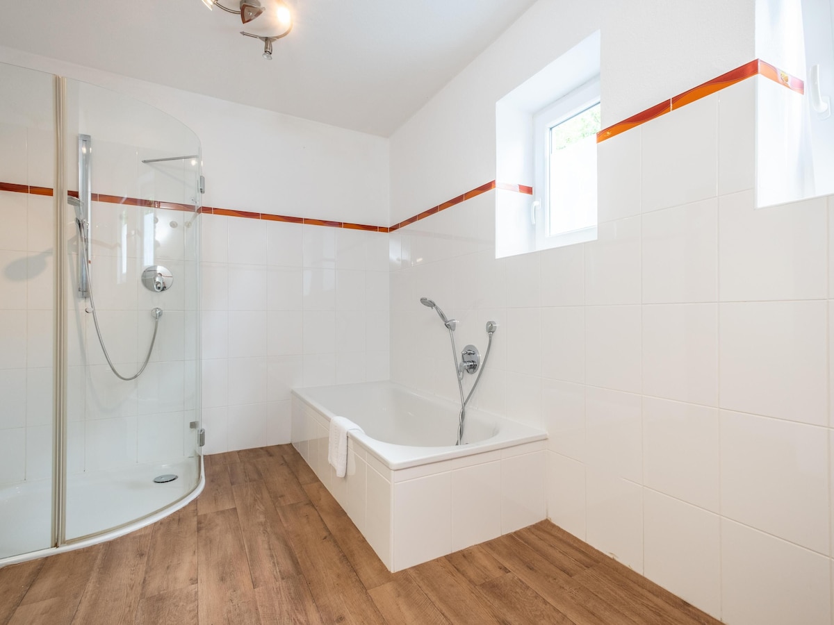 On the 1st floor: (dining room, open kitchen(electric kettle, coffee machine(filter), oven, microwave, dishwasher, fridge-freezer), bedroom(double bed, bunk bed), Bedroom with bathroom(double bed, shower, washbasin, toilet), bathroom(bath tub, shower, washbasin, toilet))
