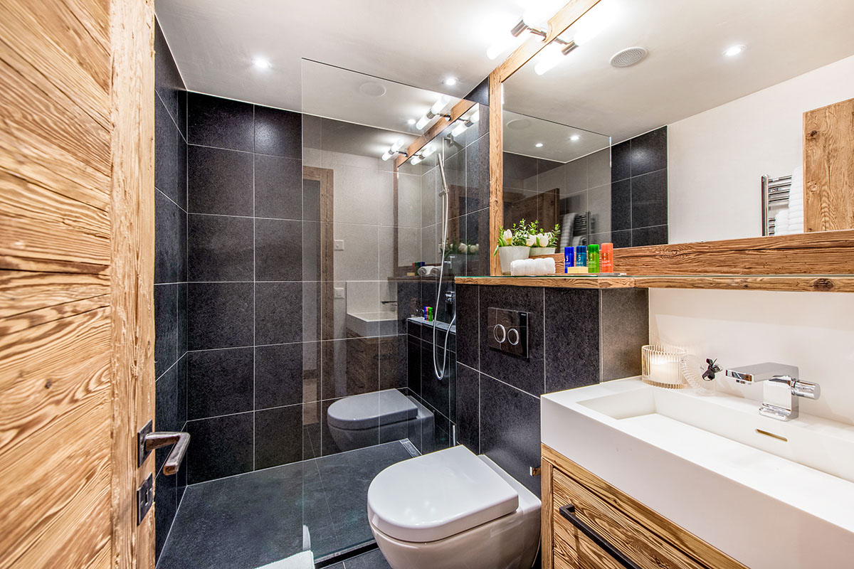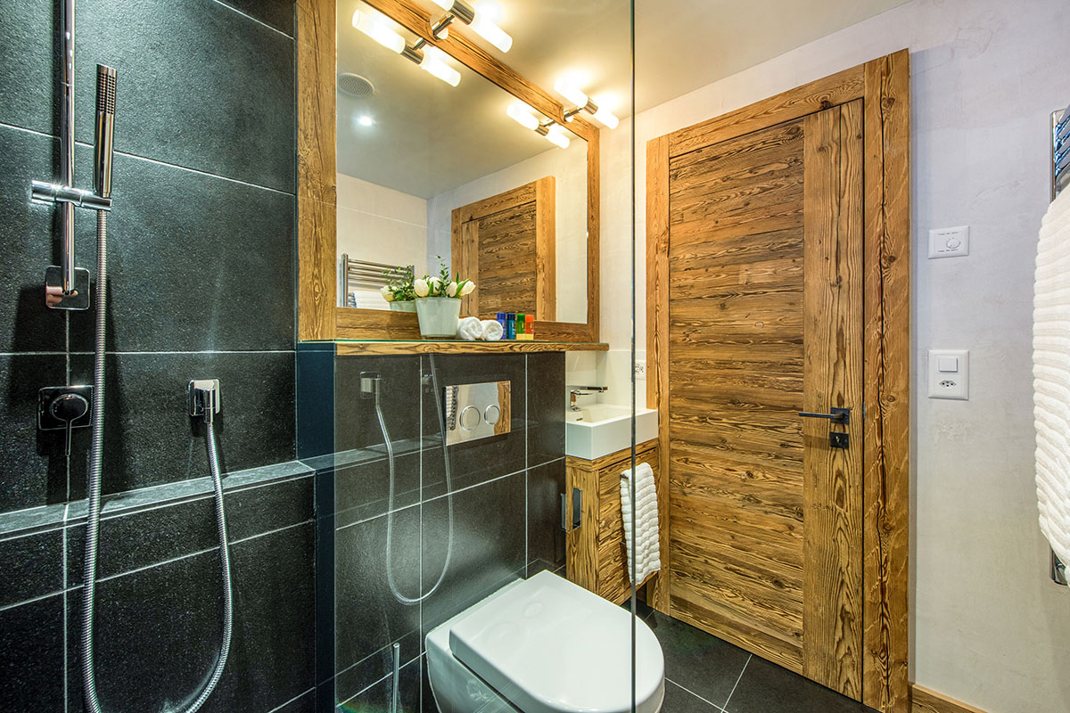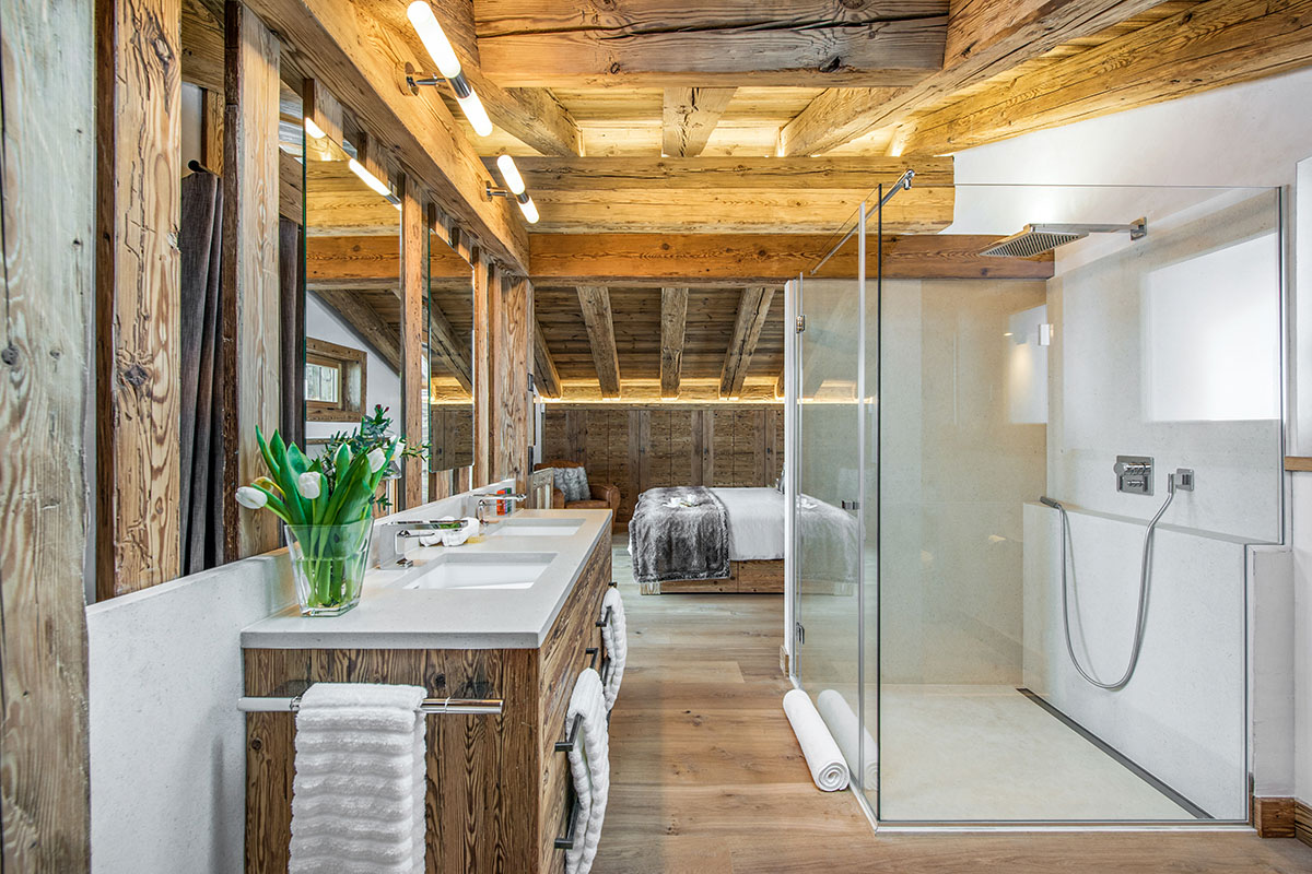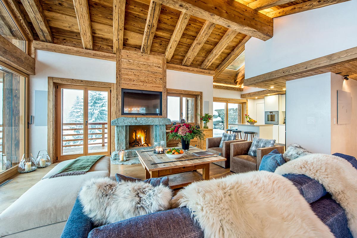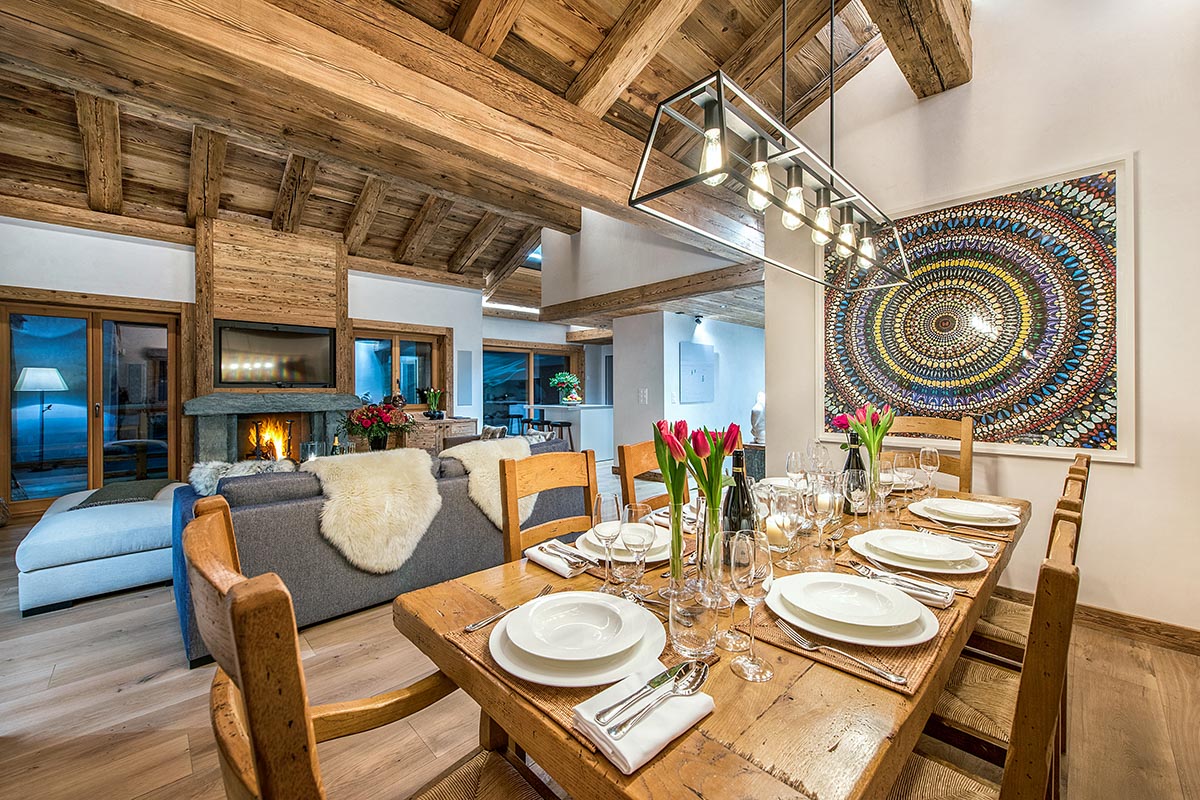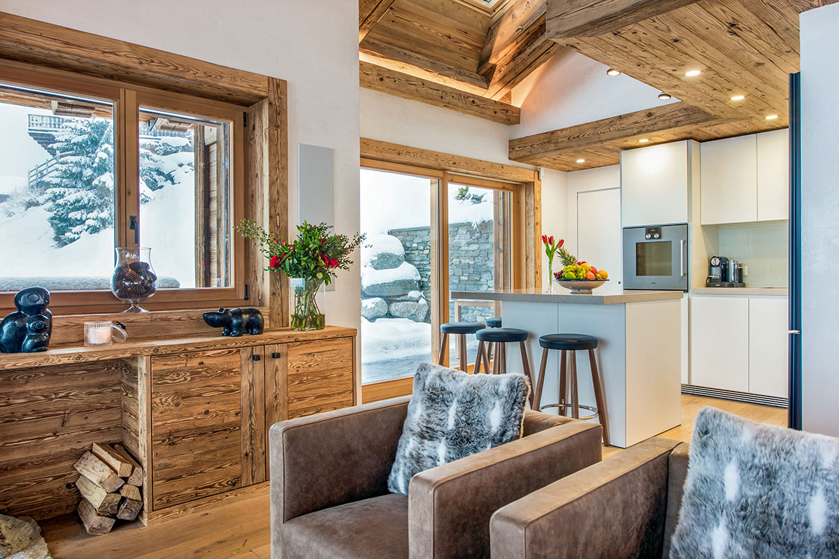 A private driveway leads you to the chalet where you enter the property at the first floor. Here, you will find the open plan living and dining area. The sitting area features a wonderful open fireplace and is surrounded by large plush sofas and arm chairs. Floor-to-ceiling French windows open onto the spacious terrace – a perfect spot for an aperitif on a warmer evening. The fully equipped kitchen features a center island breakfast bar.