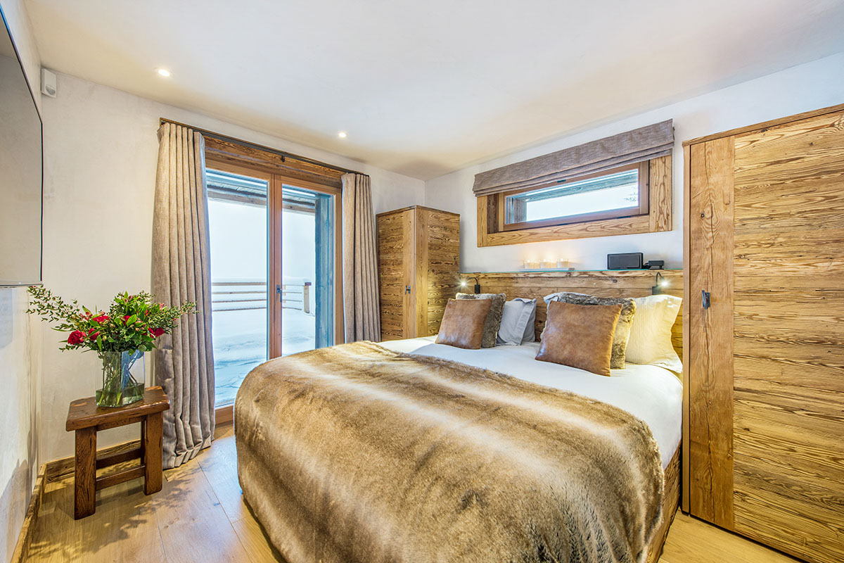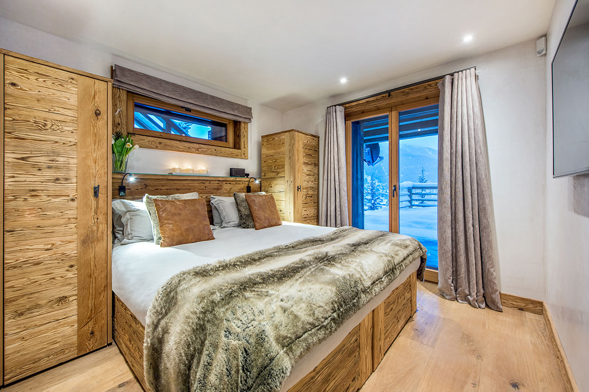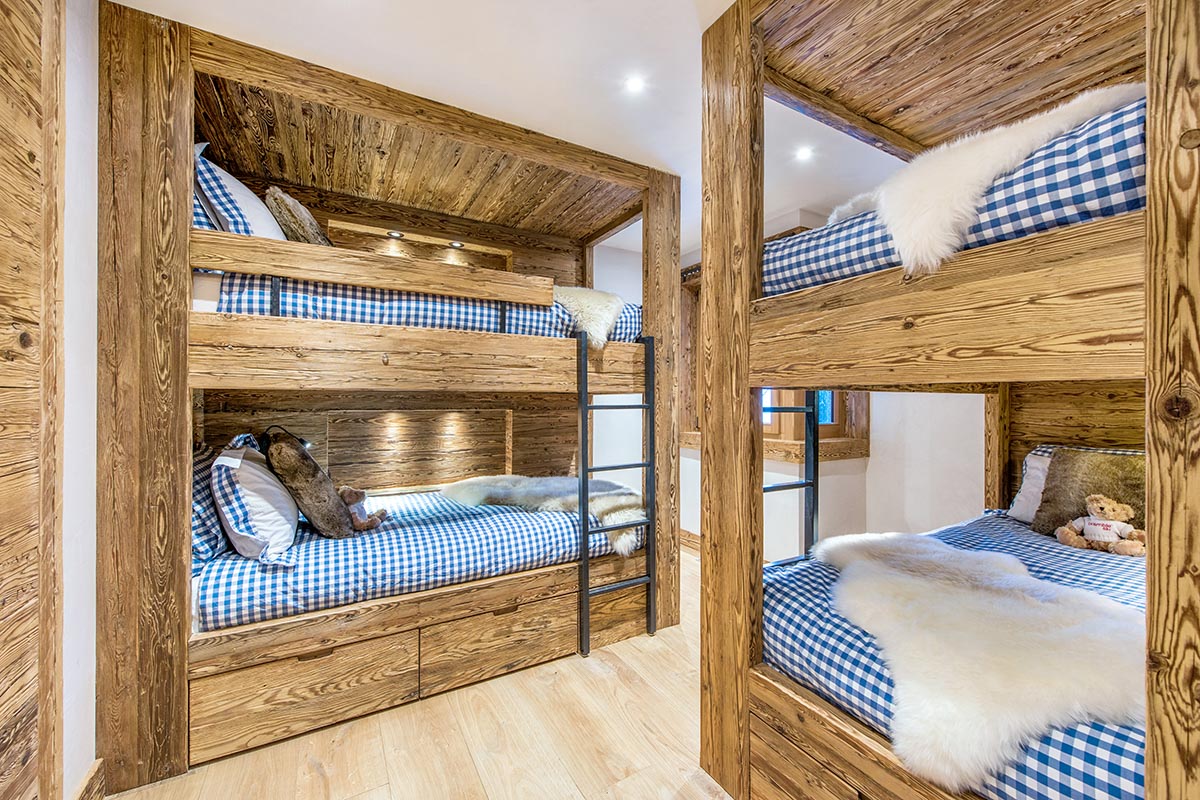 The top floor of the chalet has been dedicated to the master bedroom with a private balcony and en-suite bathroom, a separate shower and his-and-hers sinks. Three bedrooms are located on the next floor as well as the winter entrance and ski room. These three bedrooms consist of two en-suite twin/double bedrooms, each with access to a large terrace, and a further en-suite bunk room with four single beds. Together, this non-smoking villa accommodates up to ten guests.