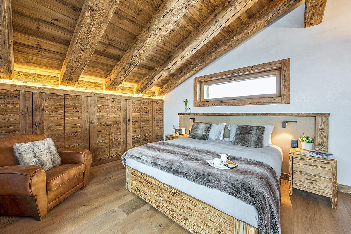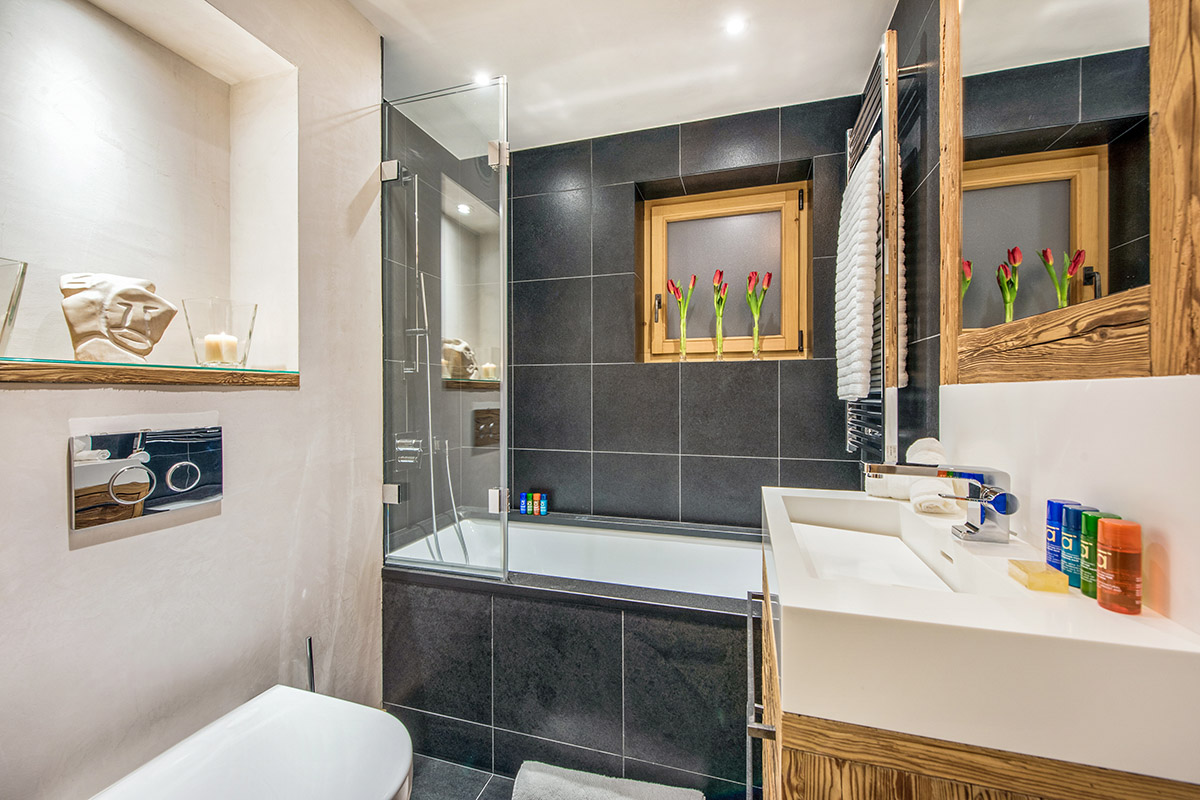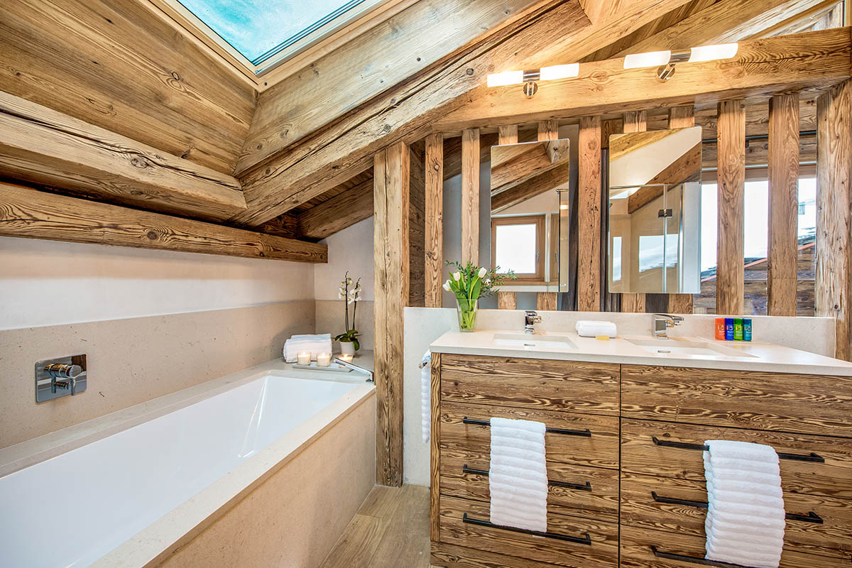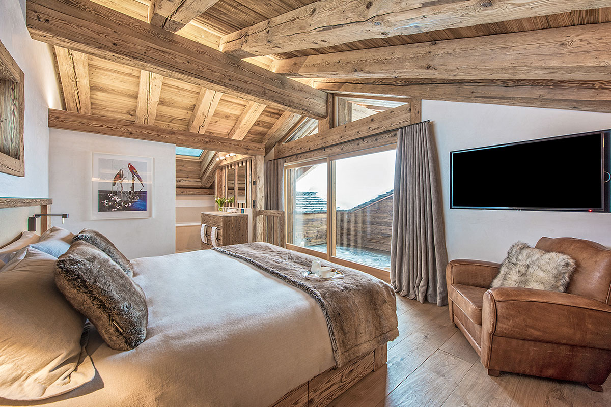 The top floor of the chalet has been dedicated to the master bedroom with a private balcony and en-suite bathroom, a separate shower and his-and-hers sinks. Three bedrooms are located on the next floor as well as the winter entrance and ski room. These three bedrooms consist of two en-suite twin/double bedrooms, each with access to a large terrace, and a further en-suite bunk room with four single beds. Together, this non-smoking villa accommodates up to ten guests.