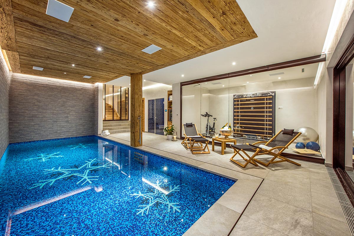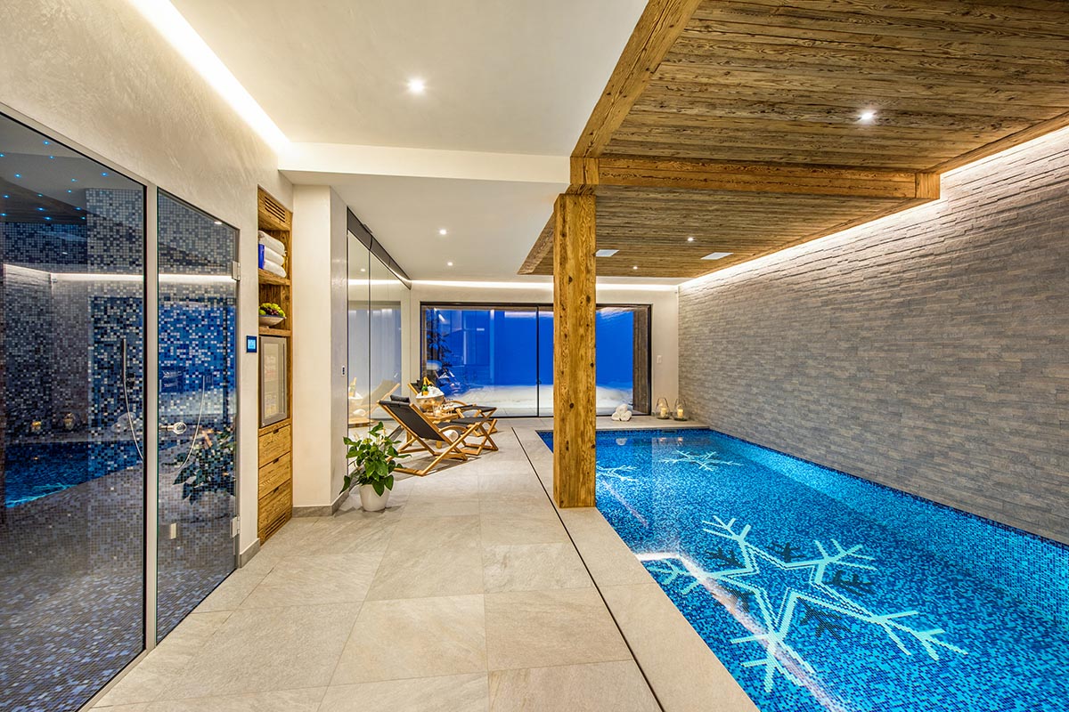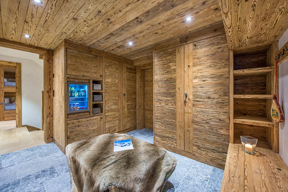 The ground floor houses the impressive private spa, which along with the indoor swimming pool, wine cellar, cinema room, gym and hammam set this villa apart. The spa features huge glass windows and doors so you can check out the latest snow conditions over your morning swim. These open to the terrace with the hot tub. The chalet is fully wired with a Bowers & Wilkins integrated sound and cinema system as well as an Epson projector. La Jarmo offers unparalleled views of the surrounding peaks to be enjoyed from its many terraces and balconies or with a glass of champagne in the outdoor hot tub!