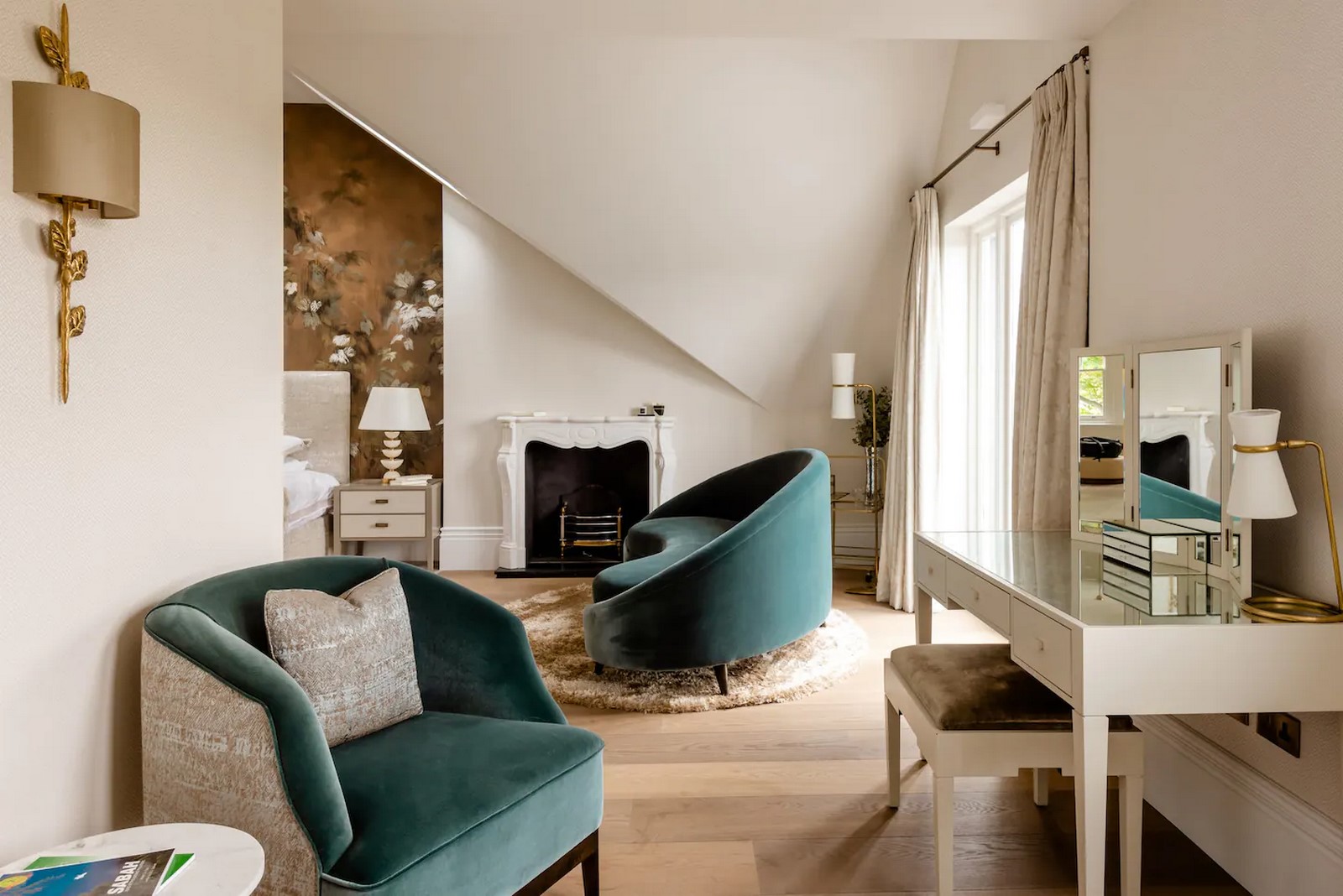 Bedroom 1: UK-King size bed, Ensuite bathroom with stand-alone rain shower & bathtub, Dual vanity, Fireplace, Television, Desk