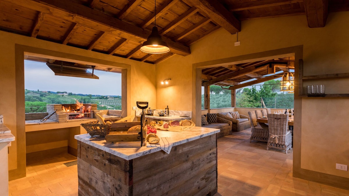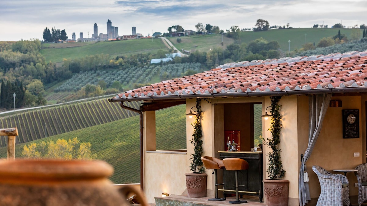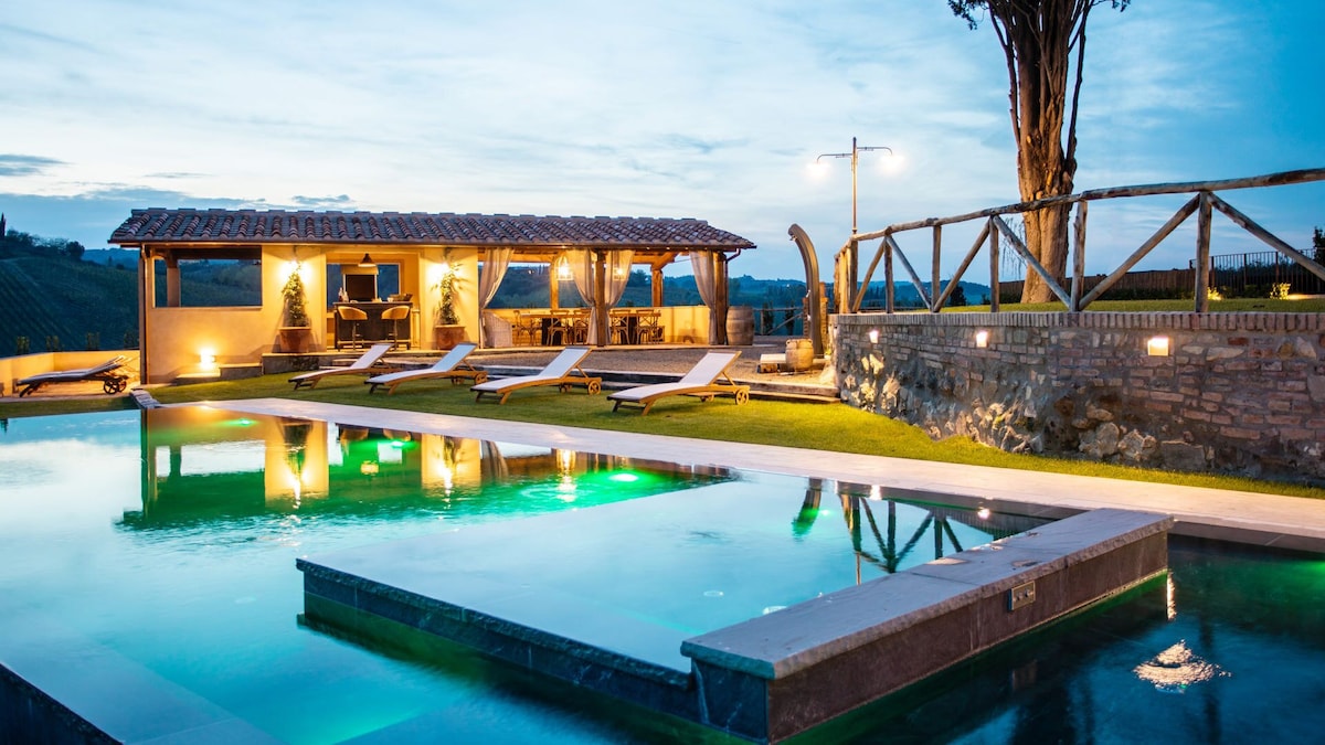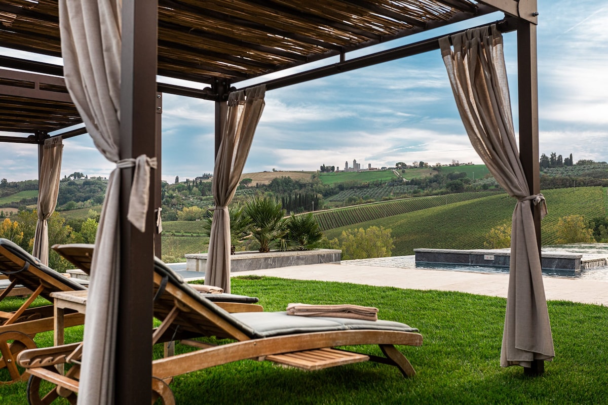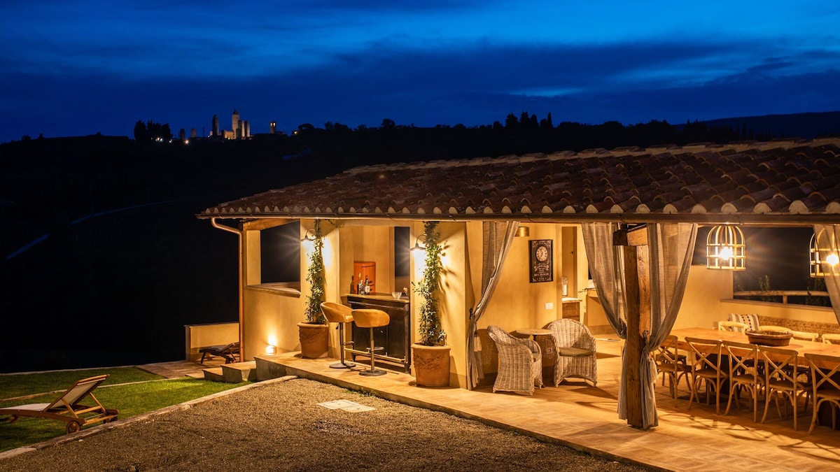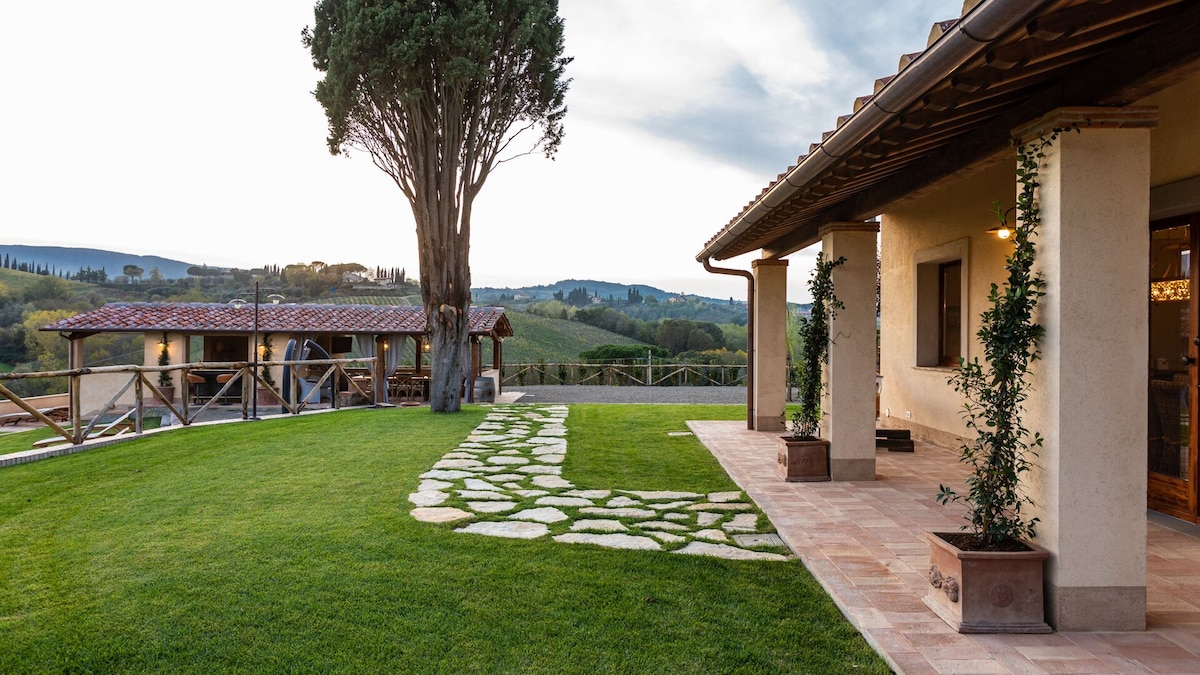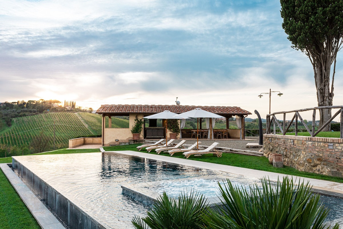 Villa enjoys spectacular views of the famous towers of San Gimignano. A large garden surrounds the entire structure and also the four-sided infinity pool with spa whirlpool, made with valuable stone of Cardoso, renowned local stone.