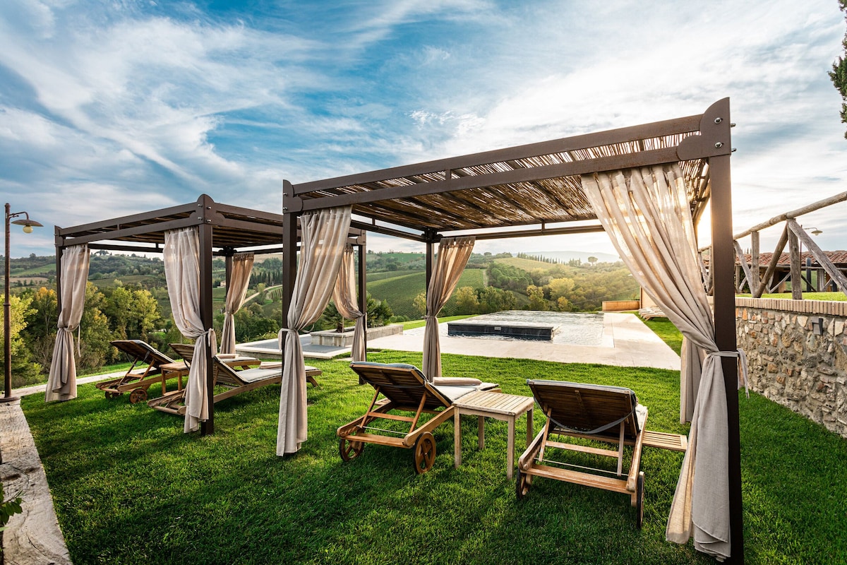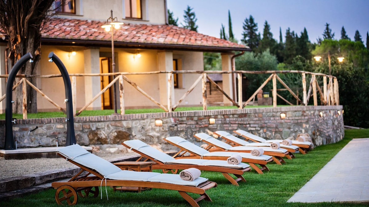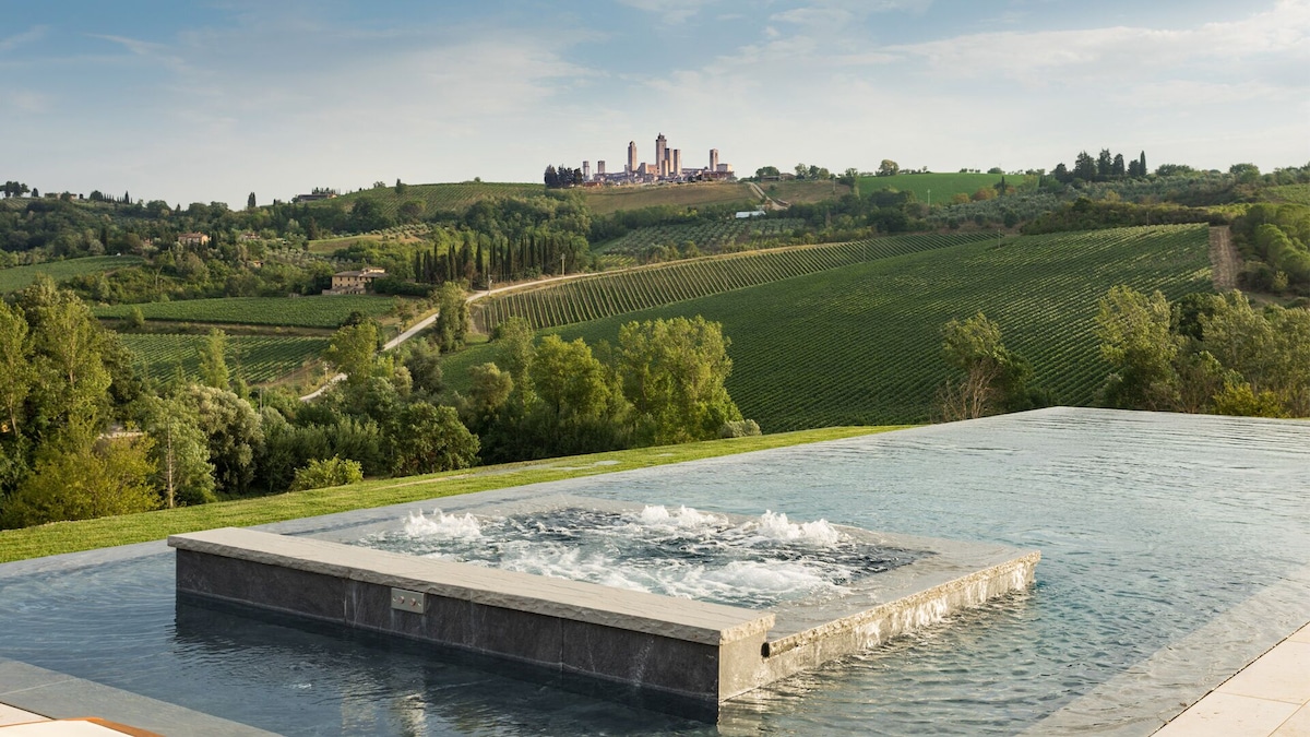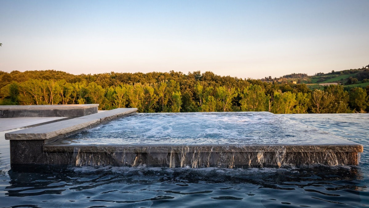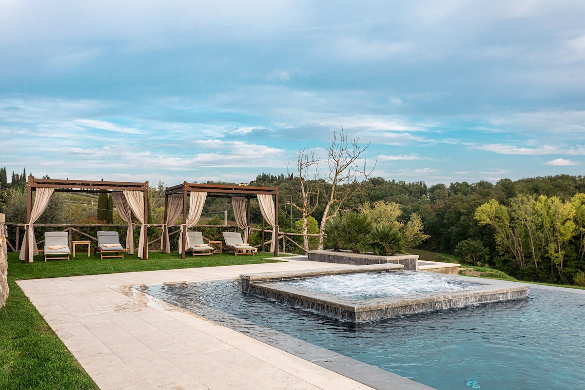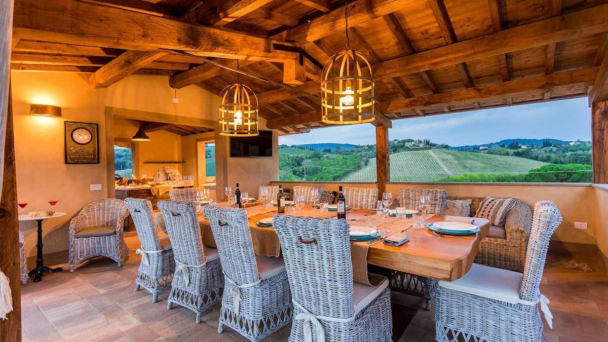 Villa enjoys spectacular views of the famous towers of San Gimignano. A large garden surrounds the entire structure and also the four-sided infinity pool with spa whirlpool, made with valuable stone of Cardoso, renowned local stone.