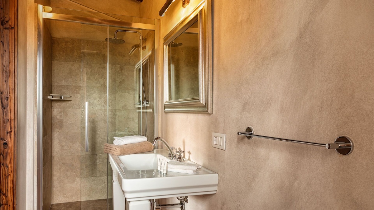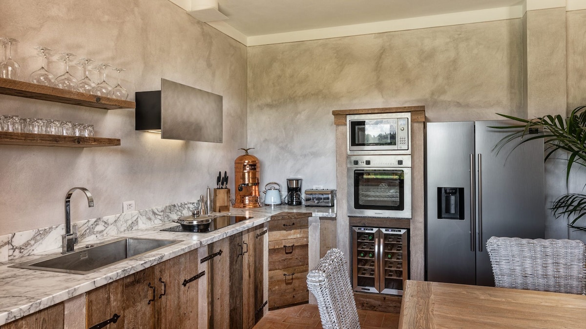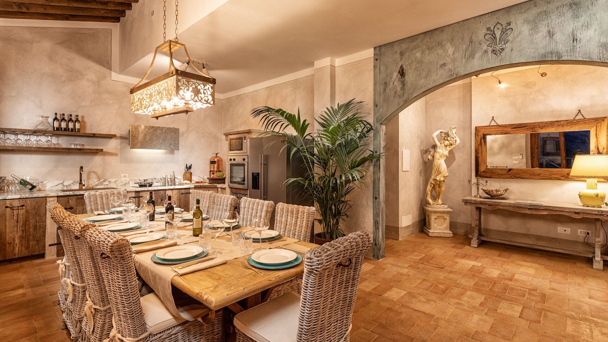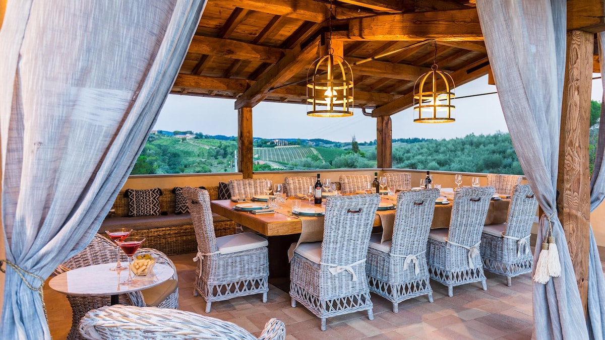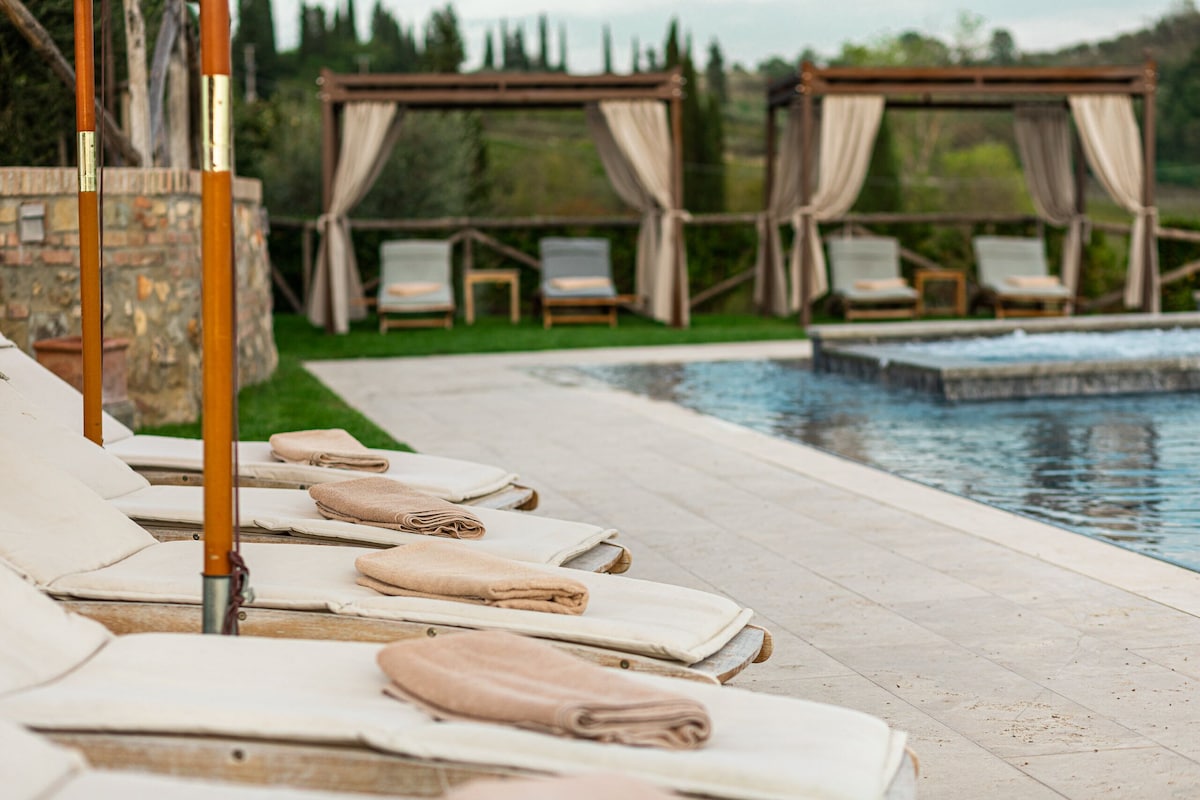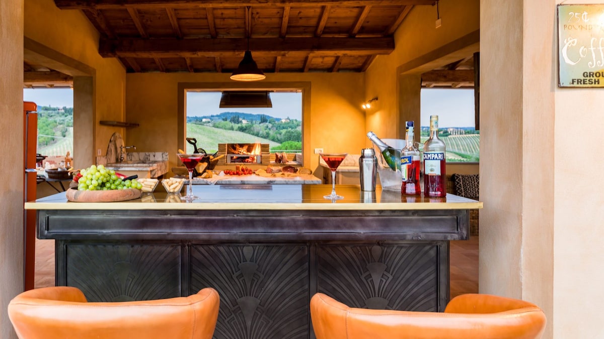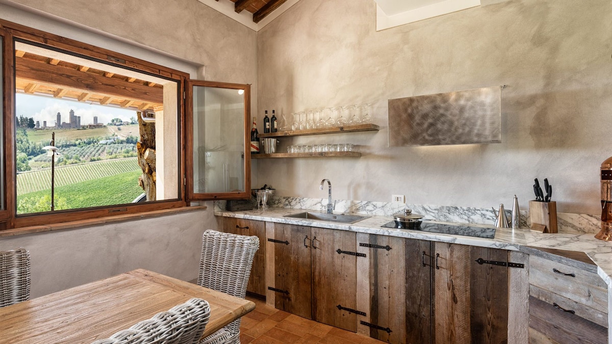 Villa enjoys spectacular views of the famous towers of San Gimignano. A large garden surrounds the entire structure and also the four-sided infinity pool with spa whirlpool, made with valuable stone of Cardoso, renowned local stone.