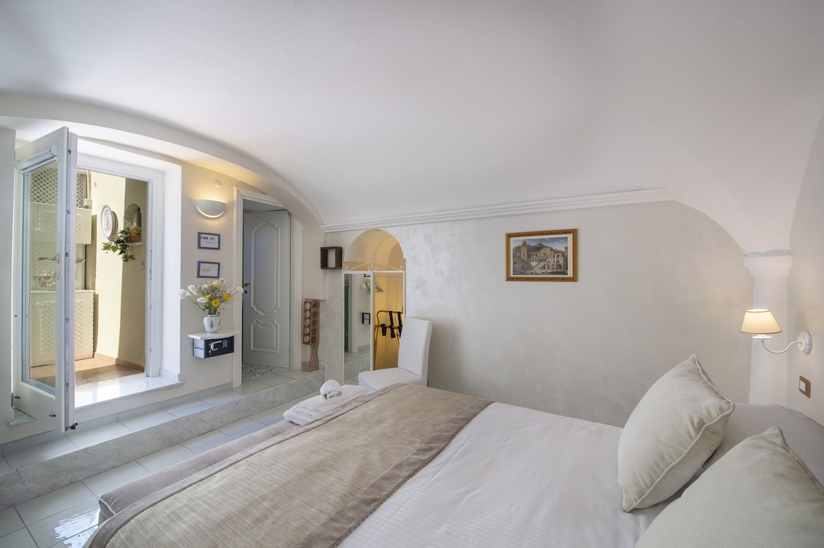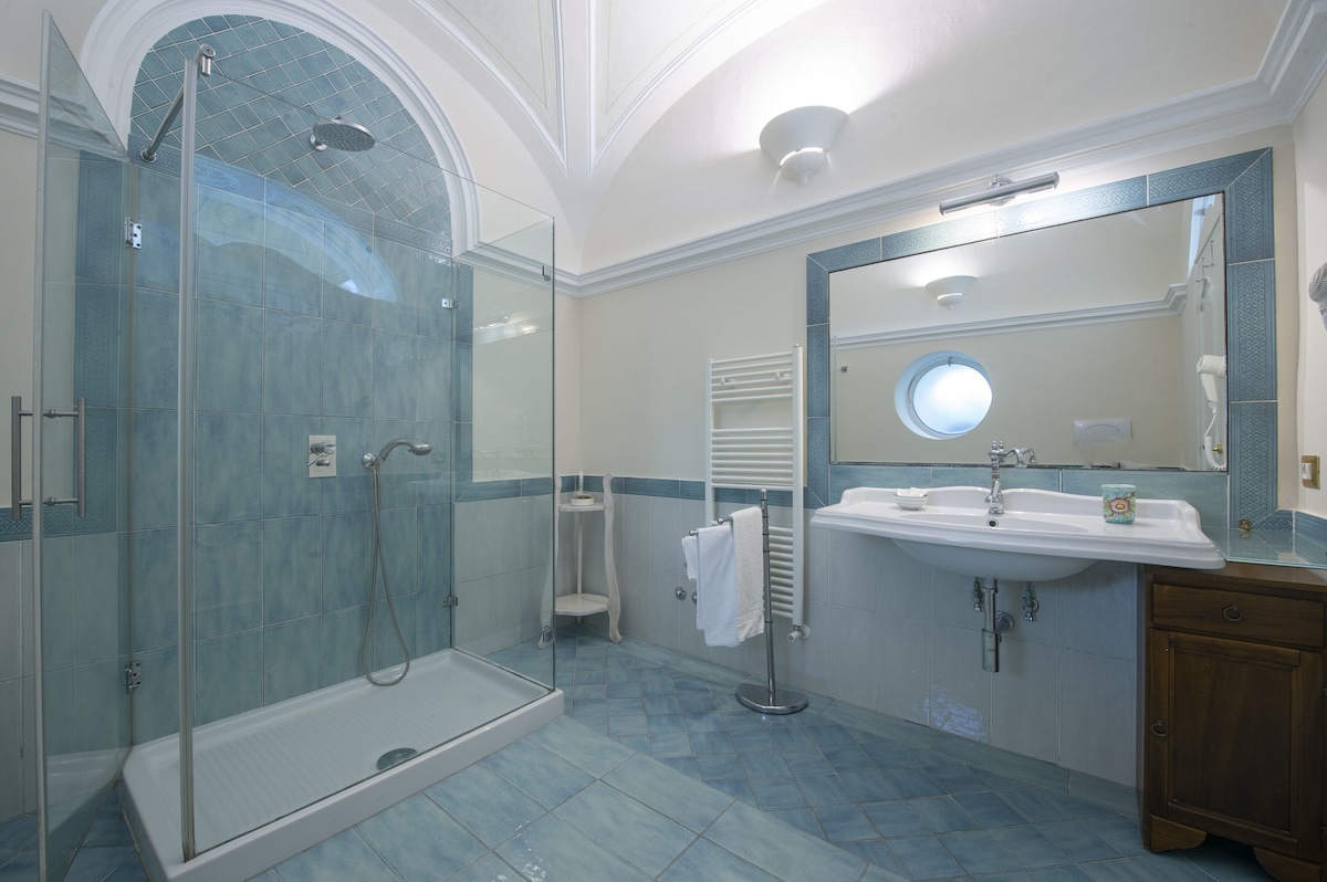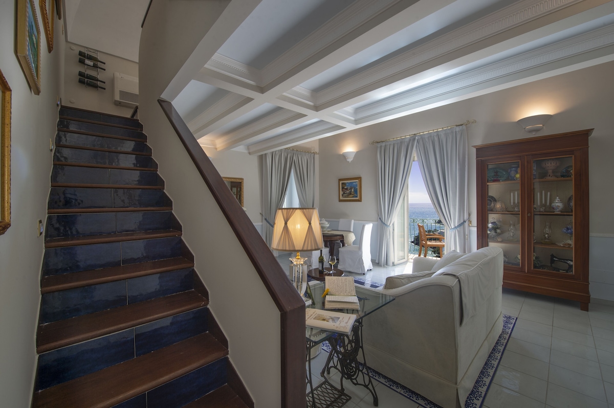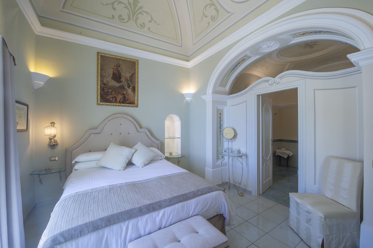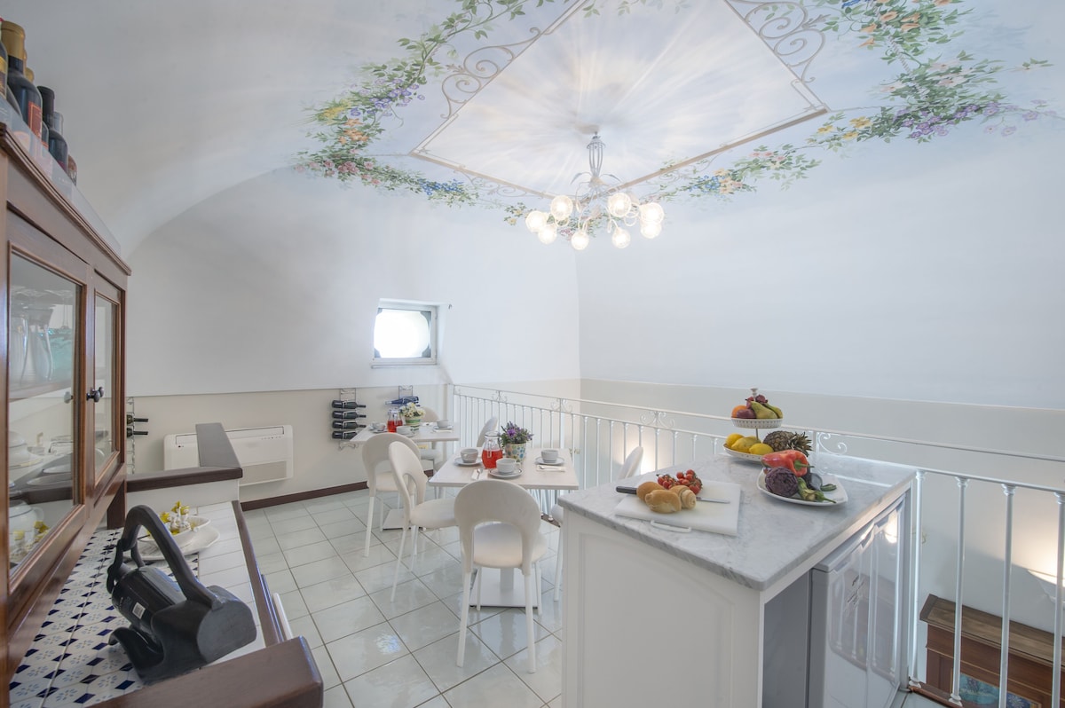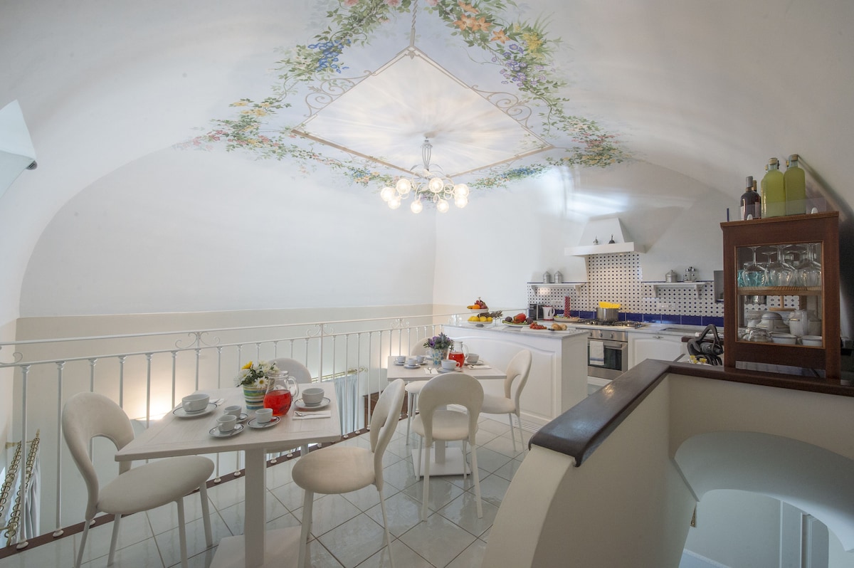 LIVING ROOM with a double sofa-bed 160×190, Tvsat in a mirror frame and balcony/ terrace with panoramic sea view, extendable table for 10 people; 2- a mezzanine floor with kitchen with frescoed ceiling and equipped with living room for a quick breakfast; 3- a double bedroom King size, called SUITE THE ANCIENT CHAPEL, with bathroom with frescoed walls with shower 120×90, Tvsat, safe, private balcony/ terrace with spectacular sea view; 4- a double bedroom (on request two single beds), called LIMONETO, with bathroom with shower 120×80, dressing room, Tvsat , mini fridge, safe, window overlooking the lemon garden and side sea;