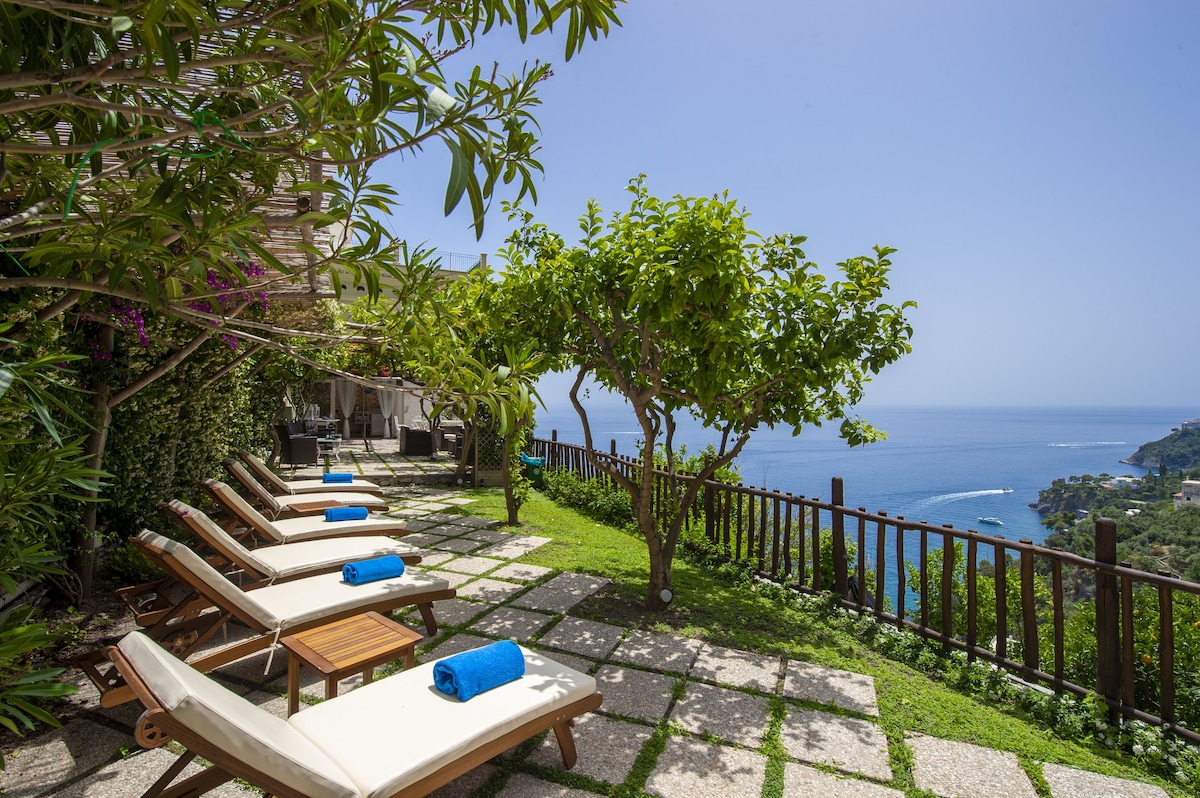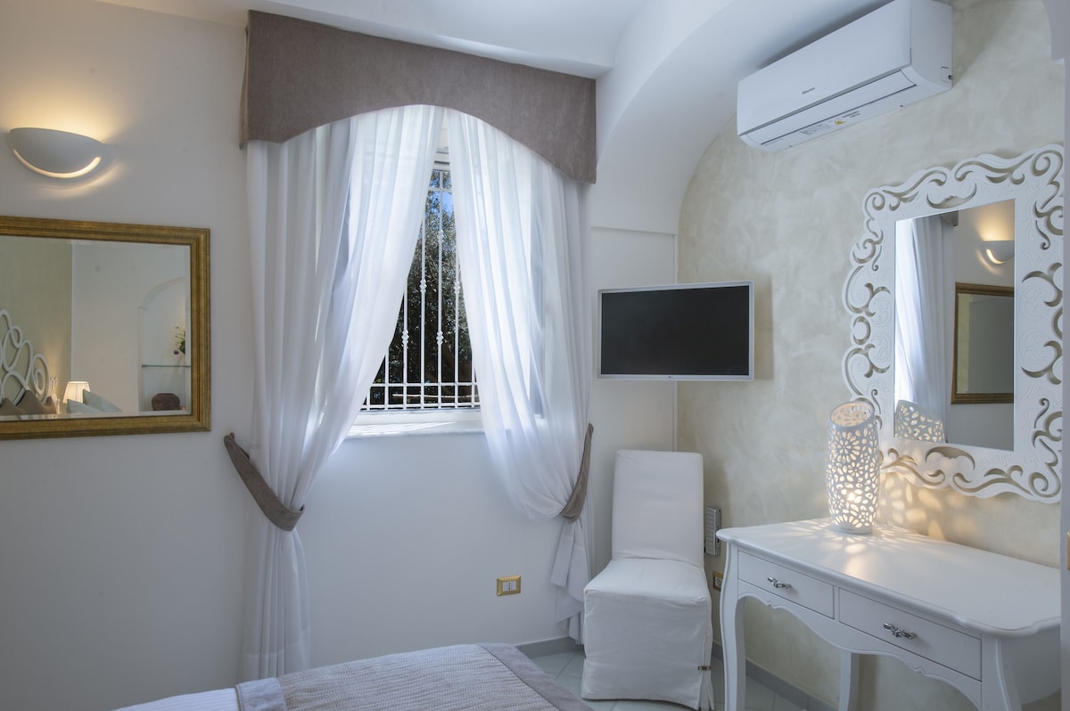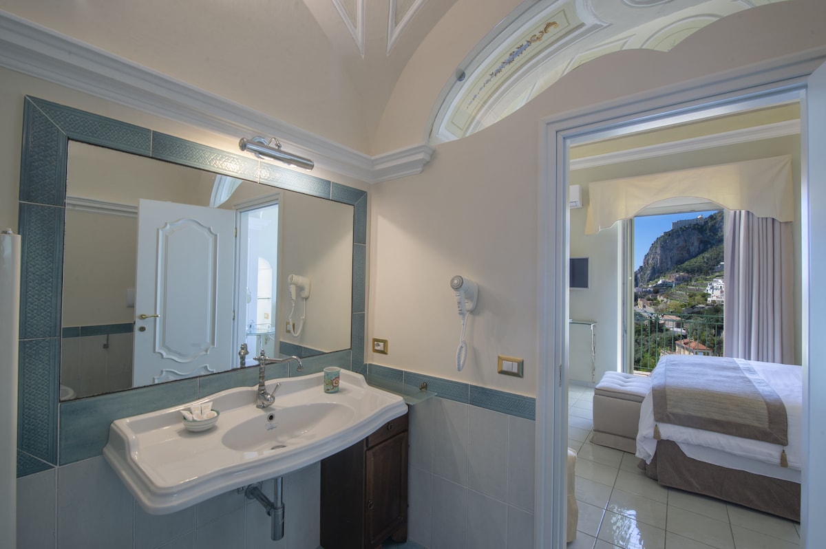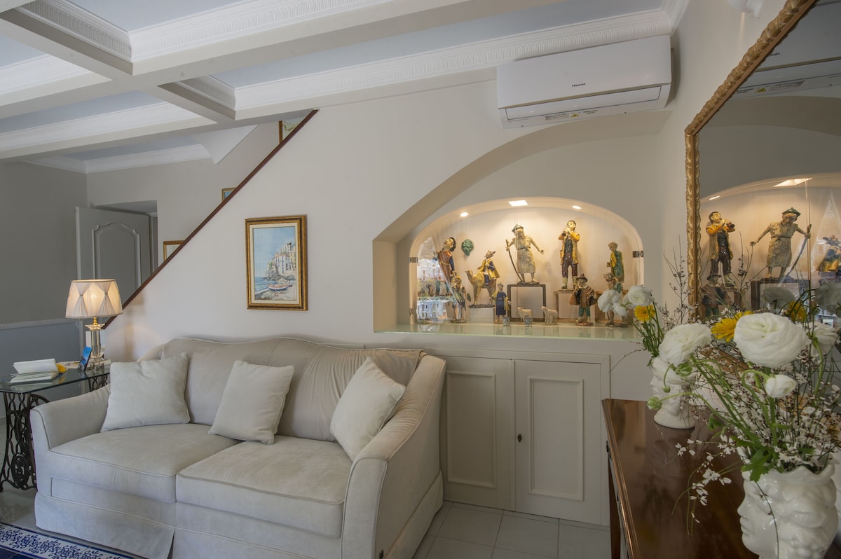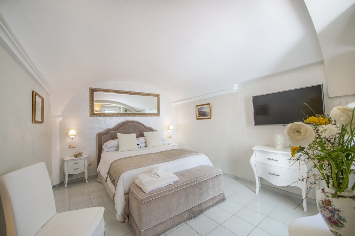 LIVING ROOM with a double sofa-bed 160×190, Tvsat in a mirror frame and balcony/ terrace with panoramic sea view, extendable table for 10 people; 2- a mezzanine floor with kitchen with frescoed ceiling and equipped with living room for a quick breakfast; 3- a double bedroom King size, called SUITE THE ANCIENT CHAPEL, with bathroom with frescoed walls with shower 120×90, Tvsat, safe, private balcony/ terrace with spectacular sea view; 4- a double bedroom (on request two single beds), called LIMONETO, with bathroom with shower 120×80, dressing room, Tvsat , mini fridge, safe, window overlooking the lemon garden and side sea;
