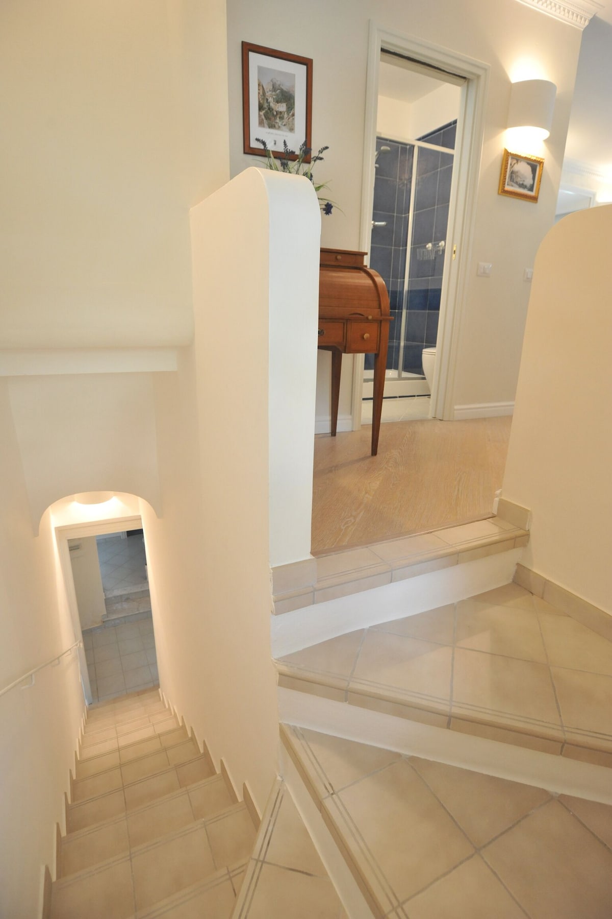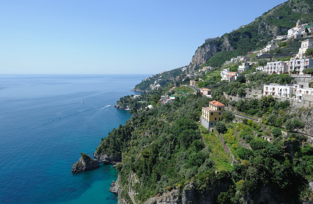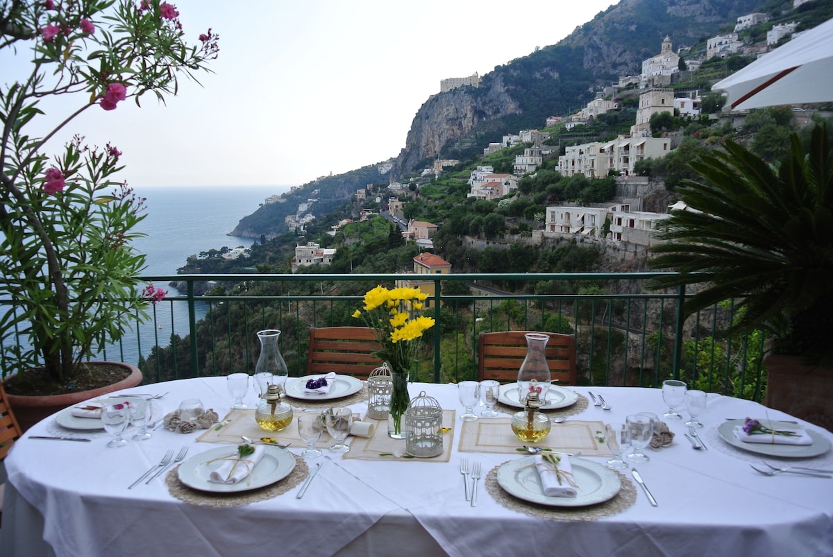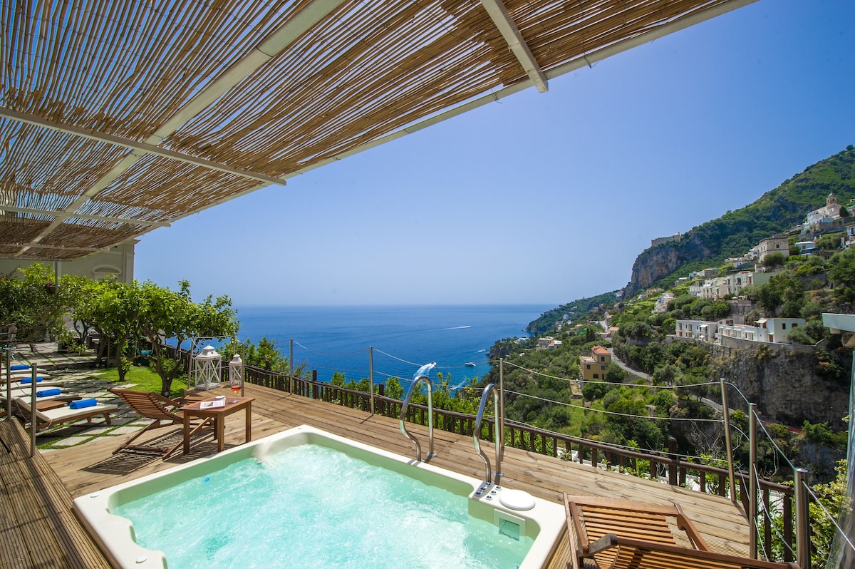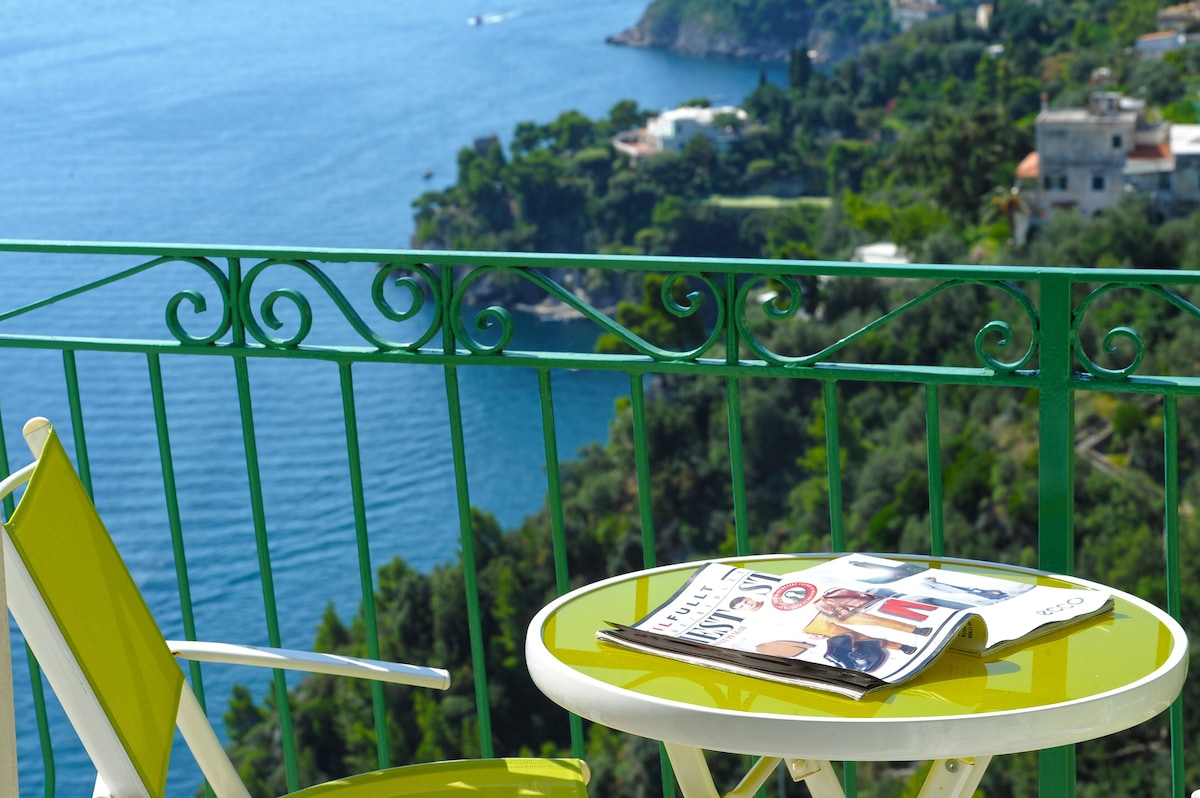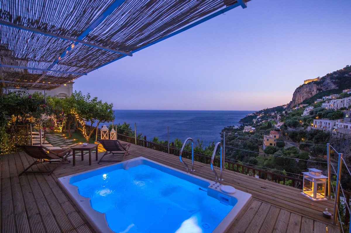 LIVING ROOM with a double sofa-bed 160×190, Tvsat in a mirror frame and balcony/ terrace with panoramic sea view, extendable table for 10 people; 2- a mezzanine floor with kitchen with frescoed ceiling and equipped with living room for a quick breakfast; 3- a double bedroom King size, called SUITE THE ANCIENT CHAPEL, with bathroom with frescoed walls with shower 120×90, Tvsat, safe, private balcony/ terrace with spectacular sea view; 4- a double bedroom (on request two single beds), called LIMONETO, with bathroom with shower 120×80, dressing room, Tvsat , mini fridge, safe, window overlooking the lemon garden and side sea;