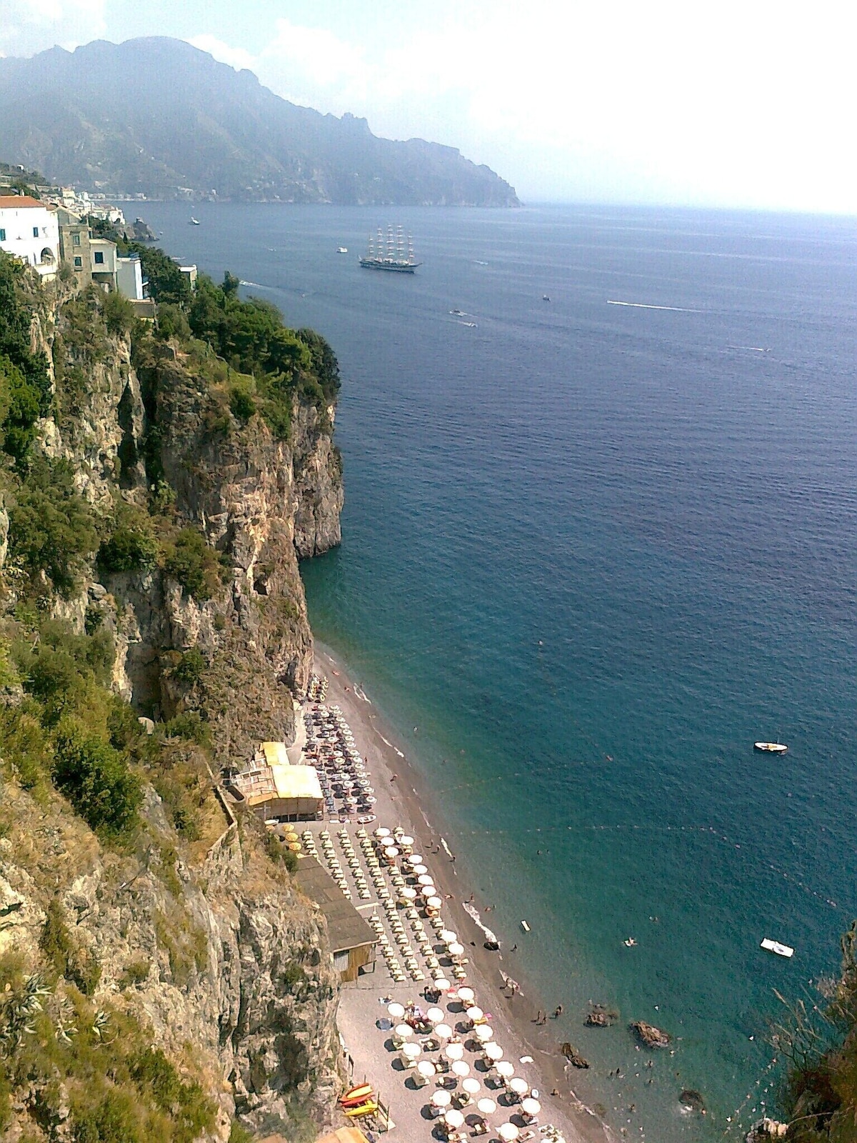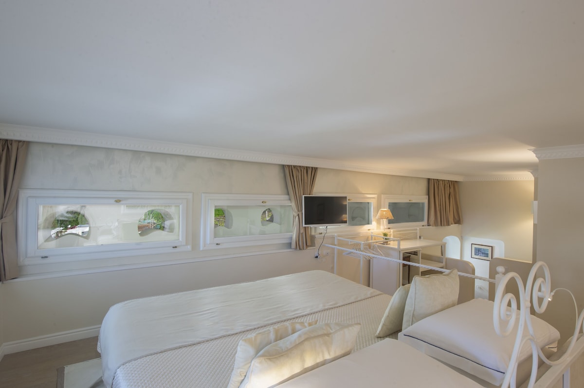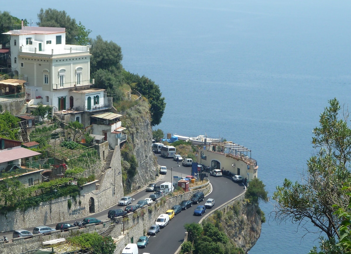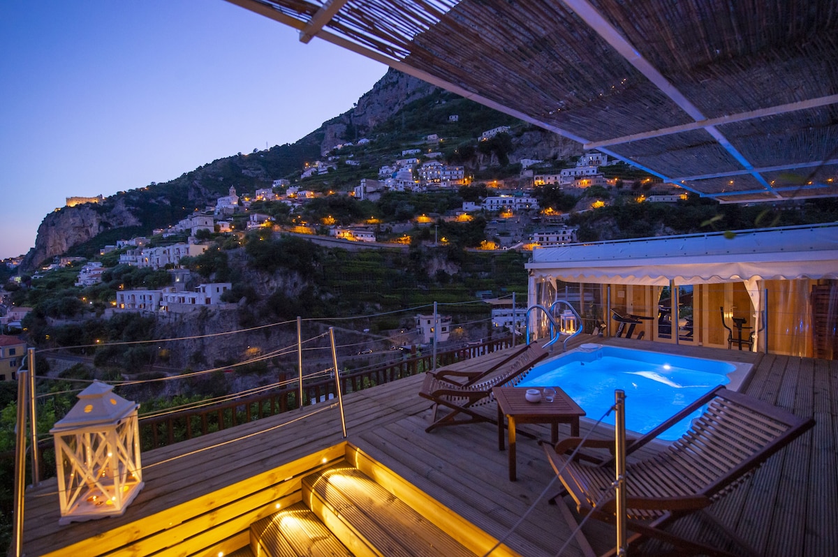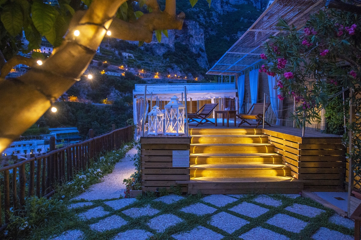 LIVING ROOM with a double sofa-bed 160×190, Tvsat in a mirror frame and balcony/ terrace with panoramic sea view, extendable table for 10 people; 2- a mezzanine floor with kitchen with frescoed ceiling and equipped with living room for a quick breakfast; 3- a double bedroom King size, called SUITE THE ANCIENT CHAPEL, with bathroom with frescoed walls with shower 120×90, Tvsat, safe, private balcony/ terrace with spectacular sea view; 4- a double bedroom (on request two single beds), called LIMONETO, with bathroom with shower 120×80, dressing room, Tvsat , mini fridge, safe, window overlooking the lemon garden and side sea;