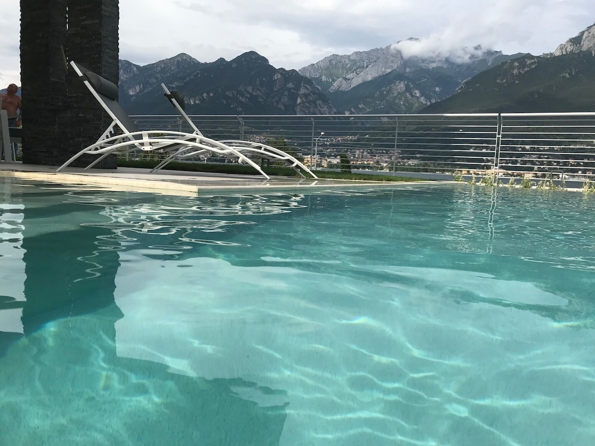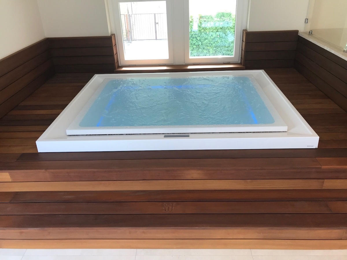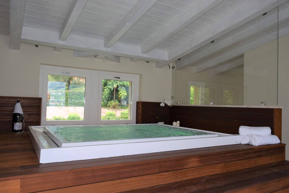 Facing the lake with outdoor pool and private beach, indoor mini-pool with whirlpool and chromotherapy.