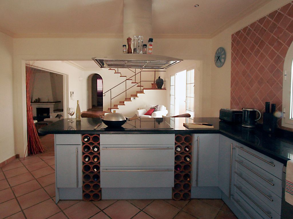 Open plan fully fitted kitchen with induction hob, oven, microwave, fridge/freezer with direct access to the garden and B.B.Q. area