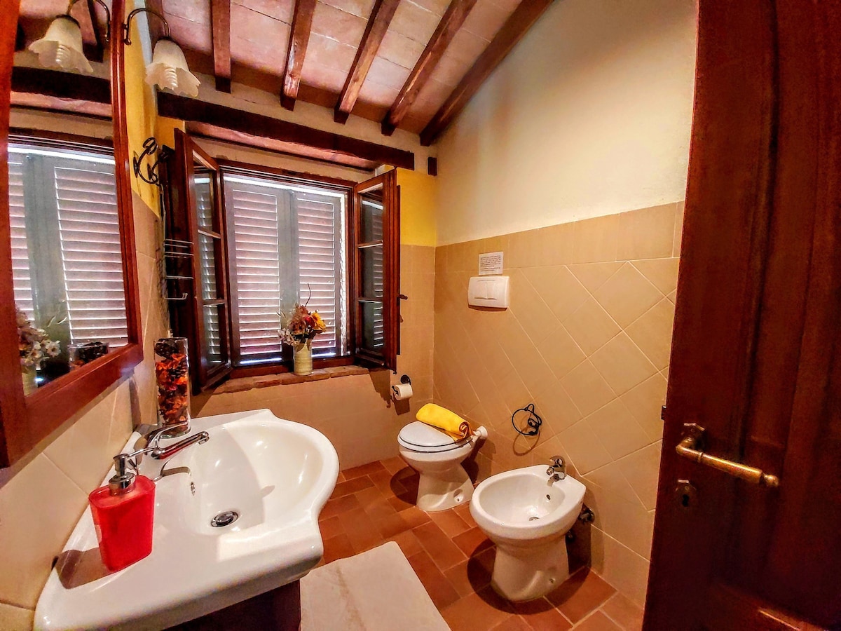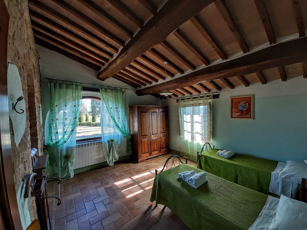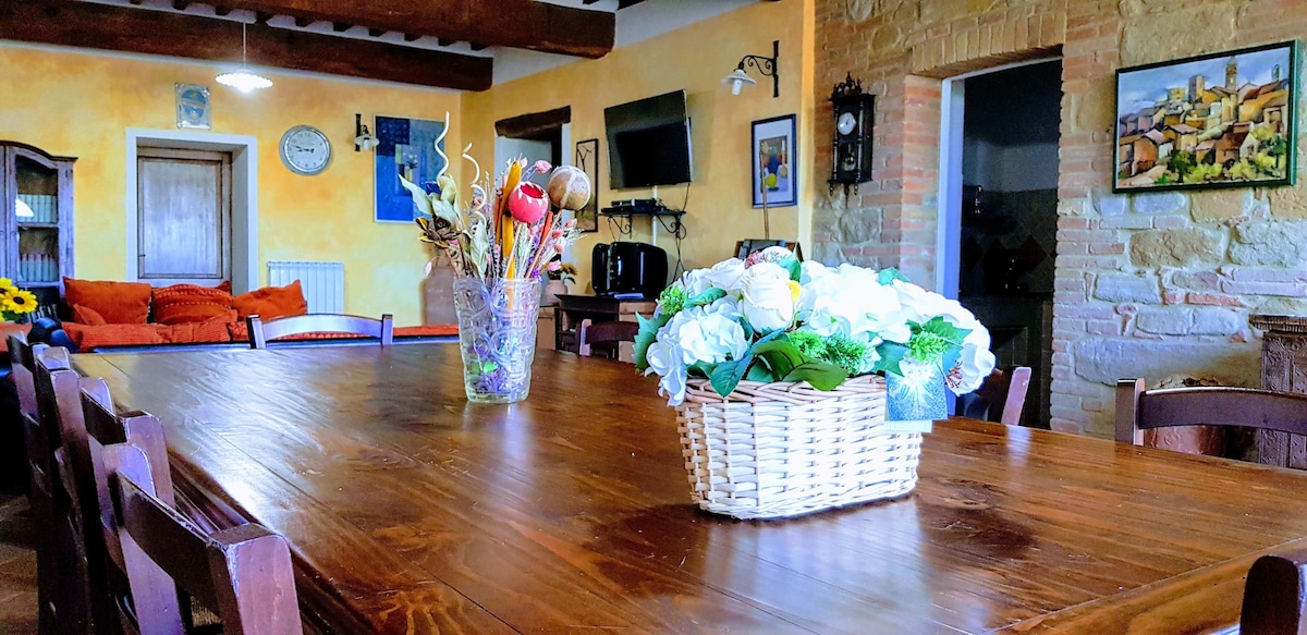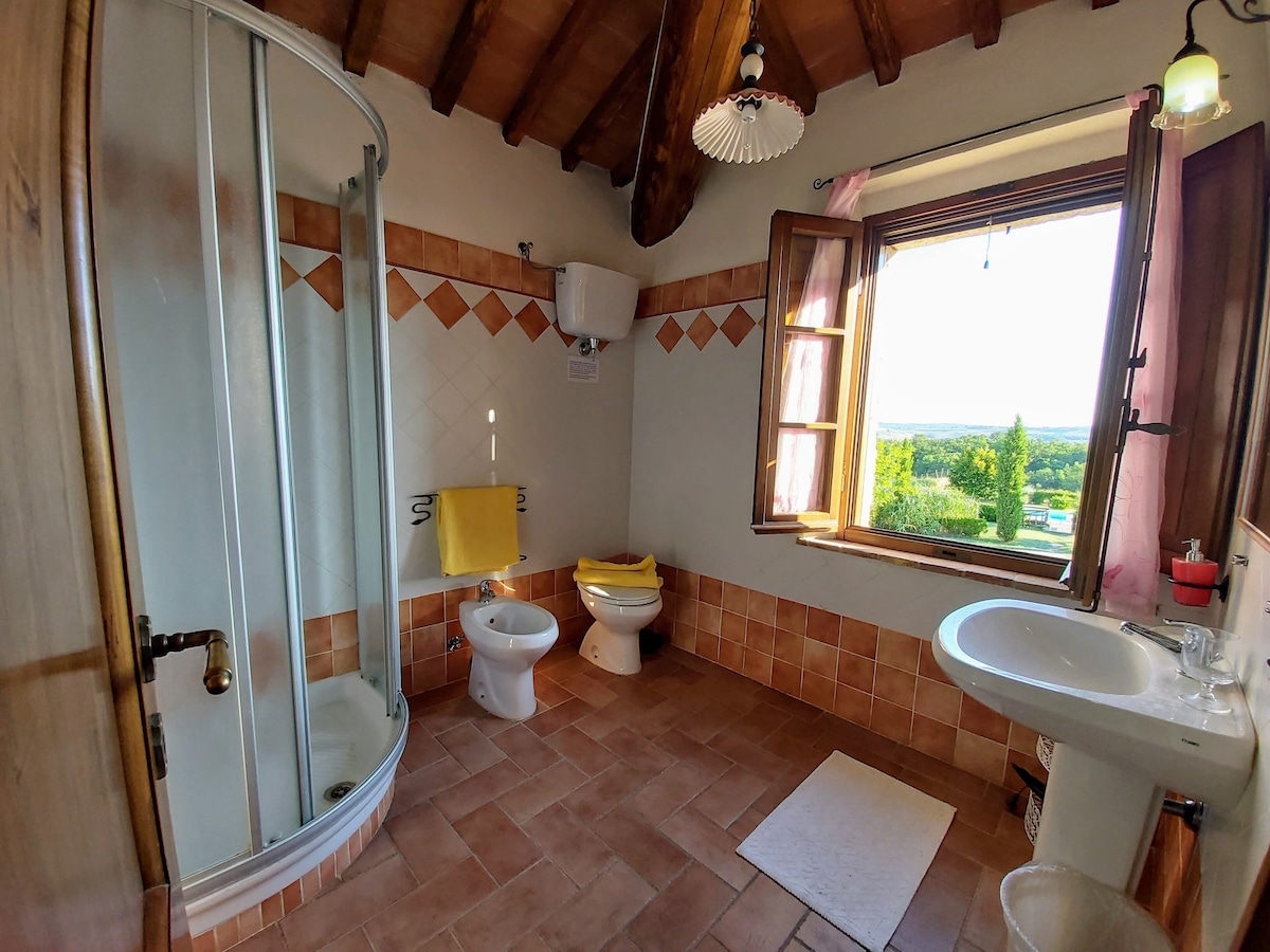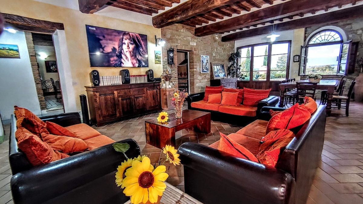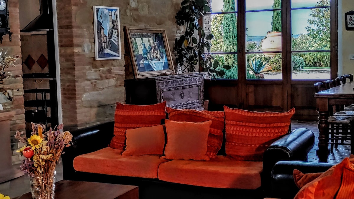 The villa has 4 beautiful double beds and one bedroom with 2 beds. On the first floor there are 3 double bedrooms and 2 bathrooms, one with hydro and shower. Two bedrooms, one double and one bedroom with 2 single beds are on the ground floor, there are 2 bathrooms on the ground floor. We rent the entire property. The spacious bedrooms have been decorated in elegant colours. On the ground floor there is a large living room of about 60 square meters with 3 sofas and a large table, there is a large 75-inch satellite TV, a stereo radio and a bluetooth speaker for your relaxation. Next door is the dining room about 30 square meters with a fantastic traditional fireplace, the dining room leads to the pergola equipped with 2 sofas and a large table for dining and you can admire the breathtaking views of the rolling Tuscan hills all around and hear the sound of silence.