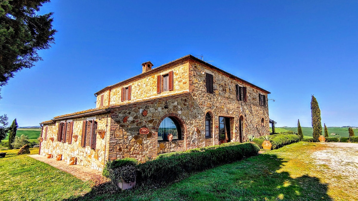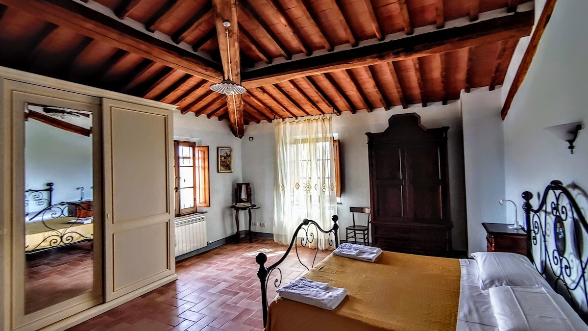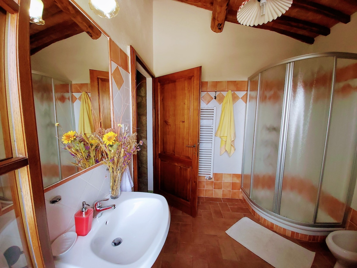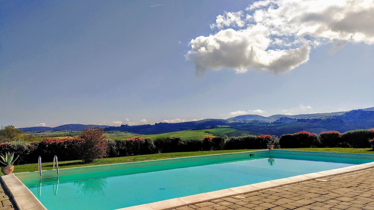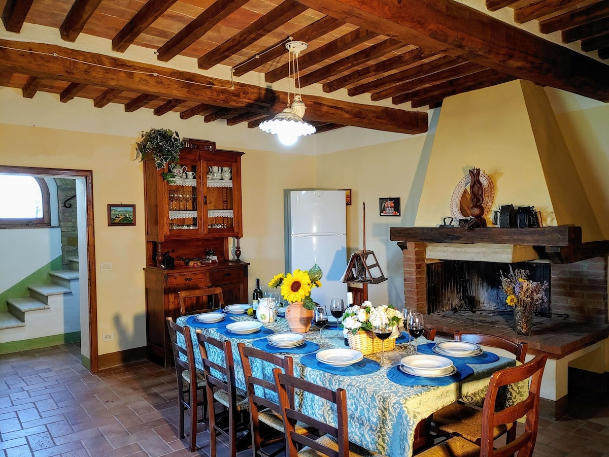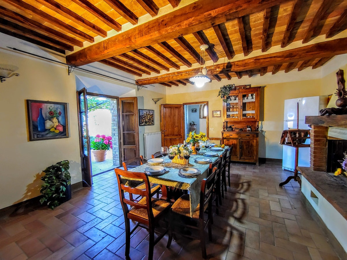The villa has 4 beautiful double beds and one bedroom with 2 beds. On the first floor there are 3 double bedrooms and 2 bathrooms, one with hydro and shower. Two bedrooms, one double and one bedroom with 2 single beds are on the ground floor, there are 2 bathrooms on the ground floor. We rent the entire property. The spacious bedrooms have been decorated in elegant colours. On the ground floor there is a large living room of about 60 square meters with 3 sofas and a large table, there is a large 75-inch satellite TV, a stereo radio and a bluetooth speaker for your relaxation. Next door is the dining room about 30 square meters with a fantastic traditional fireplace, the dining room leads to the pergola equipped with 2 sofas and a large table for dining and you can admire the breathtaking views of the rolling Tuscan hills all around and hear the sound of silence.