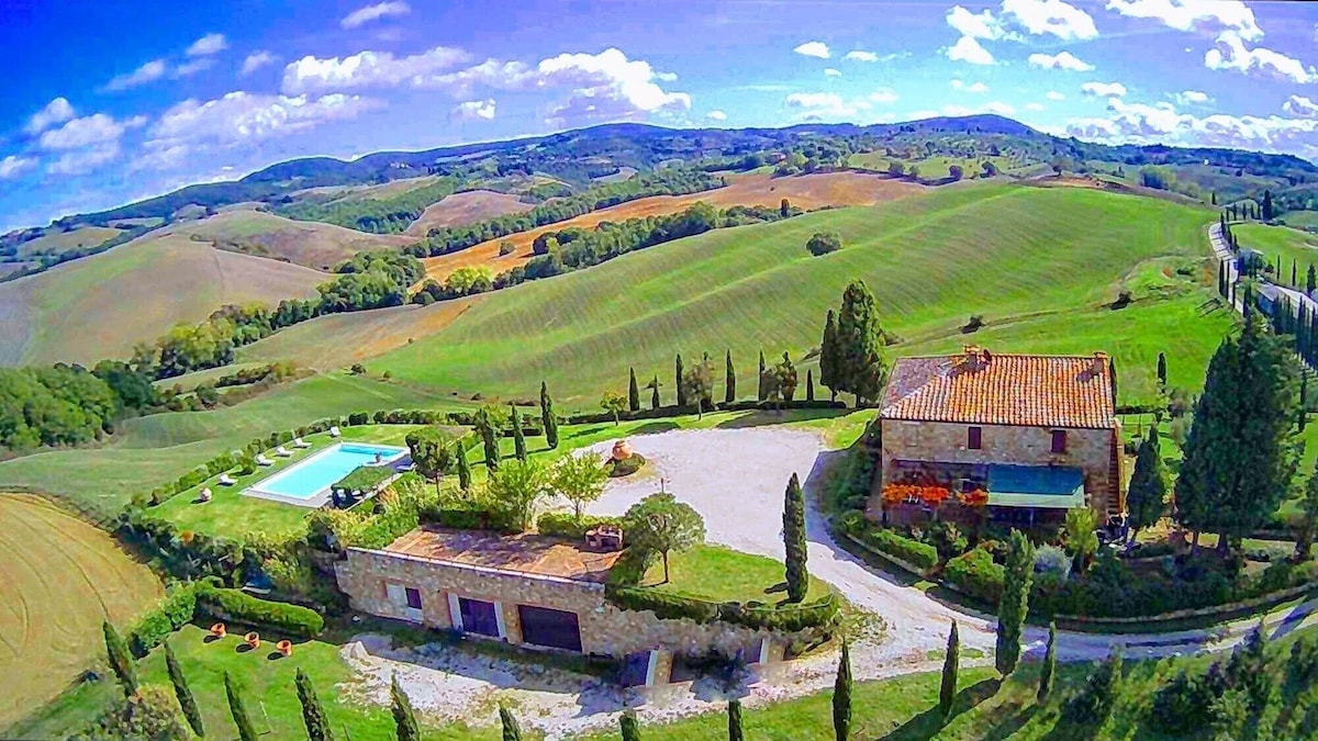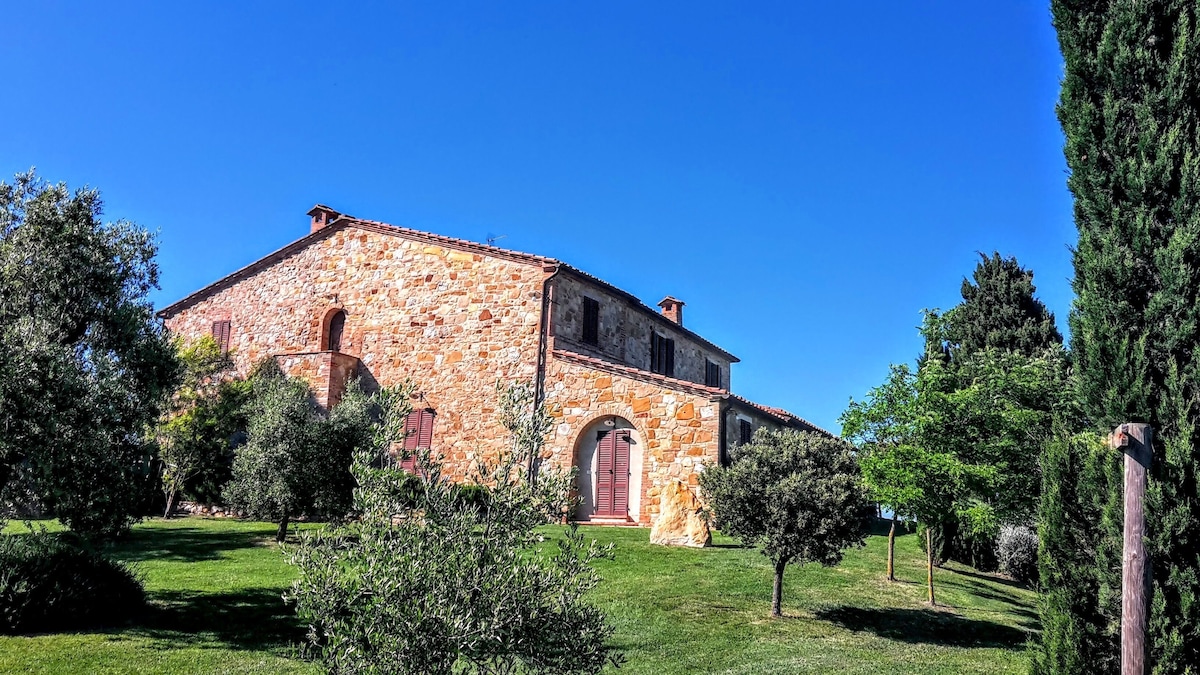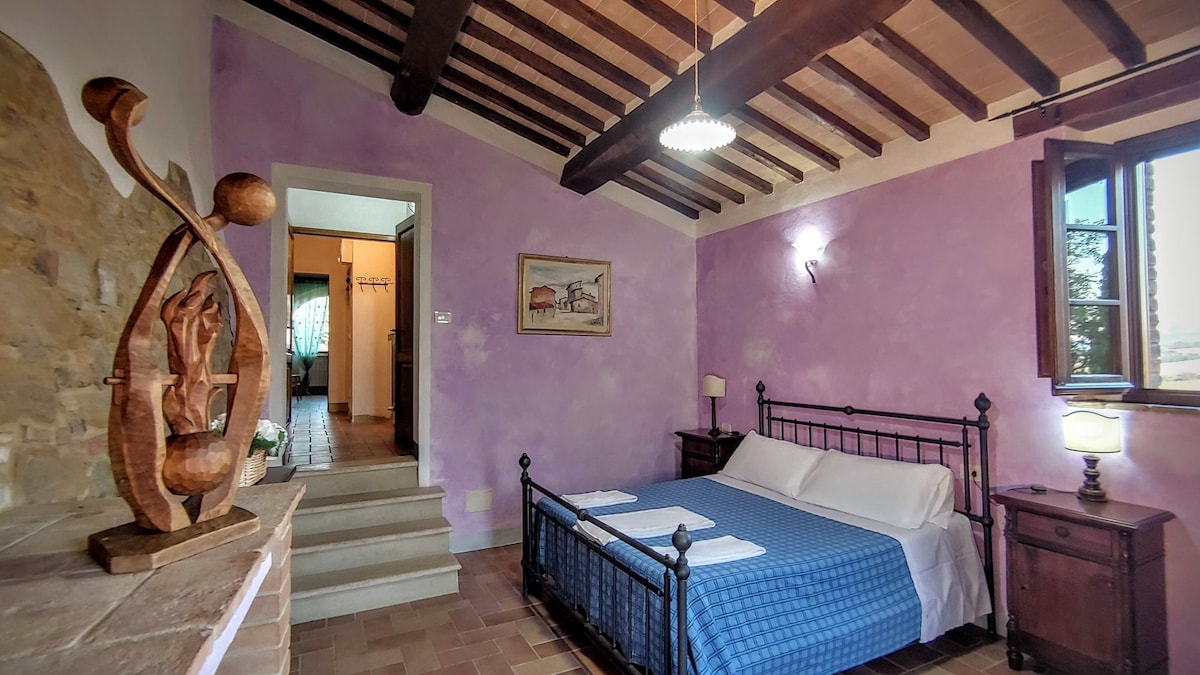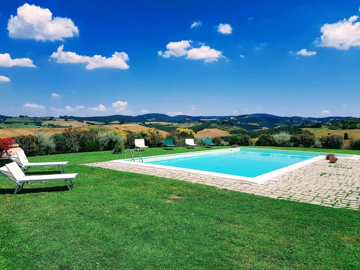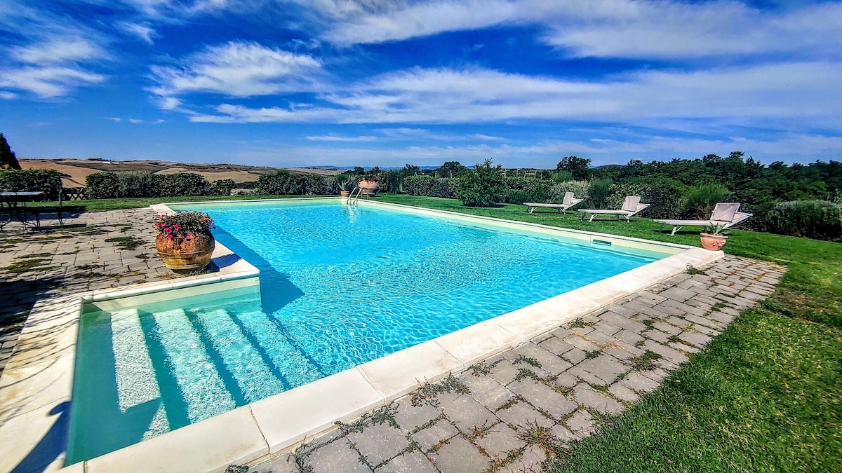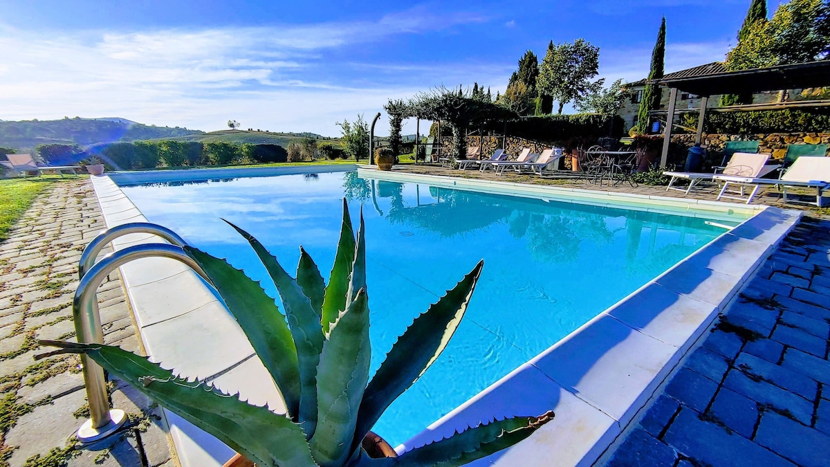 The villa has 4 beautiful double beds and one bedroom with 2 beds. On the first floor there are 3 double bedrooms and 2 bathrooms, one with hydro and shower. Two bedrooms, one double and one bedroom with 2 single beds are on the ground floor, there are 2 bathrooms on the ground floor. We rent the entire property. The spacious bedrooms have been decorated in elegant colours. On the ground floor there is a large living room of about 60 square meters with 3 sofas and a large table, there is a large 75-inch satellite TV, a stereo radio and a bluetooth speaker for your relaxation. Next door is the dining room about 30 square meters with a fantastic traditional fireplace, the dining room leads to the pergola equipped with 2 sofas and a large table for dining and you can admire the breathtaking views of the rolling Tuscan hills all around and hear the sound of silence.