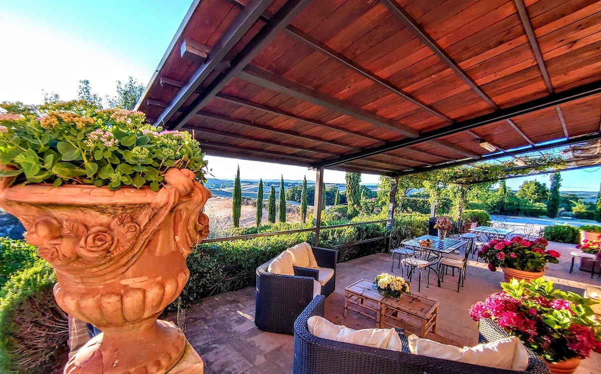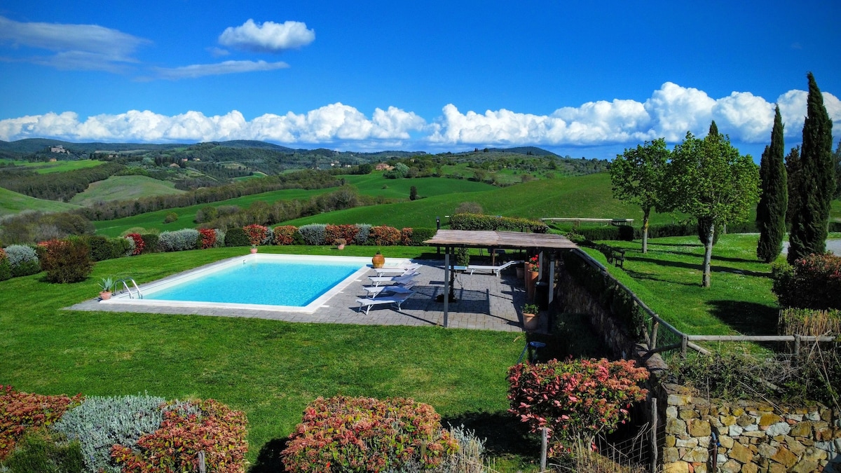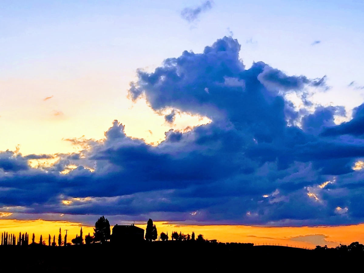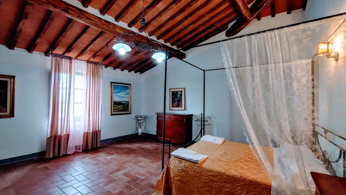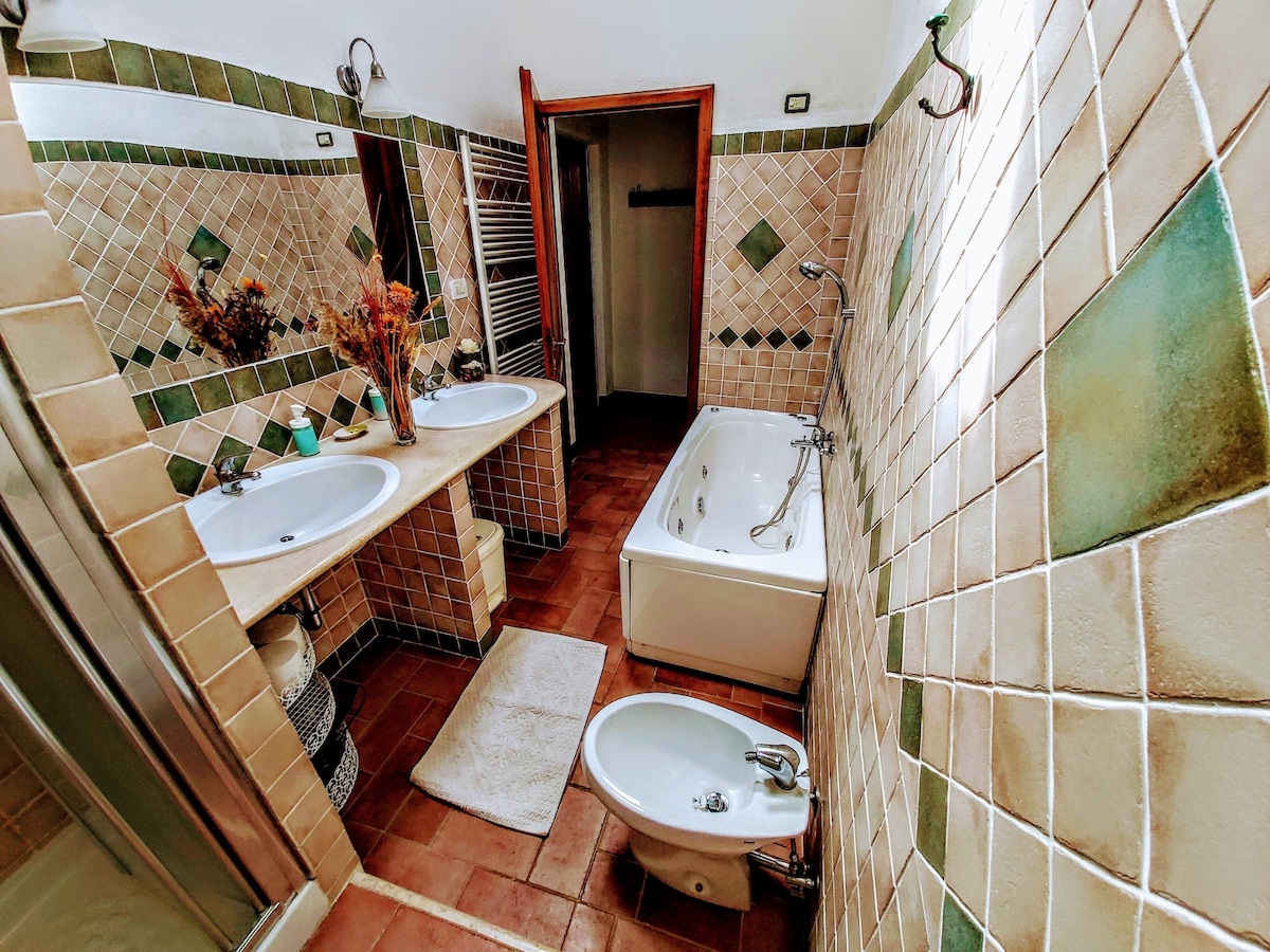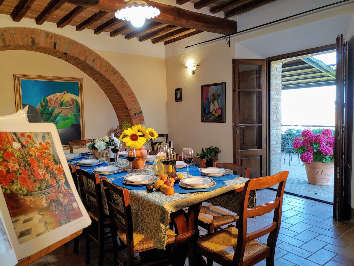 The villa has 4 beautiful double beds and one bedroom with 2 beds. On the first floor there are 3 double bedrooms and 2 bathrooms, one with hydro and shower. Two bedrooms, one double and one bedroom with 2 single beds are on the ground floor, there are 2 bathrooms on the ground floor. We rent the entire property. The spacious bedrooms have been decorated in elegant colours. On the ground floor there is a large living room of about 60 square meters with 3 sofas and a large table, there is a large 75-inch satellite TV, a stereo radio and a bluetooth speaker for your relaxation. Next door is the dining room about 30 square meters with a fantastic traditional fireplace, the dining room leads to the pergola equipped with 2 sofas and a large table for dining and you can admire the breathtaking views of the rolling Tuscan hills all around and hear the sound of silence.