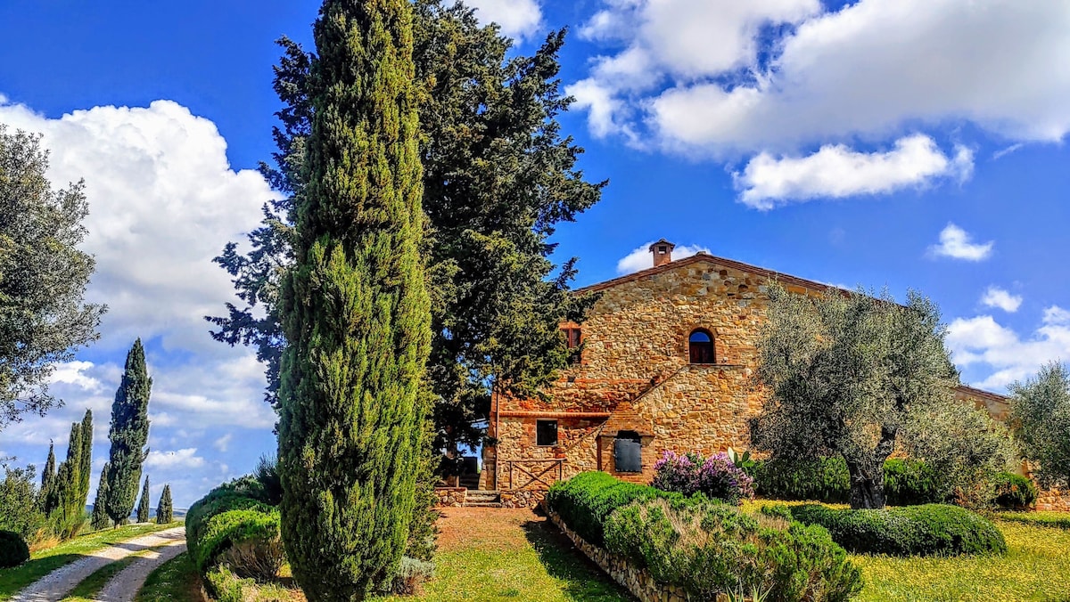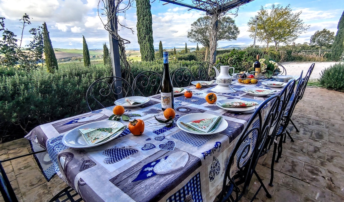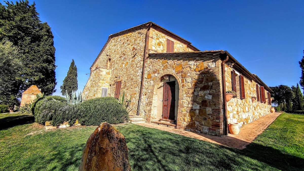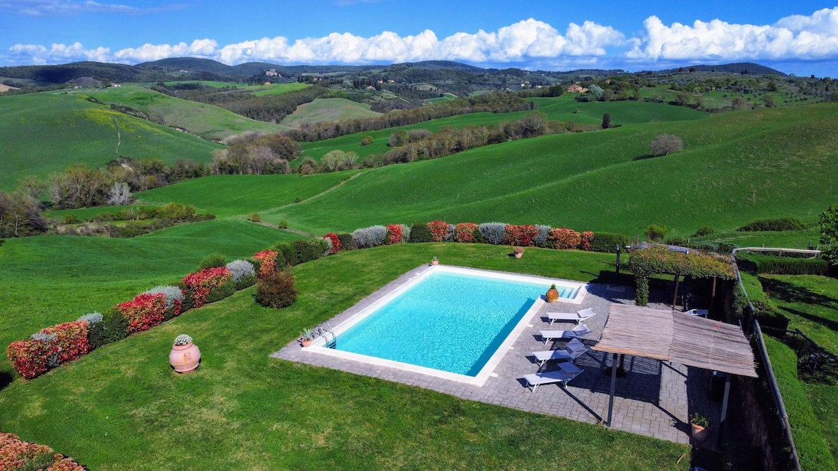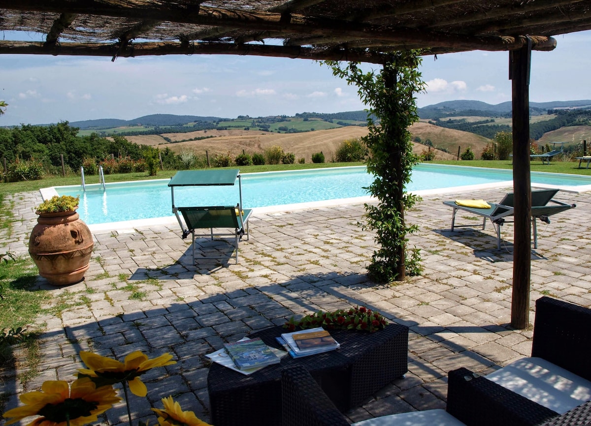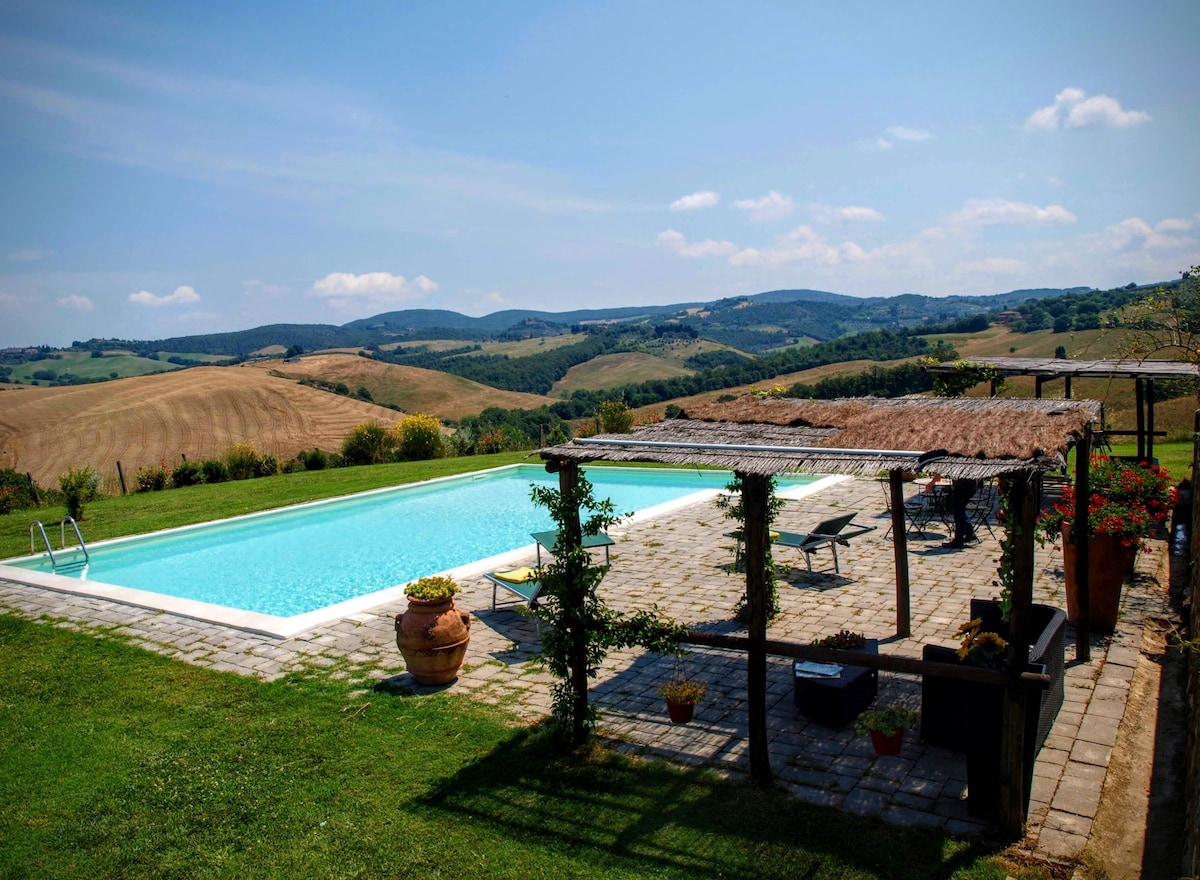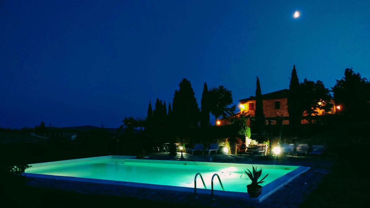 The villa has 4 beautiful double beds and one bedroom with 2 beds. On the first floor there are 3 double bedrooms and 2 bathrooms, one with hydro and shower. Two bedrooms, one double and one bedroom with 2 single beds are on the ground floor, there are 2 bathrooms on the ground floor. We rent the entire property. The spacious bedrooms have been decorated in elegant colours. On the ground floor there is a large living room of about 60 square meters with 3 sofas and a large table, there is a large 75-inch satellite TV, a stereo radio and a bluetooth speaker for your relaxation. Next door is the dining room about 30 square meters with a fantastic traditional fireplace, the dining room leads to the pergola equipped with 2 sofas and a large table for dining and you can admire the breathtaking views of the rolling Tuscan hills all around and hear the sound of silence.